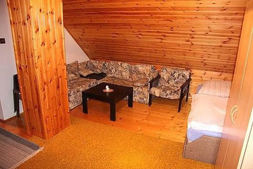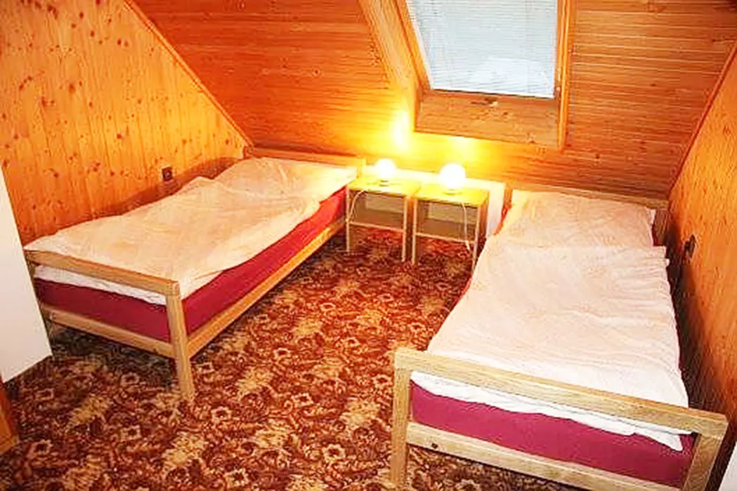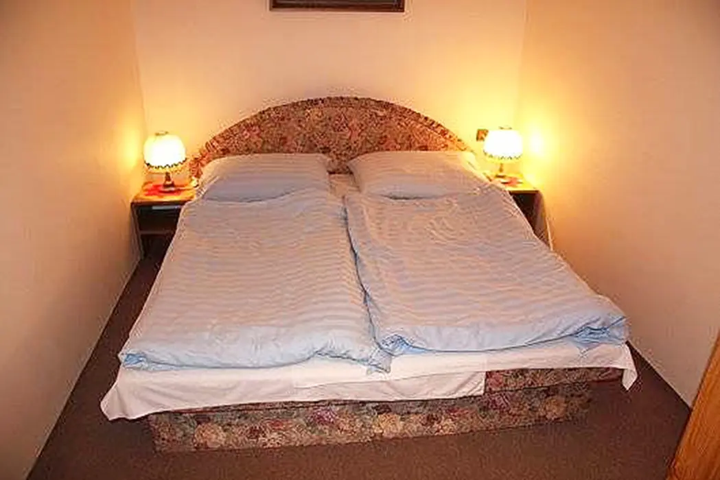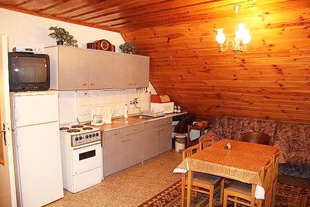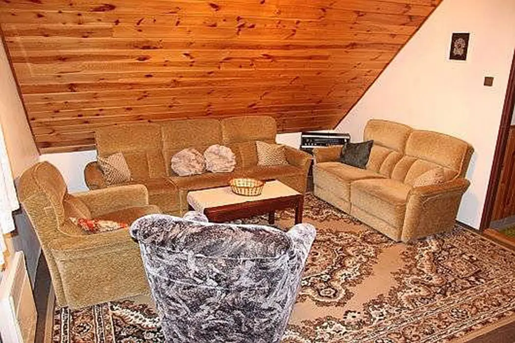 2x obývací pokoj s posezením vždy pro 15 osob, BTV, SAT. 4 ložnice - v přízemí 1x2 + 1 přistýlka, v patře 2x3 lůžka a 1x2 lůžka + 2 přistýlky, přistýlky jsou dlouhé 170 cm. Samostatná kuchyně s posezením, dále kuchyňský kout s posezením spojený s obývacím pokojem. Obě kuchyně - el. sporák, nádobí, lednice, překapávač, mikrovlnka. 2x WC, 2x koupelna s vanou, se sprchou. Topení elektrické přímotopy