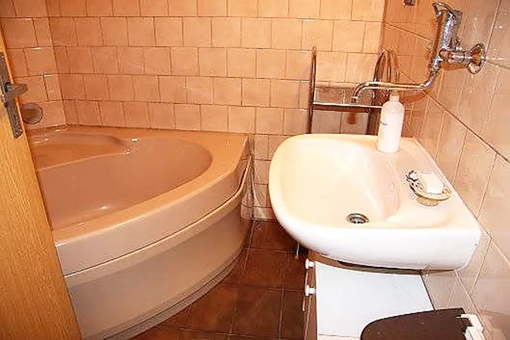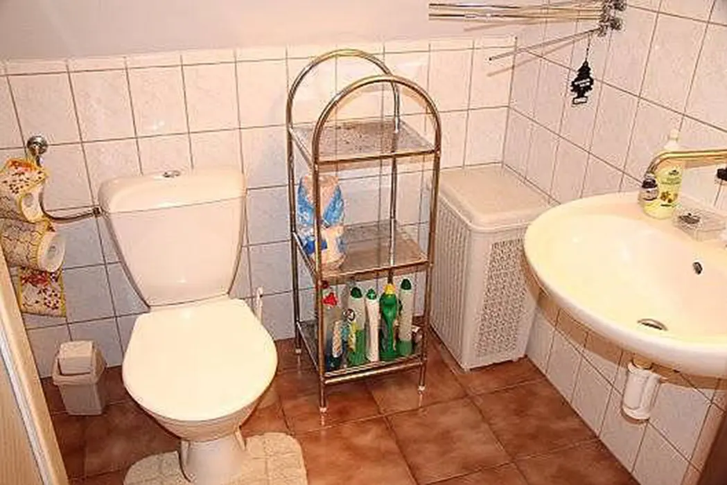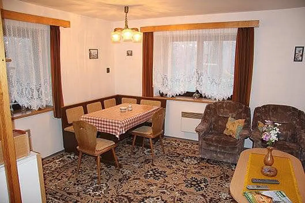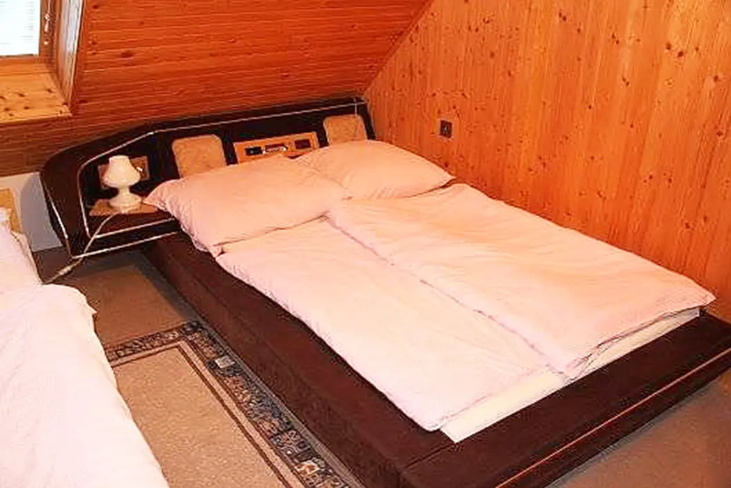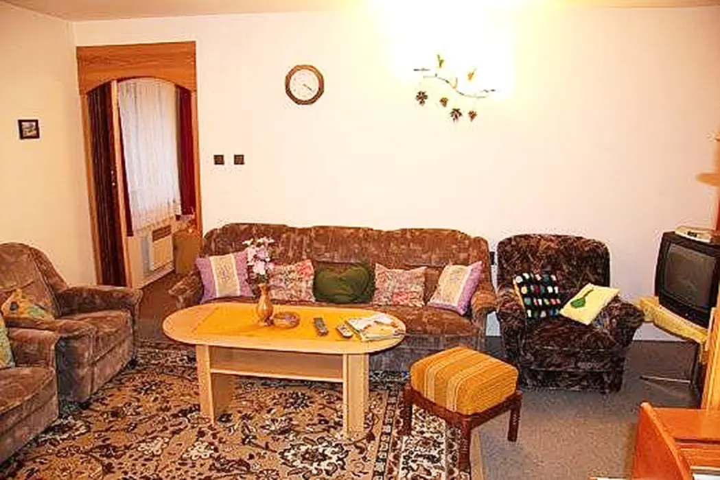 2x obývací pokoj s posezením vždy pro 15 osob, BTV, SAT. 4 ložnice - v přízemí 1x2 + 1 přistýlka, v patře 2x3 lůžka a 1x2 lůžka + 2 přistýlky, přistýlky jsou dlouhé 170 cm. Samostatná kuchyně s posezením, dále kuchyňský kout s posezením spojený s obývacím pokojem. Obě kuchyně - el. sporák, nádobí, lednice, překapávač, mikrovlnka. 2x WC, 2x koupelna s vanou, se sprchou. Topení elektrické přímotopy