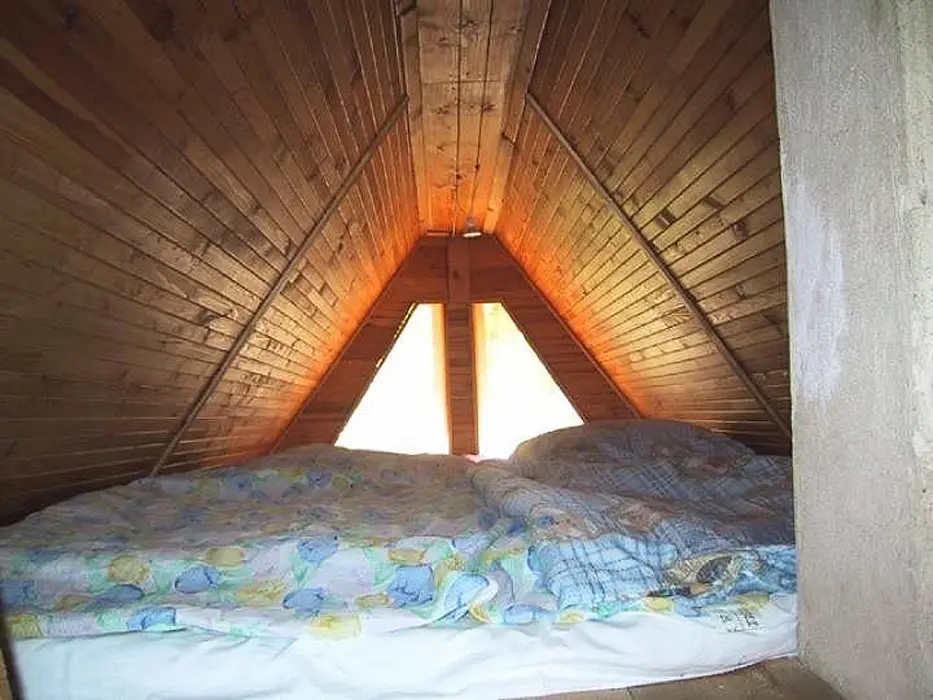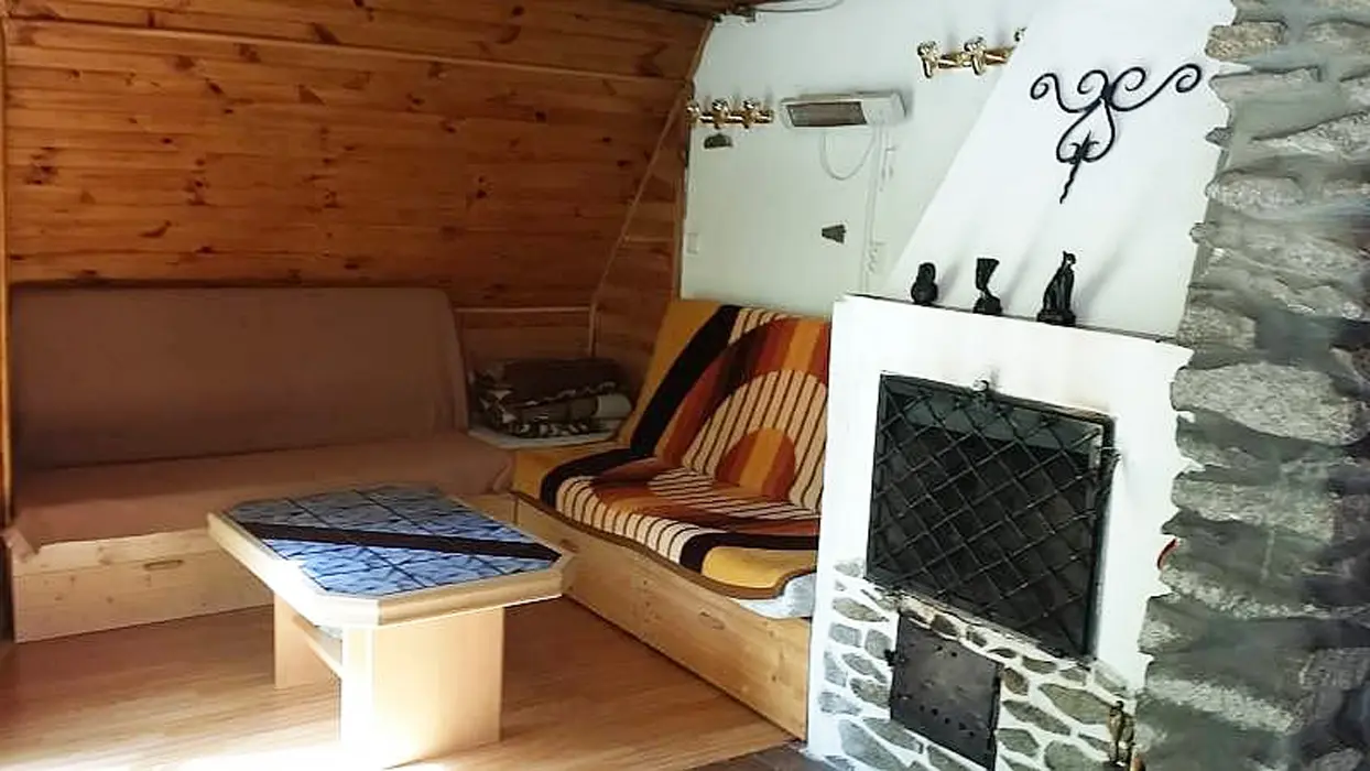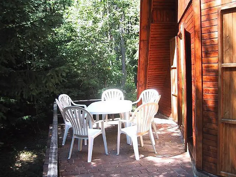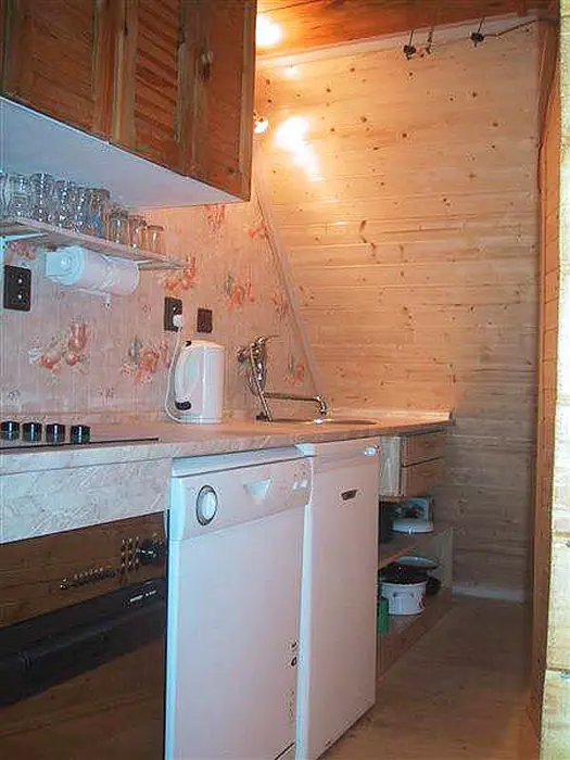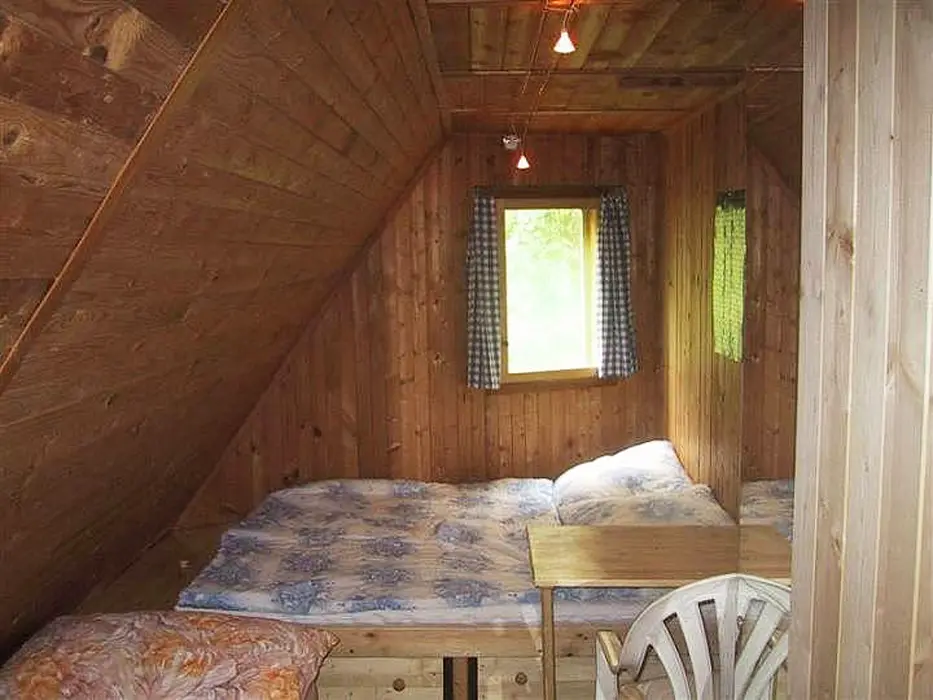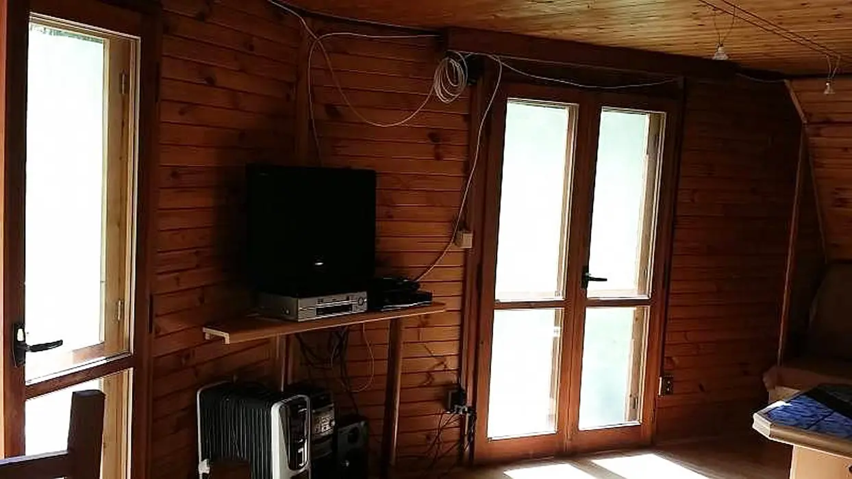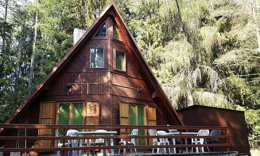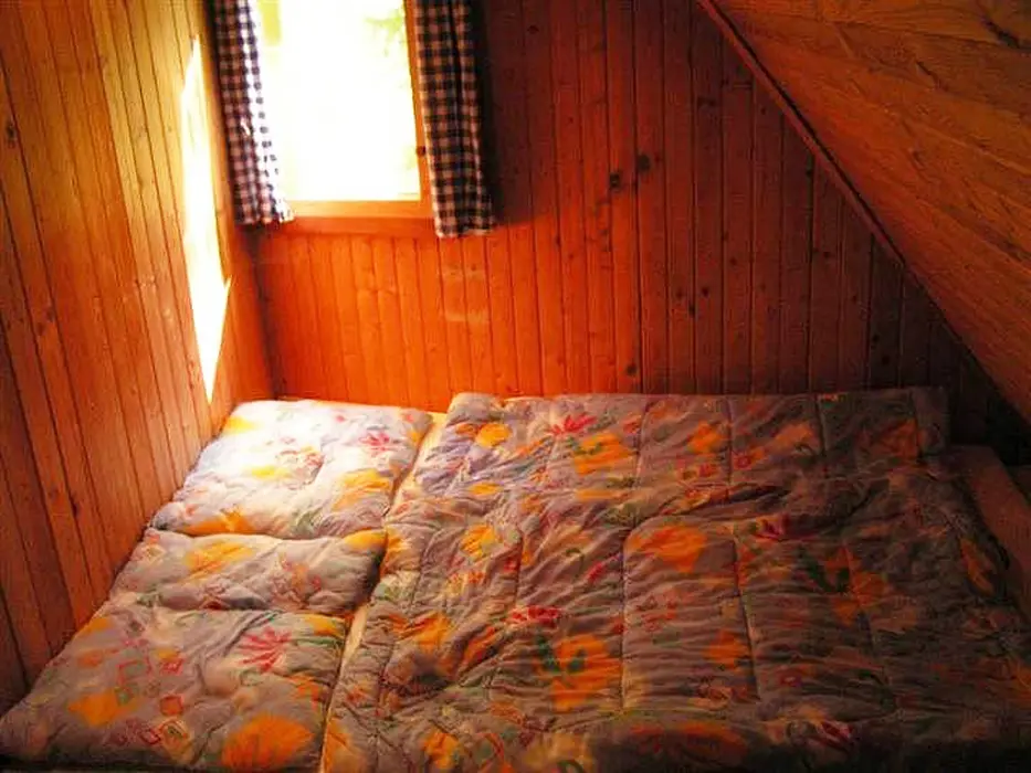 Obývací pokoj - rozkládací sedačka, krb, TV, SAT. Kuchyně - el.sporák s grilem, sklokeramická varná deska, myčka nádobí, lednice s mrazákem, mikrovlnná trouba, varná konvice, el.bojler, vlastní studna - pitná voda. 3 ložnice - 1x2, 1x3, ložní plocha ve vystavěné špičce chaty pro 2 dospělé nebo 3-4 děti. Sociální zařízení - 1x koupelna s WC a sprchovým koutem, pračka, sušička. Topení - krb, el. přenosné olejové radiátory, el. podlahové topení v koupelně.