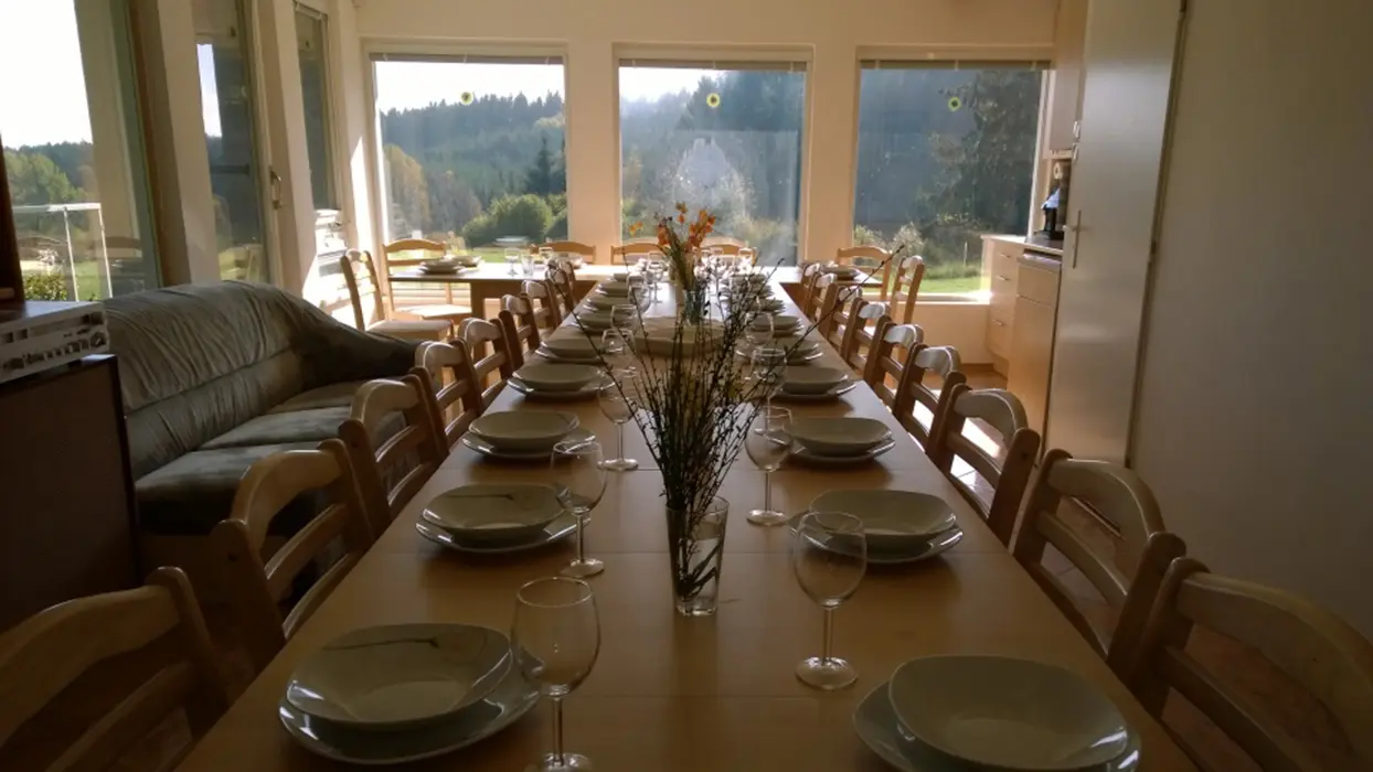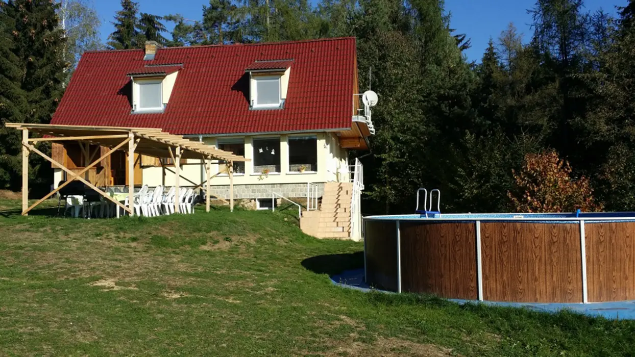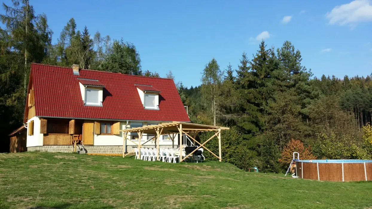 Ohniště, zahradní nábytek, 2 ha louka, stolní tenis, solárně vyhřívaný bazén, párty stan 5x8 m