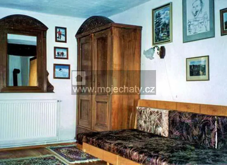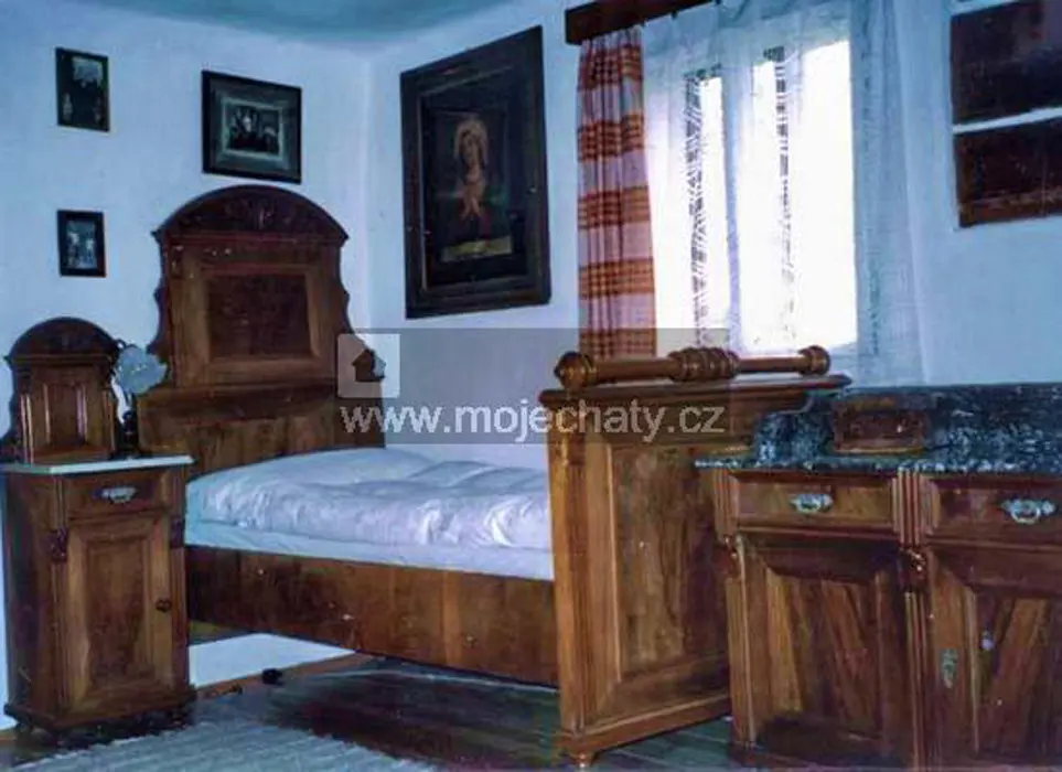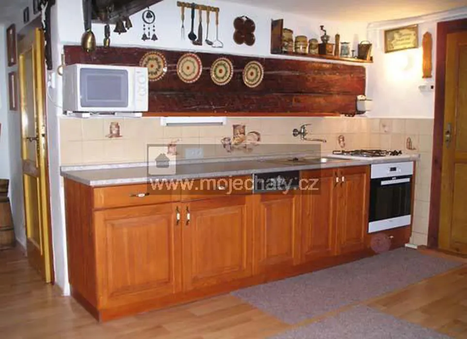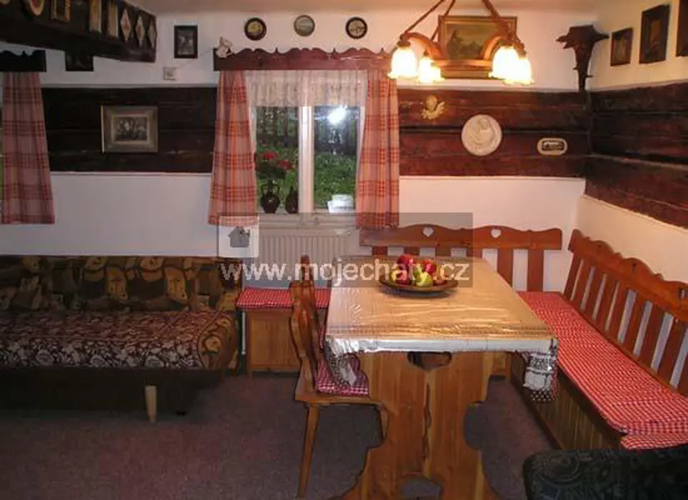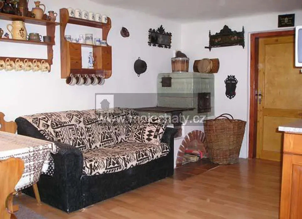 Obytná stylová světnice spojená s kuchyní - jídelní stůl a židle, kachlová kamna, sedačka - možnost 1-2 přistýlek, vybavení kuchyně - plyn. sporák, varná konvice, překapávač, mikrovlnka, myčka na nádobí, lednice, základní nádobí, TV, SAT. 2 ložnice - 1x2, 1x4 lůžka. Soc. zařízení - koupelna se sprchou + WC. Topení - centrální plynové nebo krbová kamna