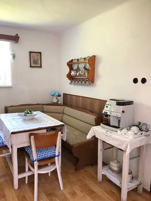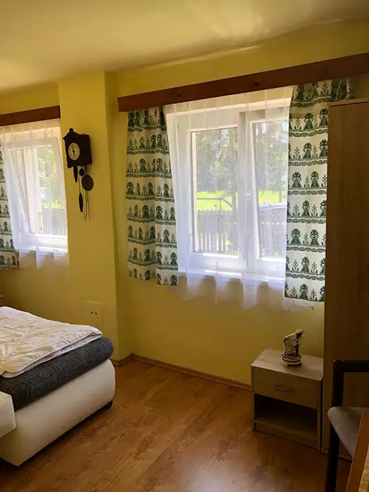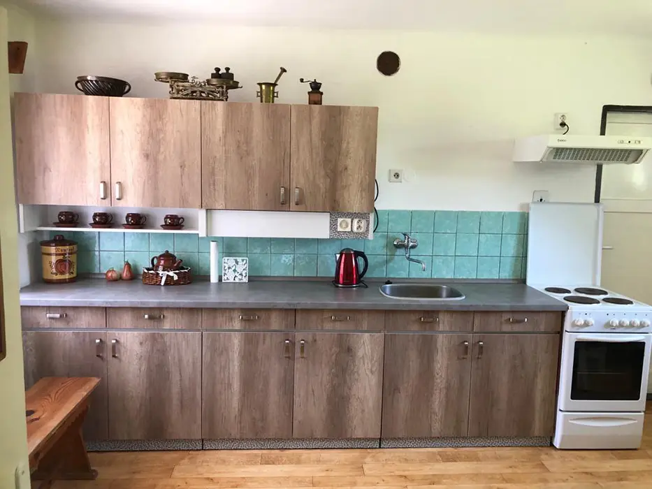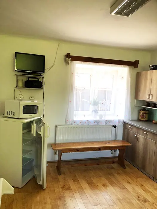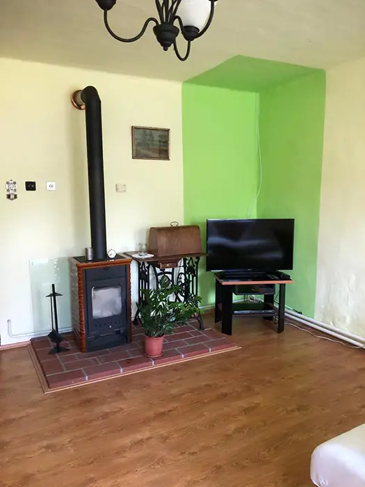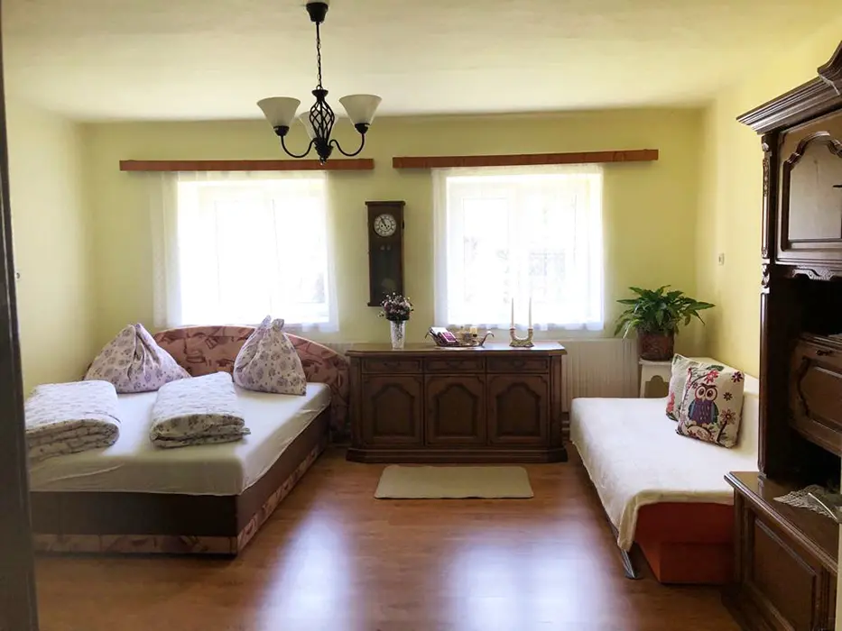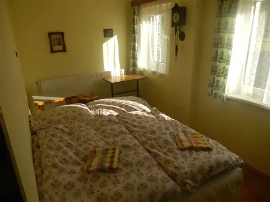 Obývací pokoj s posezením, TV, kuchyňský kout - el. sporák, lednice, varná konvice, mikrovlnka, nádobí, jídelní stůl a židle. 2 ložnice - 2x2 lůžka. Sociální zařízení - sprchový kout, sprcha, teplá voda, WC v koupelně. Topení - tuhá paliva