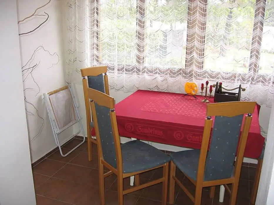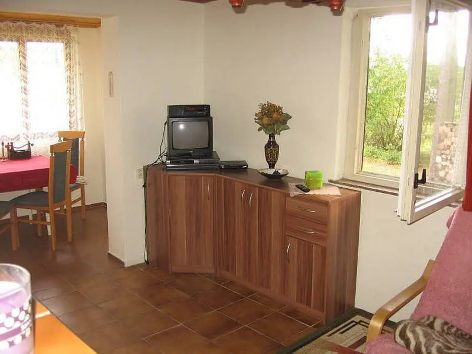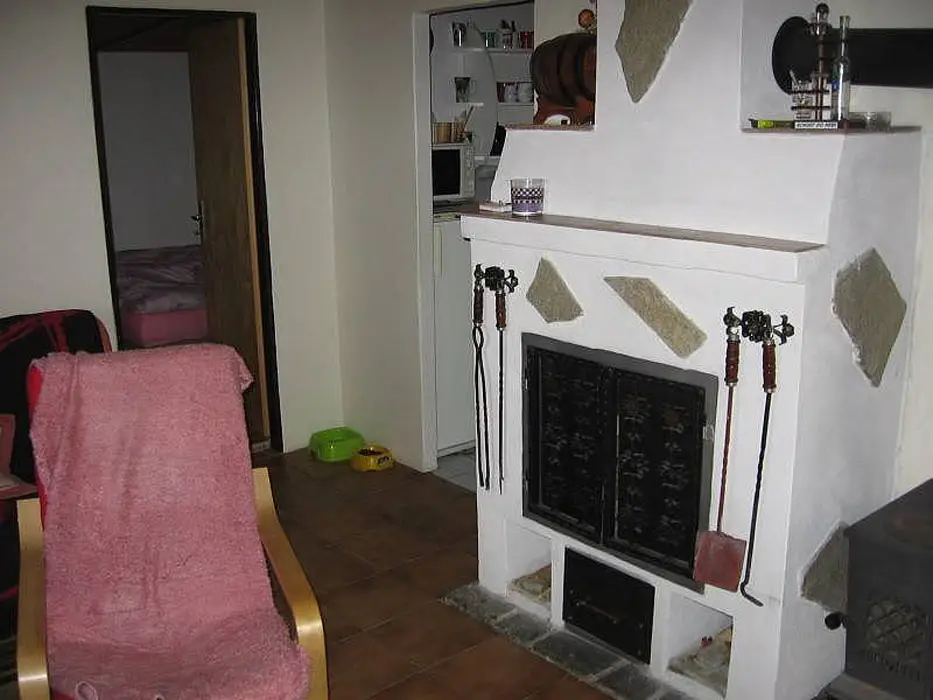 Obývací pokoj s posezením, TV. Kuchyně - kombinovaný sporák, lednice, varná konvice, mikrovlnka, jídelní stůl a židle. 2 ložnice - v přízemí 1x2, v patře 1x2 lůžka. Sociální zařízení - sprchový kout, WC. Topení - tuhá paliva