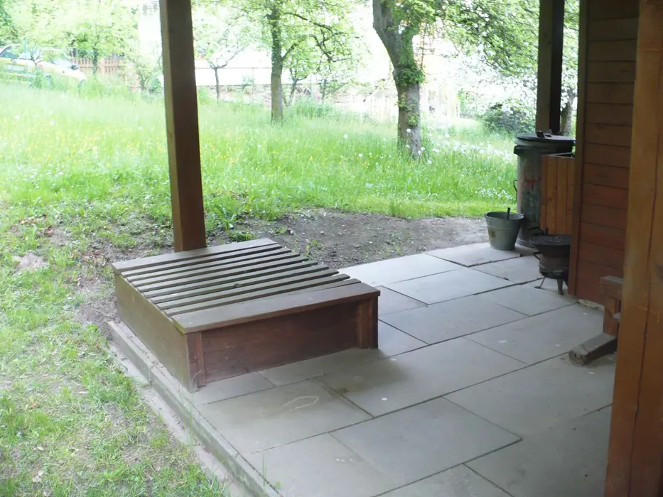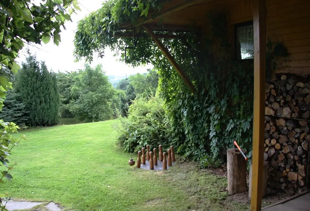 Na oploceném pozemku je posezení, zahradní nábytek, venkovní terasa, přenosný gril, ohniště, ruské kuželky, pískoviště a houpačka pro děti