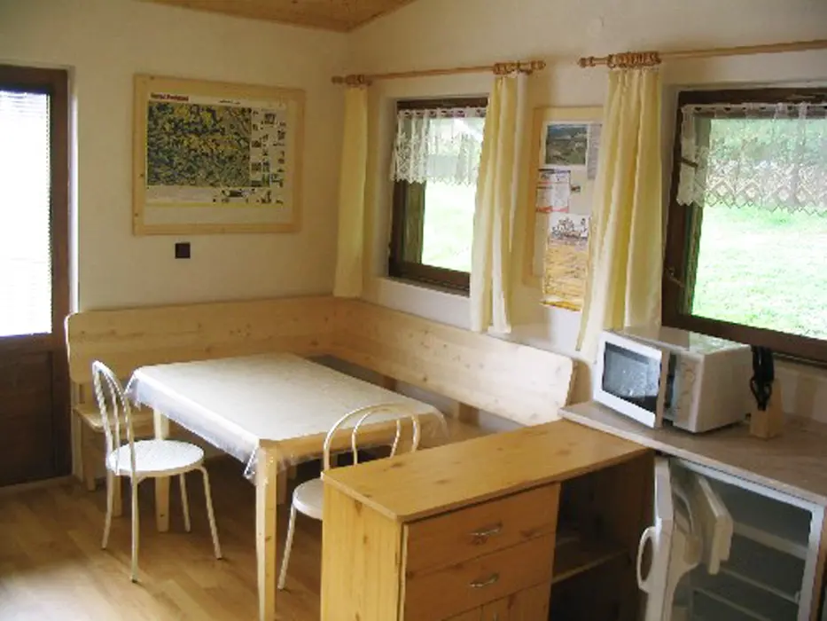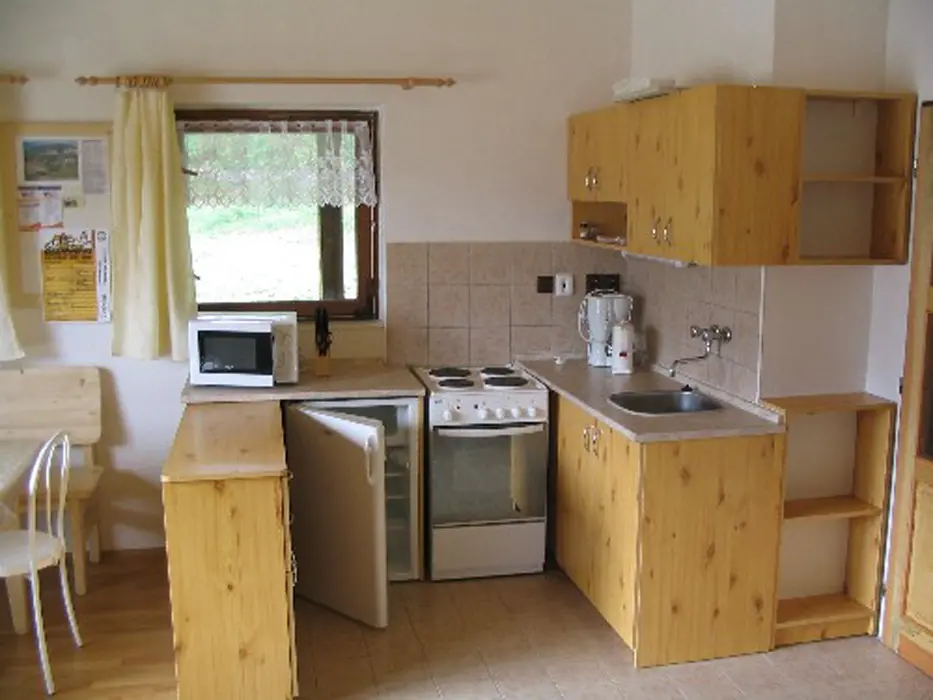 Obytná jídelna s kuchyňskou linkou a posezením, krbová kamna, rádio s CD. Kuchyňka – el. sporák, lednice, mikrovlnka, kávovar, varná konvice, základní nádobí. 2 ložnice: 1x2 lůžková a 1x3 lůžková. Sprchový kout, WC. Topení teplovzdušné