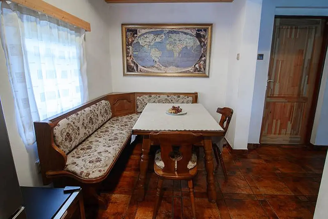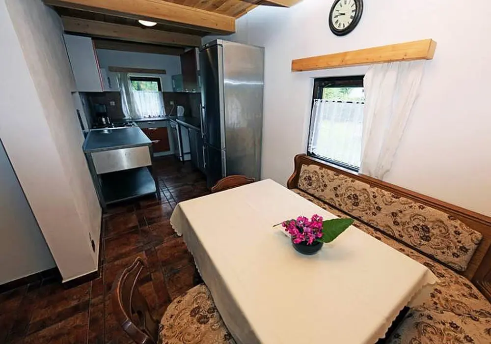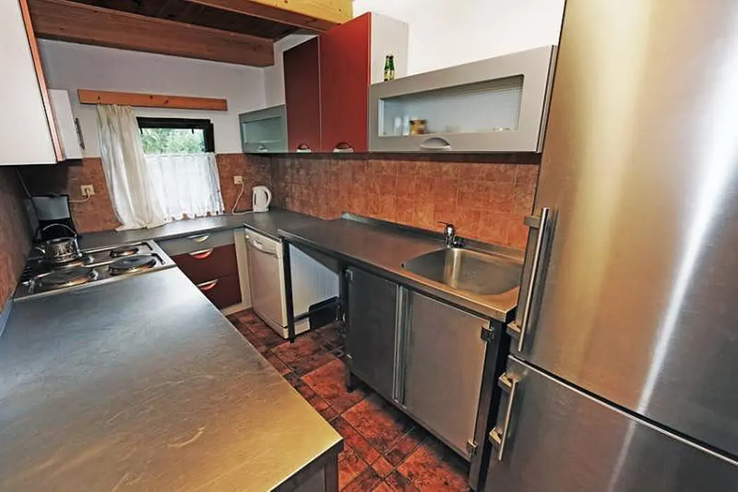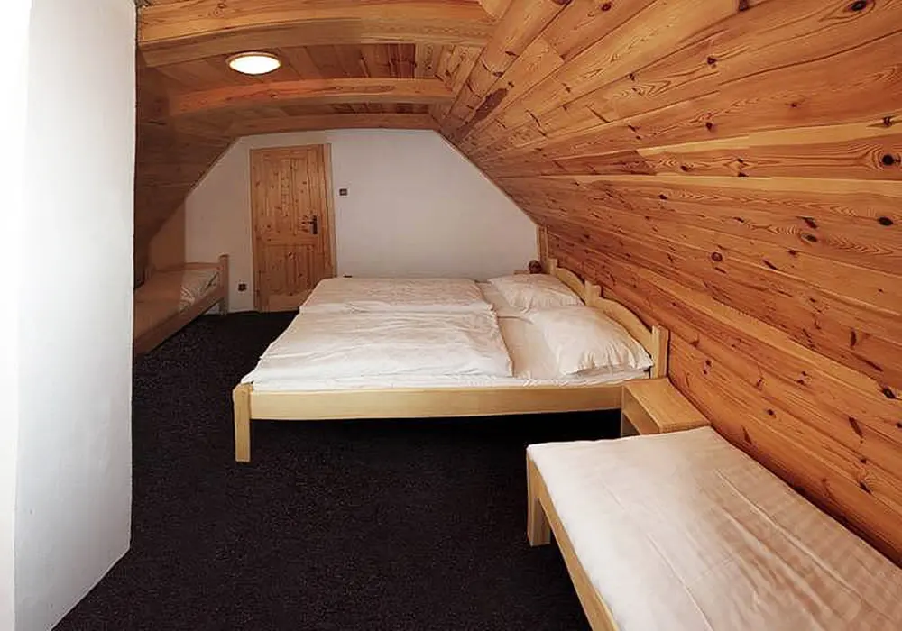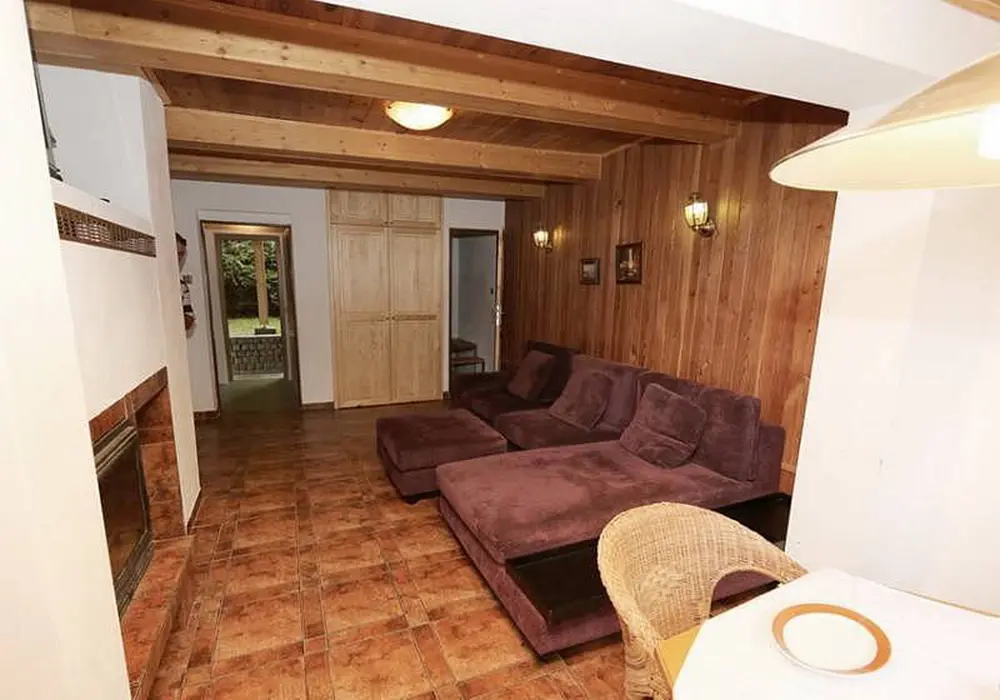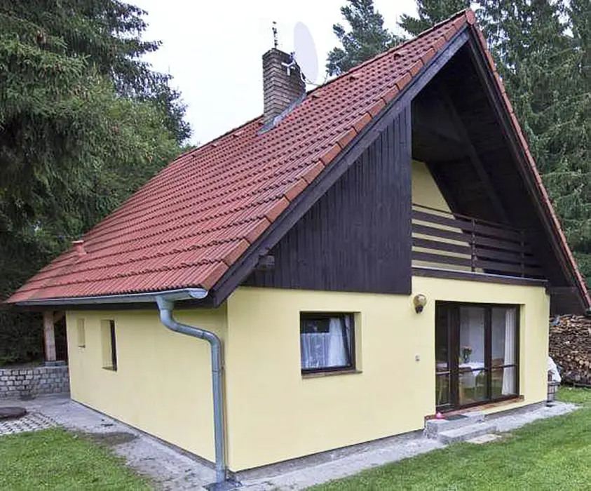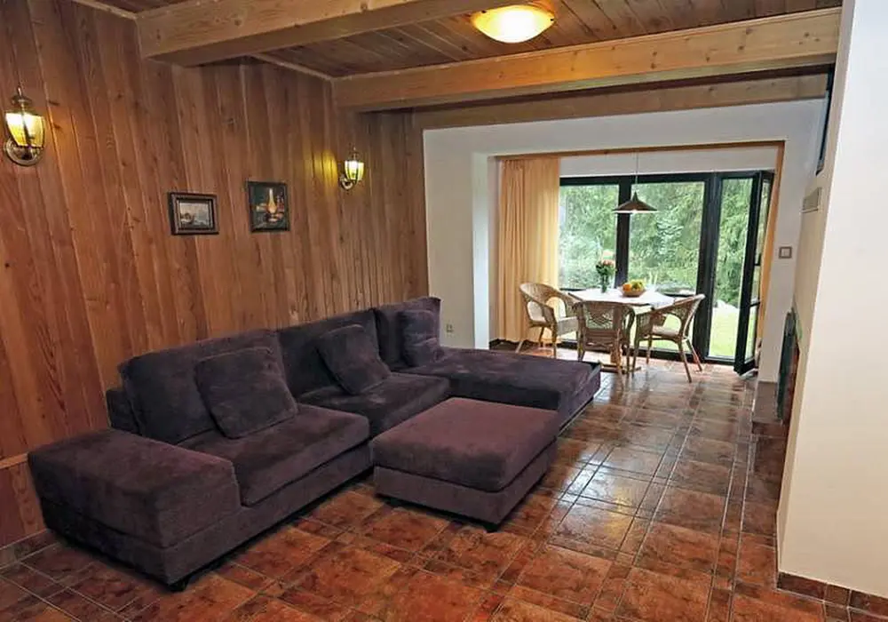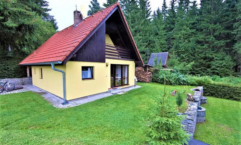 V přízemí - obývací pokoj, krb, sedací souprava, LCD, TV. Kuchyně - plně vybavená, myčka nádobí, lednice, el.sporák, varná konvice, jídelní kout s rohovou lavicí. 3 ložnice 1x4, 2x2 lůžka. Sociální zařízení - masážní sprchový kout, dvouumyvadlo, závěsné WC, další WC s umyvadlem. Topení - plynové, elektřinou nebo krbem - krbová vložka