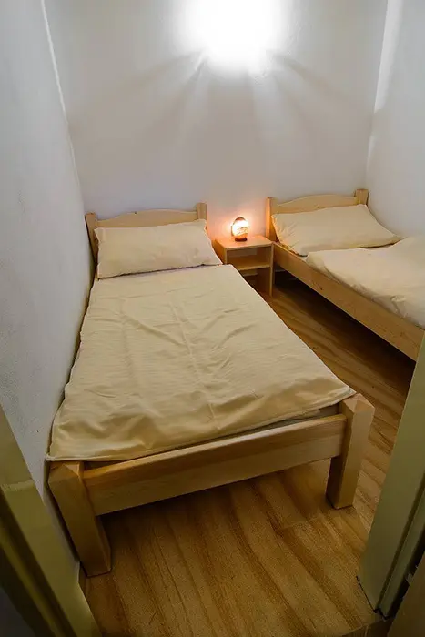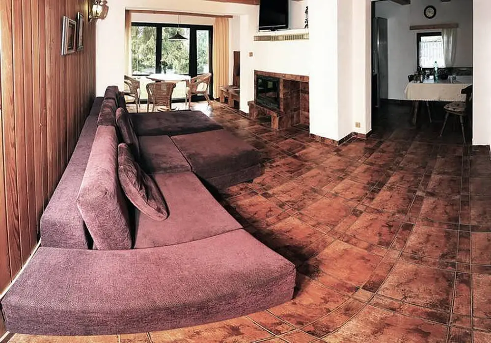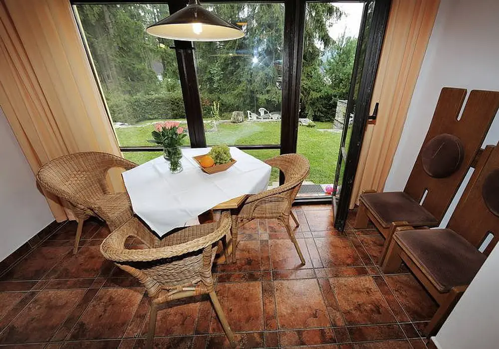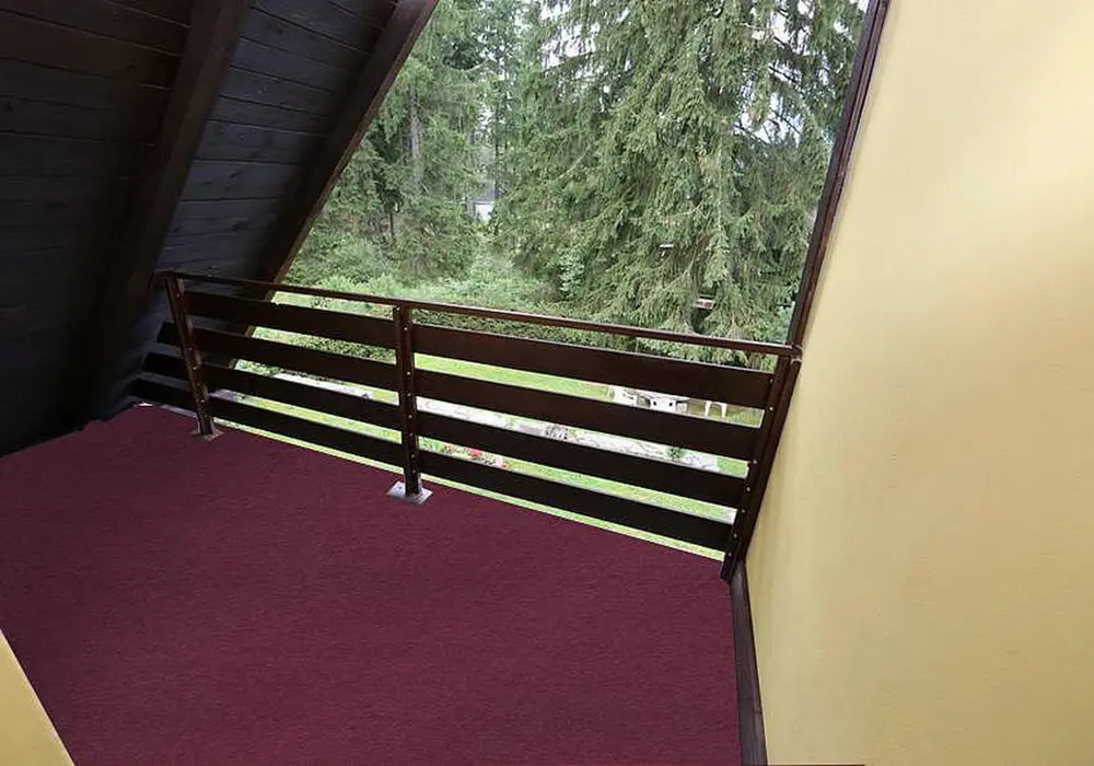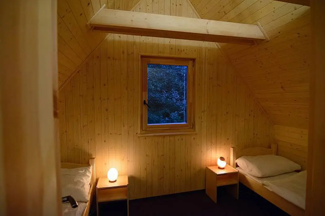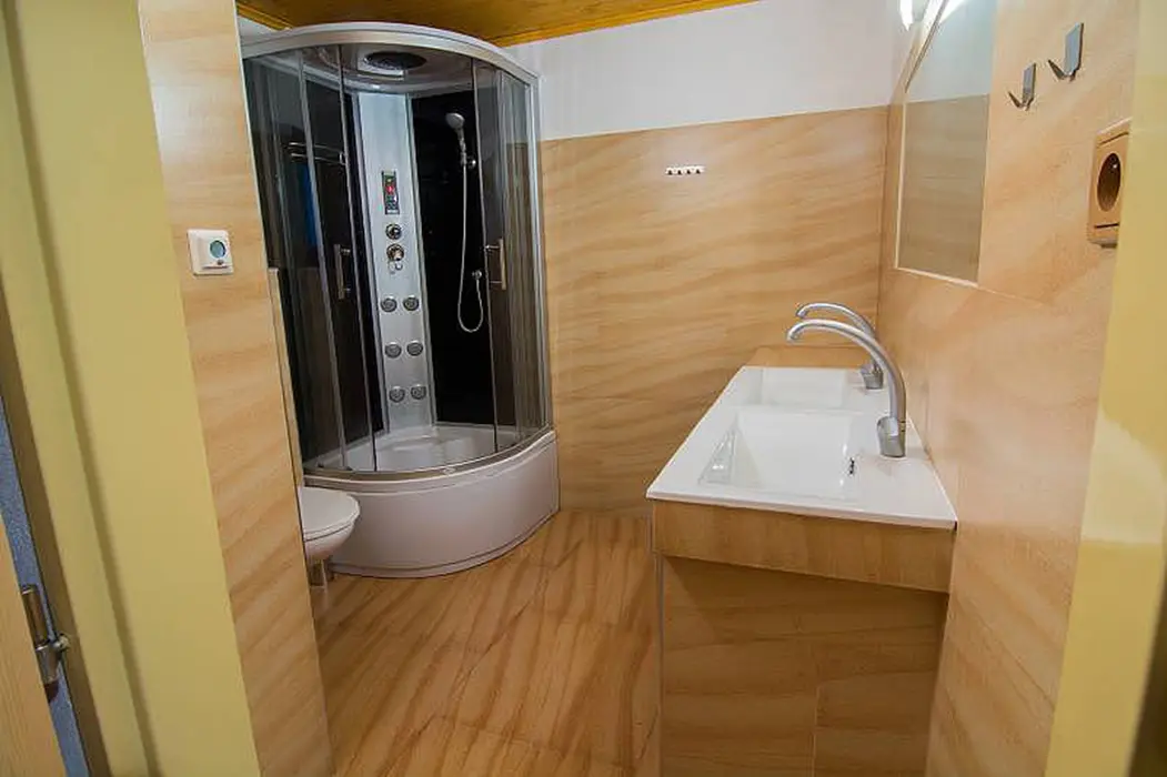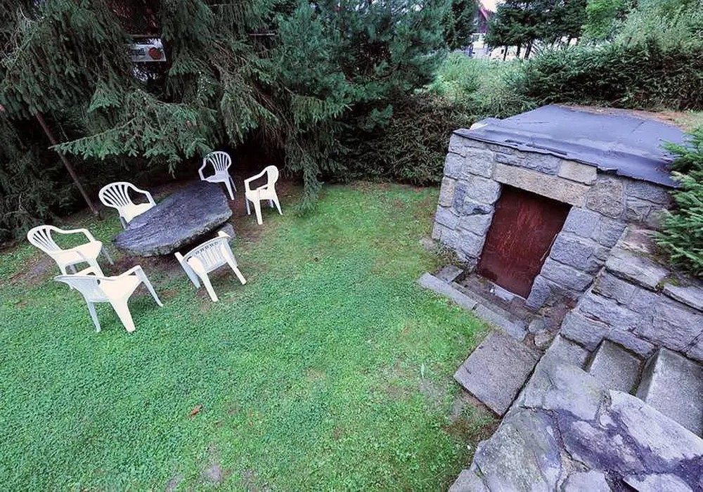 V přízemí - obývací pokoj, krb, sedací souprava, LCD, TV. Kuchyně - plně vybavená, myčka nádobí, lednice, el.sporák, varná konvice, jídelní kout s rohovou lavicí. 3 ložnice 1x4, 2x2 lůžka. Sociální zařízení - masážní sprchový kout, dvouumyvadlo, závěsné WC, další WC s umyvadlem. Topení - plynové, elektřinou nebo krbem - krbová vložka