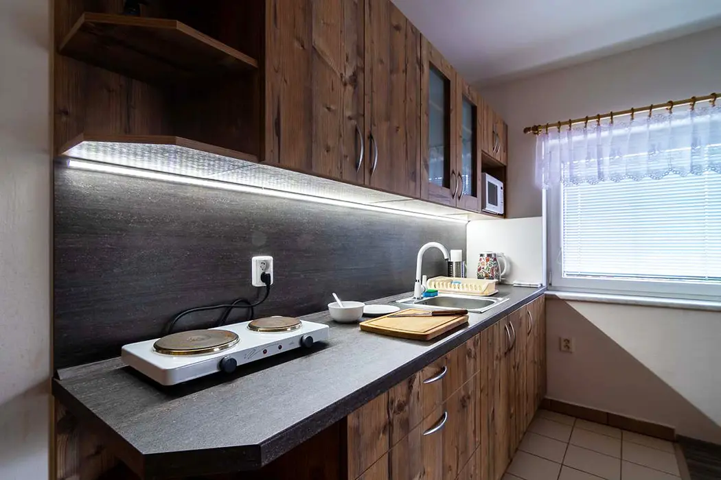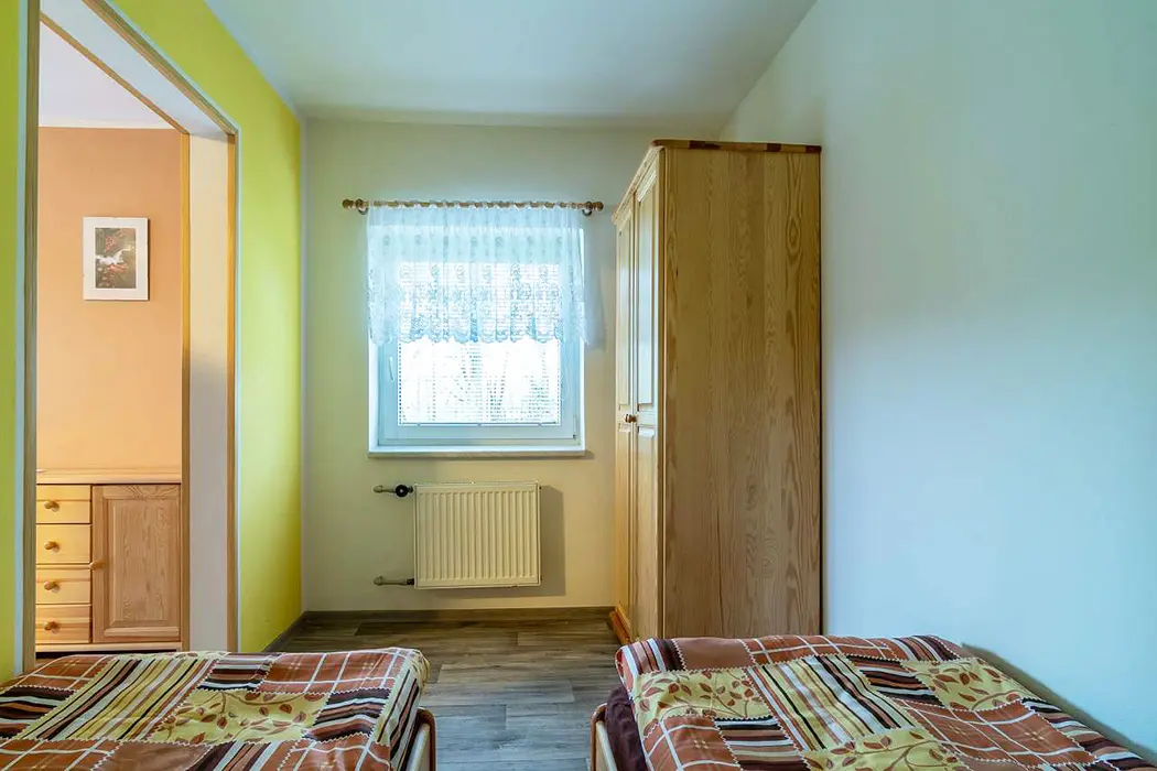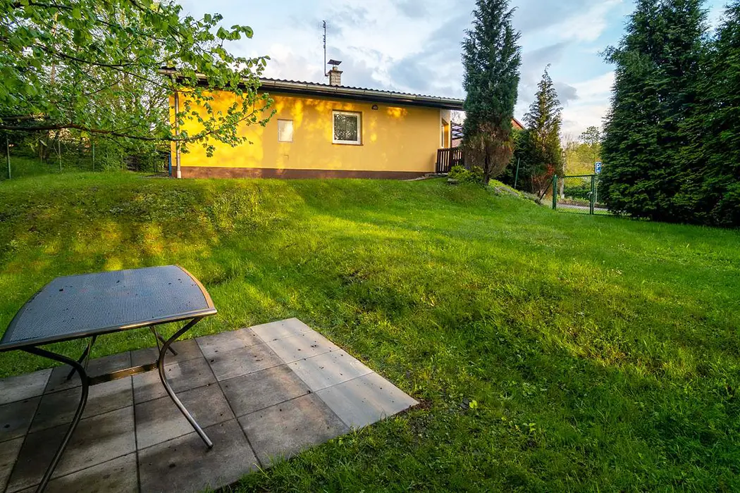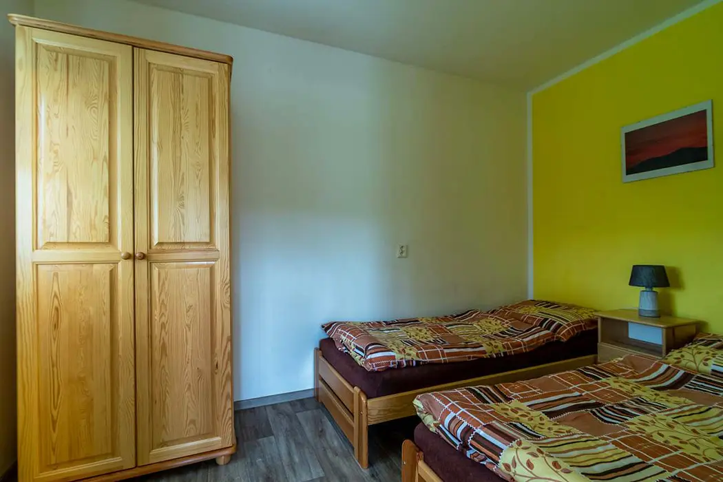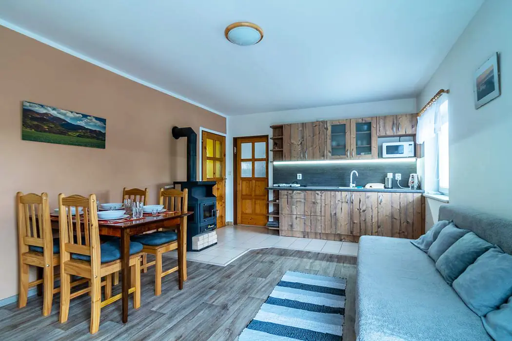 Obývací pokoj s posezením - rozkládací sedačka ( 2 přistýlky ), krbová kamna, TV, navazuje kuchyńský kout - el. vařič, lednice, varná konvice, mikrovlnná trouba, jídelní stůl, židle. 1 ložnice - 1x2 lůžka. Sociální zařízení - prostorná koupelna s vanou, WC v koupelně. Topení - teplovodní radiátory s teplovodní krbovou vložkou