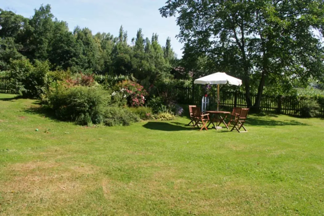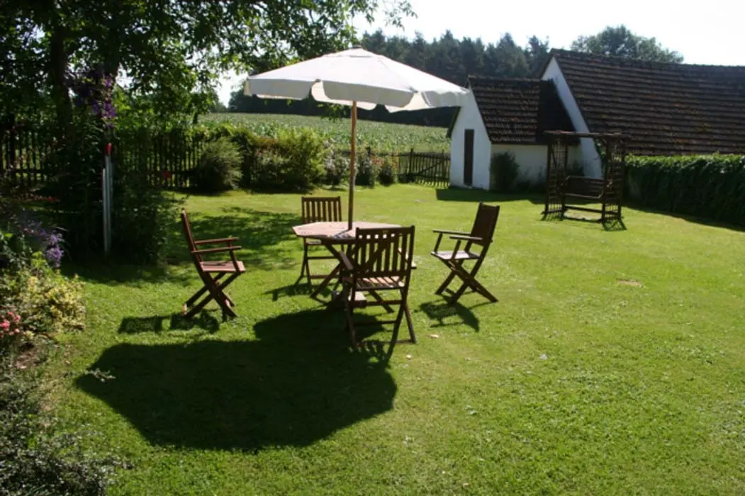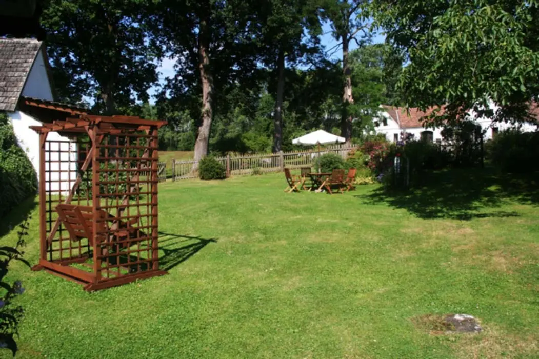Dřevěná veranda s křesílky a slunečníkem, dřevěná houpačka. Před chalupou je velká oplocená zahrada s kůlnou na dříví, gril, zahradní nábytek, slunečnik