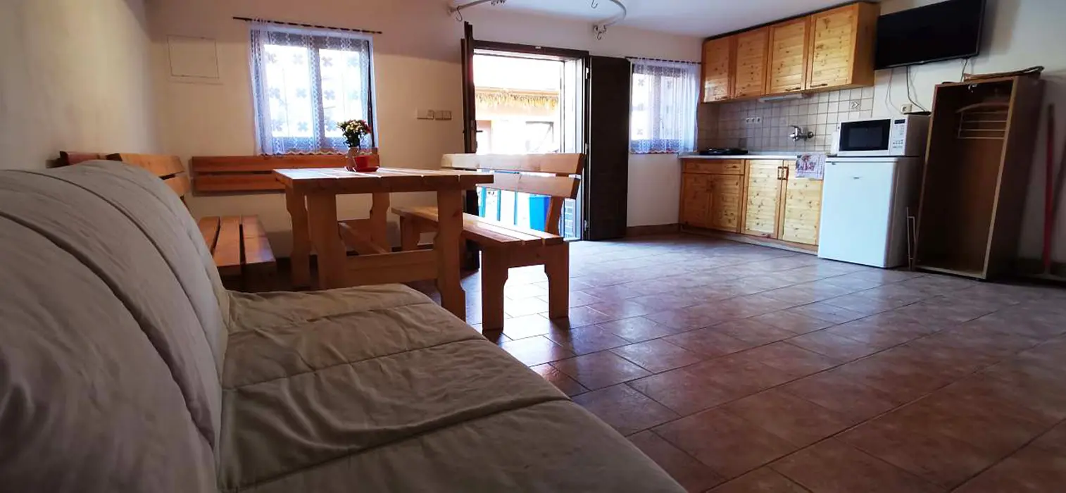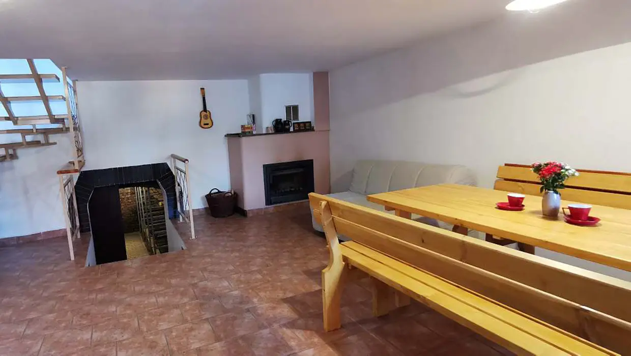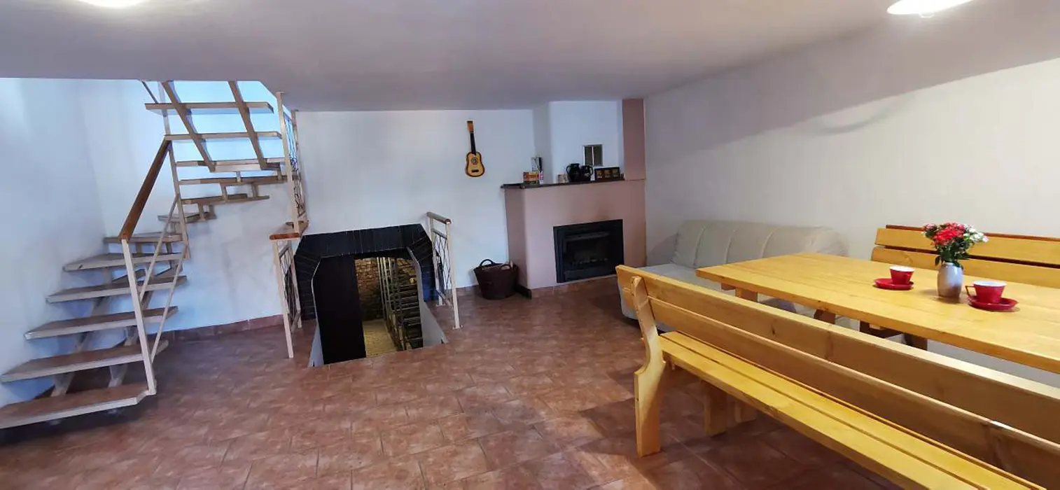V suterénu - vinný sklípek. V přízemí - velký stůl a lavice, sedačka, krb, kuchyňský kout - malá lednička, nádobí, el. vařič, varná konvice. V patře 2 ložnice - 1x2, 1x3 (maximálně pro 3 dospělé nebo pro 4 děti). Sociální zařízení - koupelna se sprchovým koutem, WC. Topení - krb s rozvodem teplého vzduchu do podkroví, v koupelně elektrický přímotop
