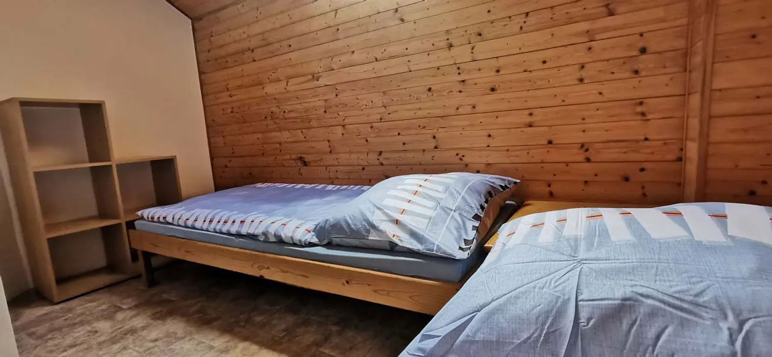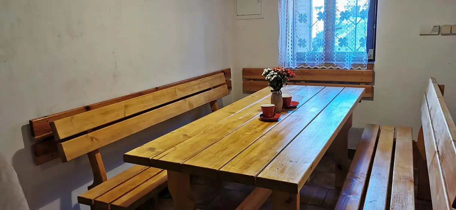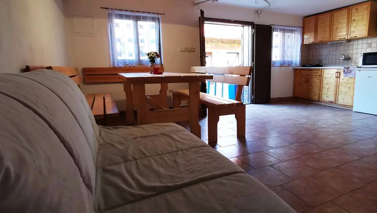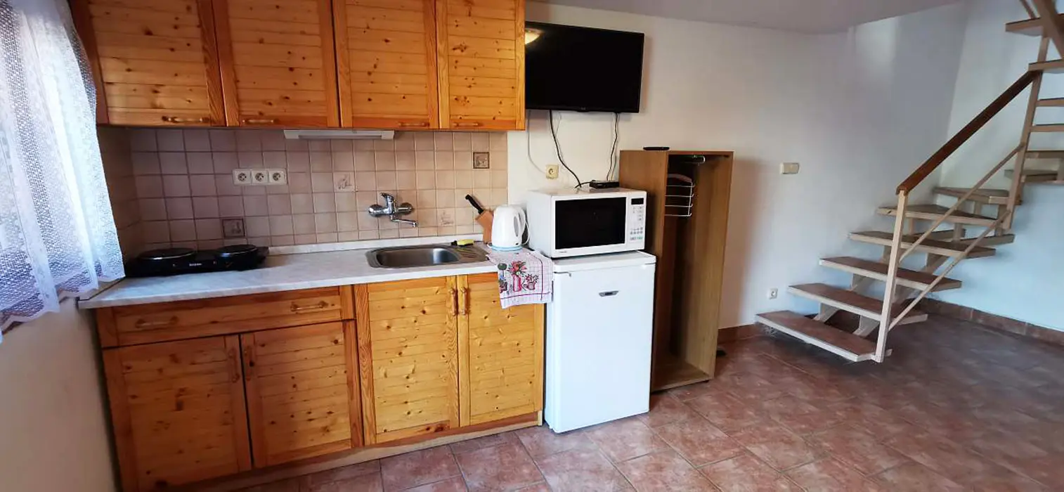 V suterénu - vinný sklípek. V přízemí - velký stůl a lavice, sedačka, krb, kuchyňský kout - malá lednička, nádobí, el. vařič, varná konvice. V patře 2 ložnice - 1x2, 1x3 (maximálně pro 3 dospělé nebo pro 4 děti). Sociální zařízení - koupelna se sprchovým koutem, WC. Topení - krb s rozvodem teplého vzduchu do podkroví, v koupelně elektrický přímotop