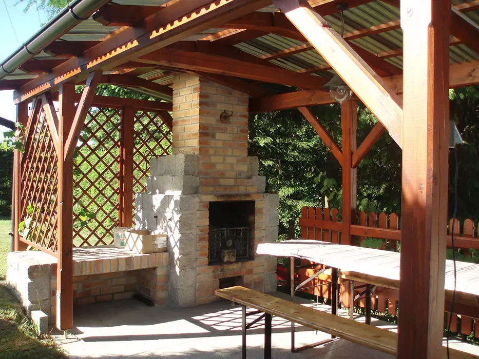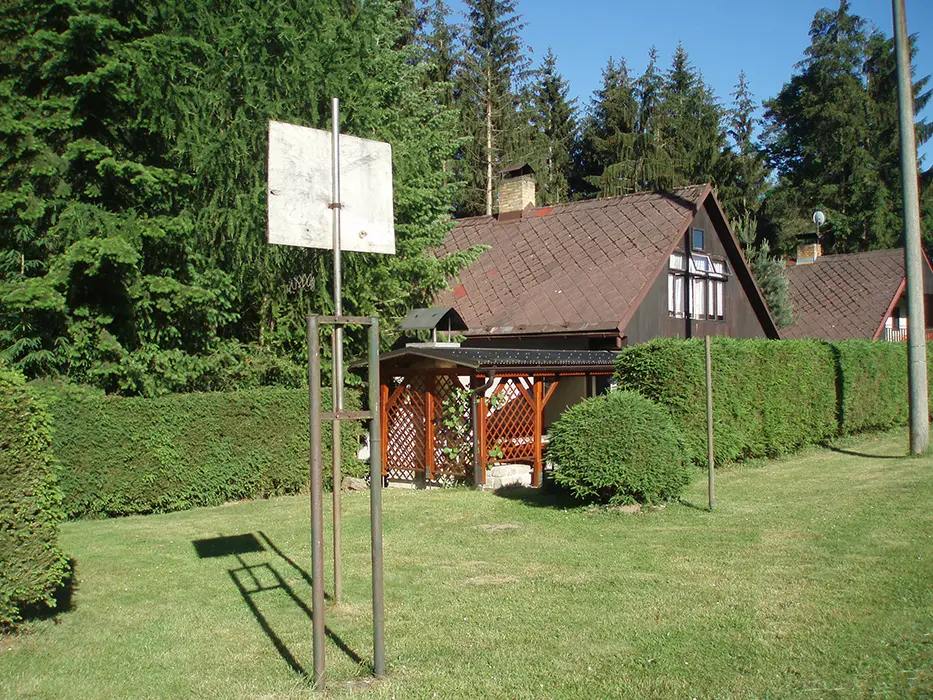 Venkovní krb, ohniště s posezením, udírna, menší hřiště na volejbal, koš na basketbal