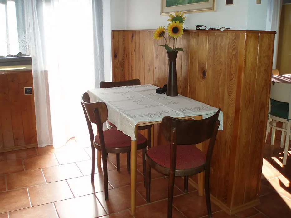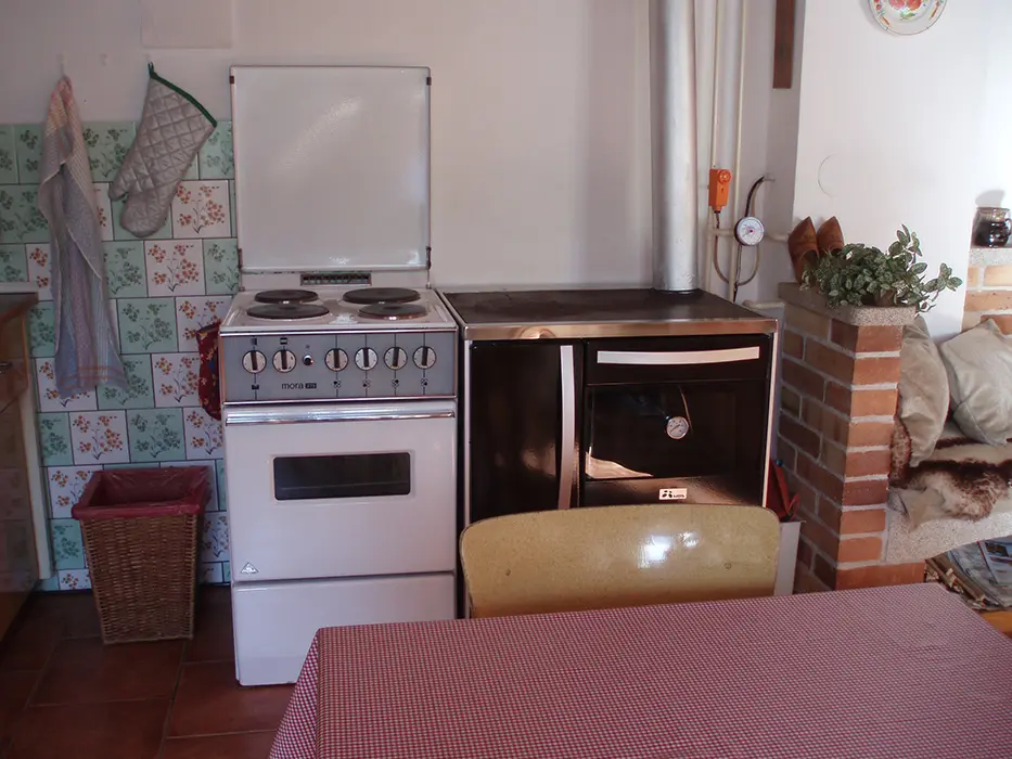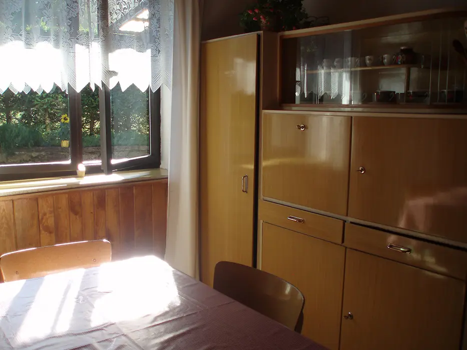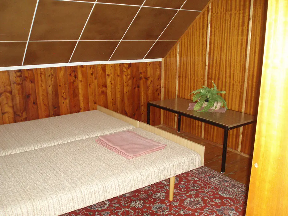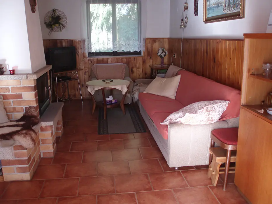 Obývácí pokoj s posezením, BTV, SAt, krb, je propojený s kuchyní. Kuchyně - el.sporák, sporák na tuhá paliva, základní nádobí, varná konvice, překapávač, lednice s mrazákem, mikrovlnka. V patře 3 ložnice 3x2 lůžka, 2 z nich jsou průchozí. Koupelna se sprchovým koutem, WC samostatné. Topení na tuhá paliva + vnitřní krb s vložkou