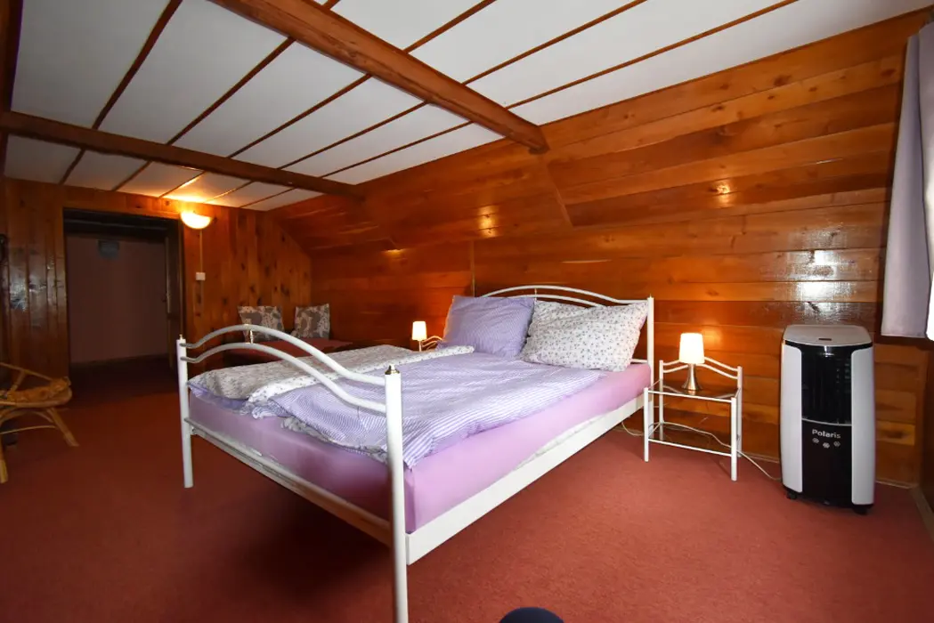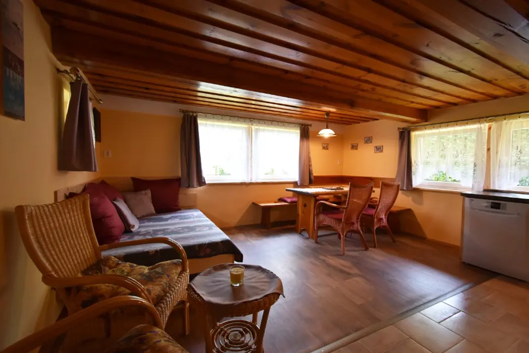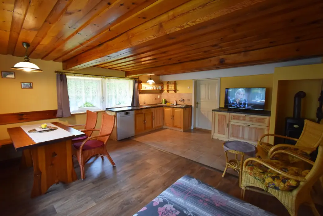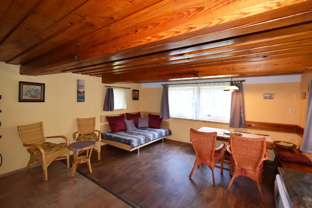 Obývací pokoj s posezením a krbová kamna, BTV. Kuchyňský kout - indukční varná deska, varná konvice překapávač, lednice, mikrovlnná trouba, myčka nádobí. V přízemí 1 ložnice 1x2, v patře ložnice 1x3 ( manželská postel + samostatné lůžko ) - tato má klimatizaci. Koupelna se sprchou, WC samostatné