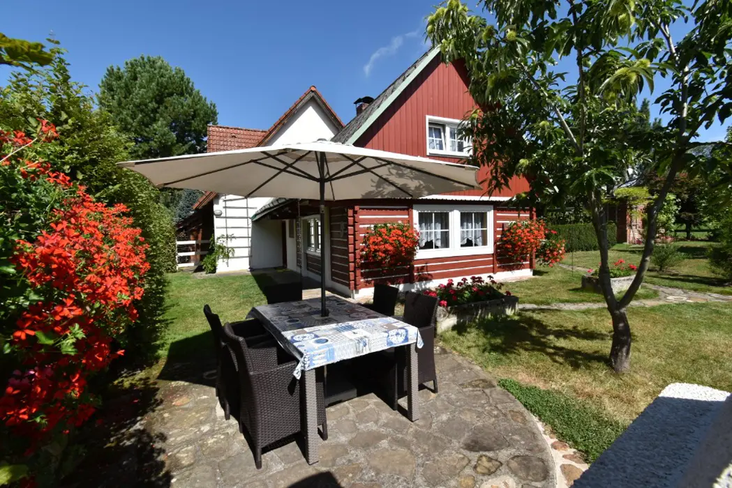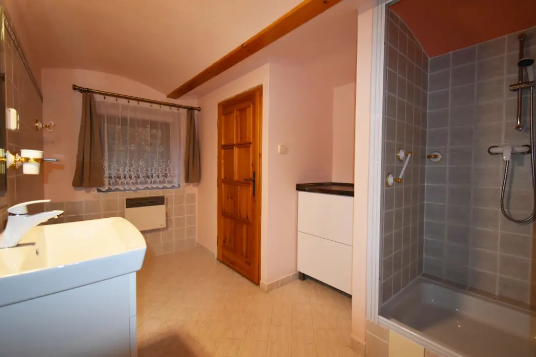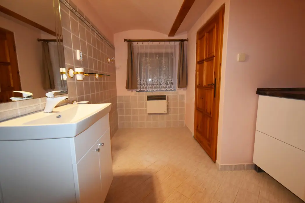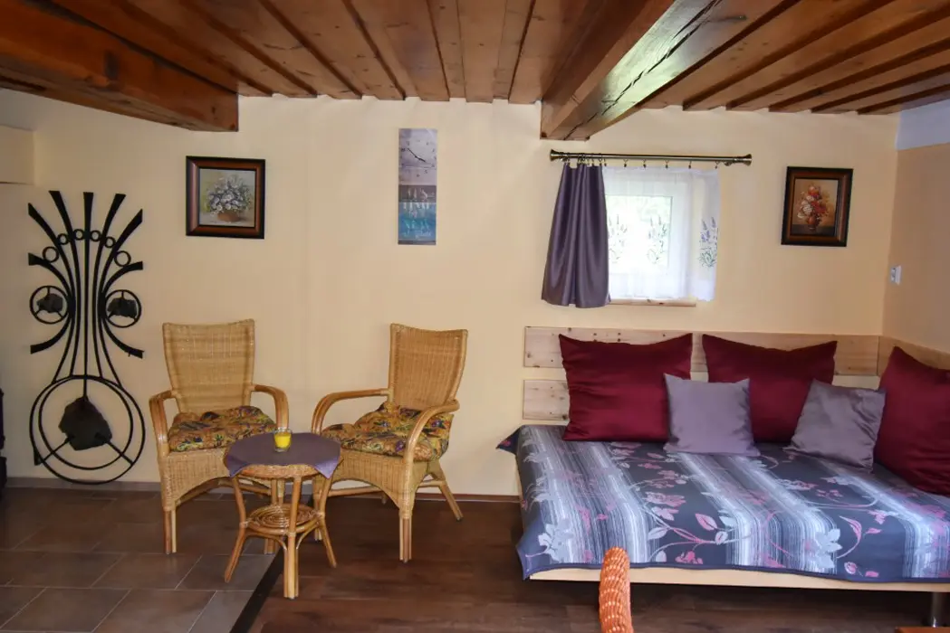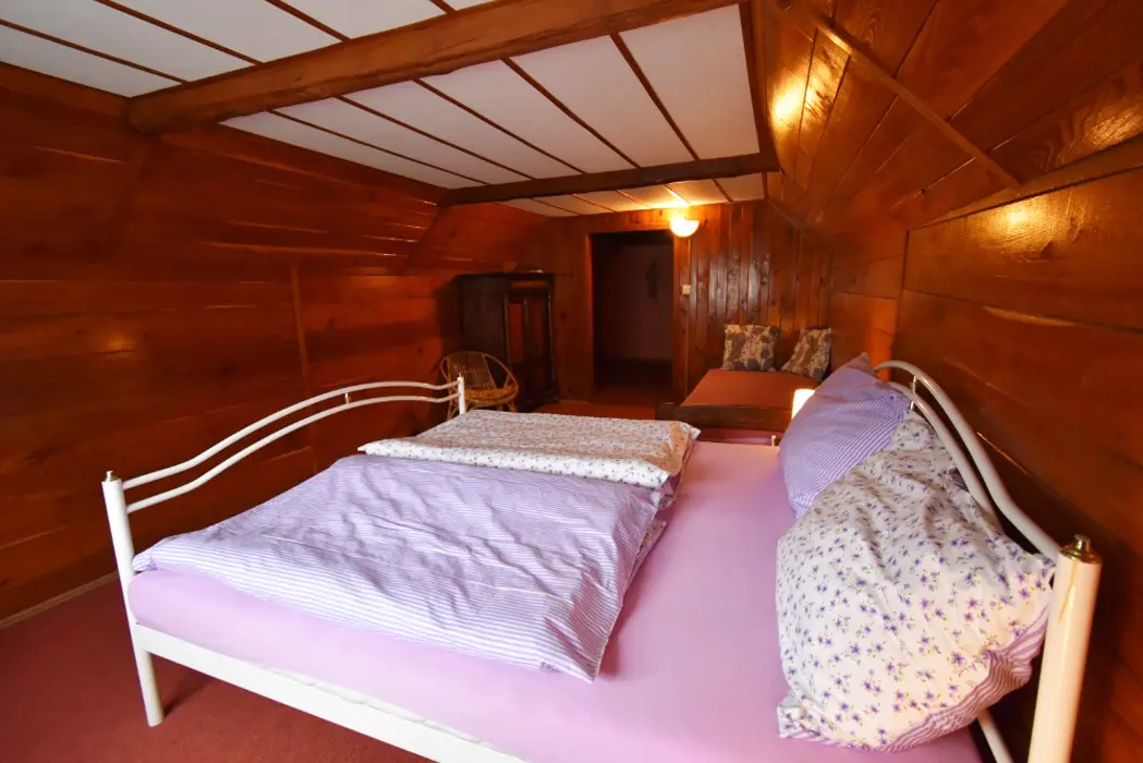 Obývací pokoj s posezením a krbová kamna, BTV. Kuchyňský kout - indukční varná deska, varná konvice překapávač, lednice, mikrovlnná trouba, myčka nádobí. V přízemí 1 ložnice 1x2, v patře ložnice 1x3 ( manželská postel + samostatné lůžko ) - tato má klimatizaci. Koupelna se sprchou, WC samostatné