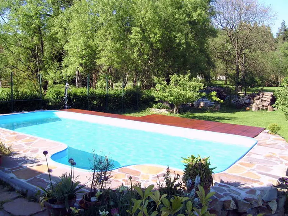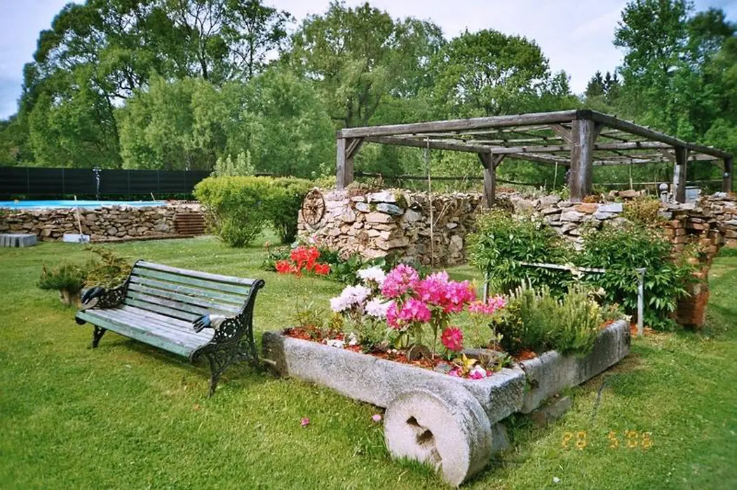Okrasná zahrada, velký travnatý pozemek, velký zapuštěný venkovní bazén, venkovní pergola s posezením