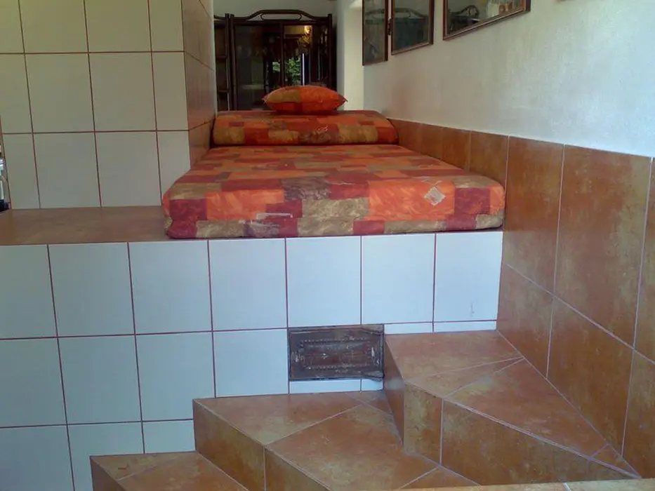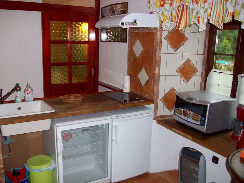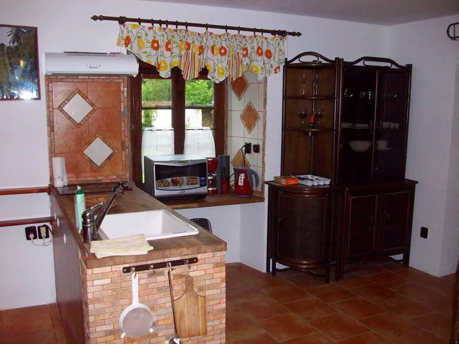 Velká místnost cca 45 m2 - kuchyňský kout - vestavná indukční dvou plotýnková deska, multifunkční trouba, digestoř, lednice s mrazničkou, chladnička na nápoje, základní nádobí, jídelní stůl a židle, plochá TV. 2 lůžka + další lůžko je na velké ruské peci - přístup po schůdkách. Soc. zařízení - koupelna s vanou, pračka, podlahové topení