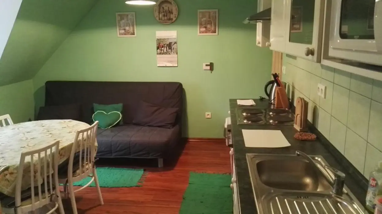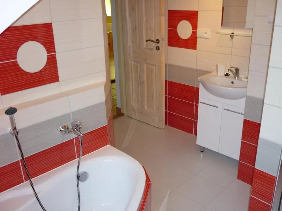 Apartmán III - kuchyně - jídelní stůl se židlemi, kompletně vybavená kuchyňská linka s el. sporákem a troubou, k dispozici je lednice s mrazákem, mikrovlná trouba, varná konvice a kompletní nádobí pro 7 osob. V podkroví 2 ložnice - 1x3, 1x4 lůžka, šatní skříně. Sociální zařízení - sprchový kout, rohová vana, WC.