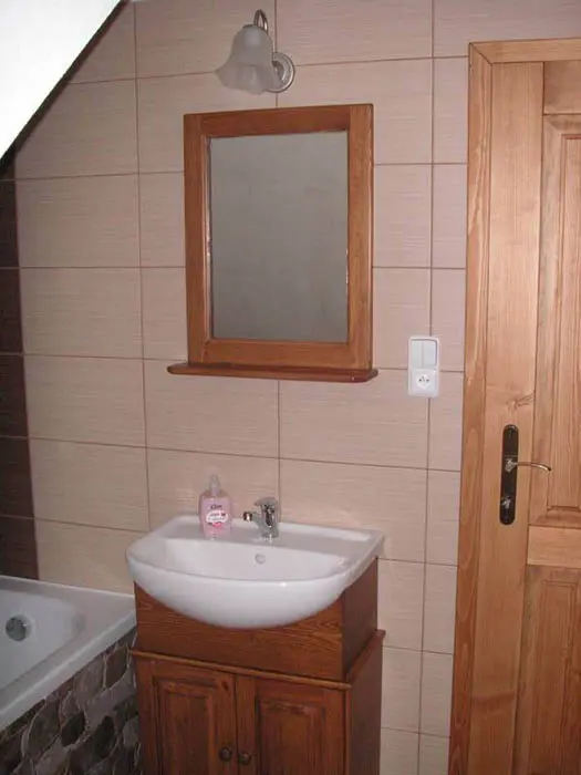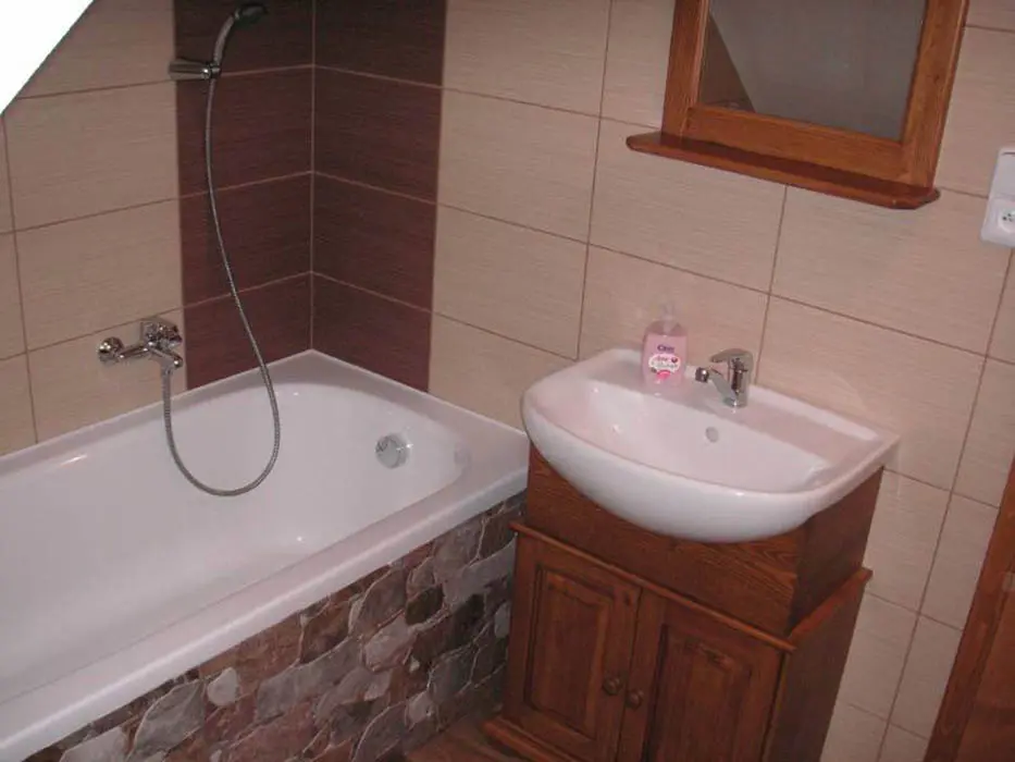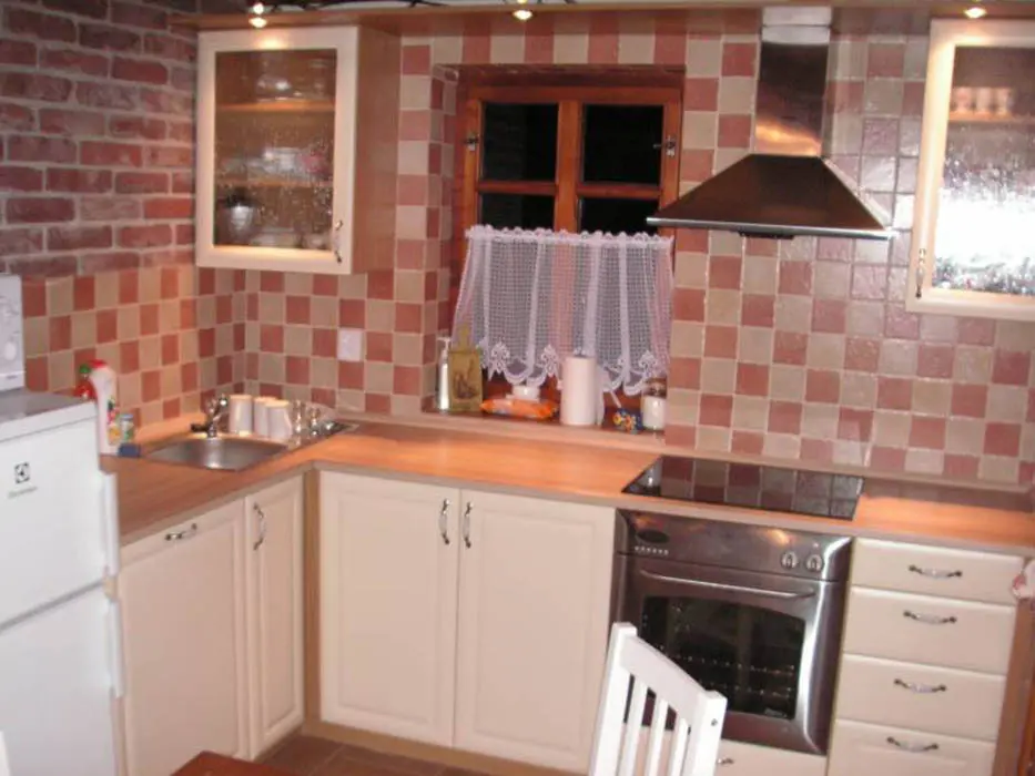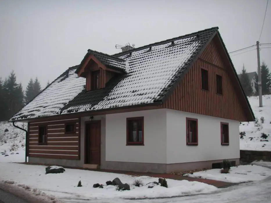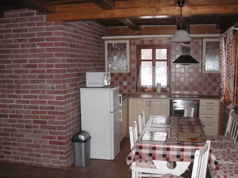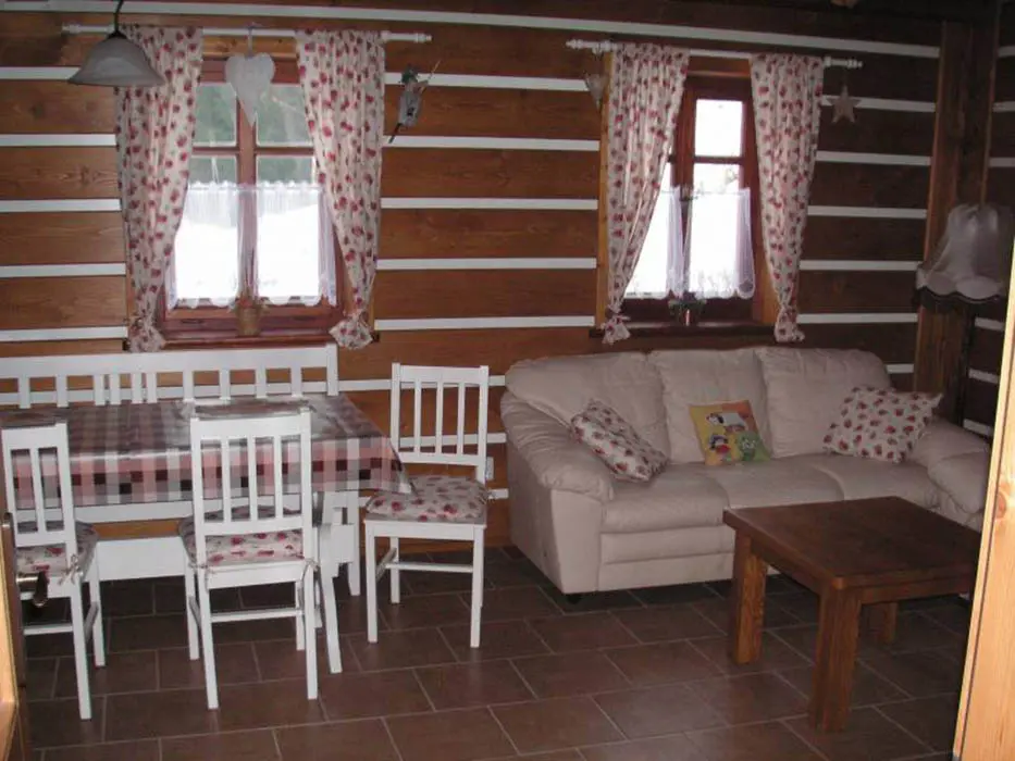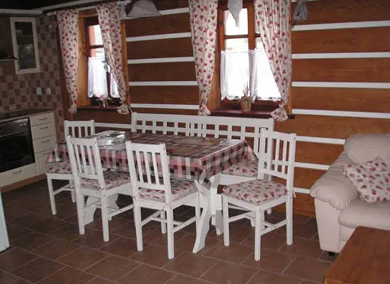 Obývací pokoj - spojený s kuchyní. Kuchyně - sklokeramická deska, horkovzdušná trouba, mikrovlnná trouba, varná konvice, lednice, mrazák, toastovač, posezení. 2 ložnice - v podkroví, 1x4, 1x2 lůžka. Sociální zařízení - v přízemí koupelna se sprchovým koutem, WC a umyvadlem, v podkroví vana a WC. Topení - stropní infrapanely, krbová kamna