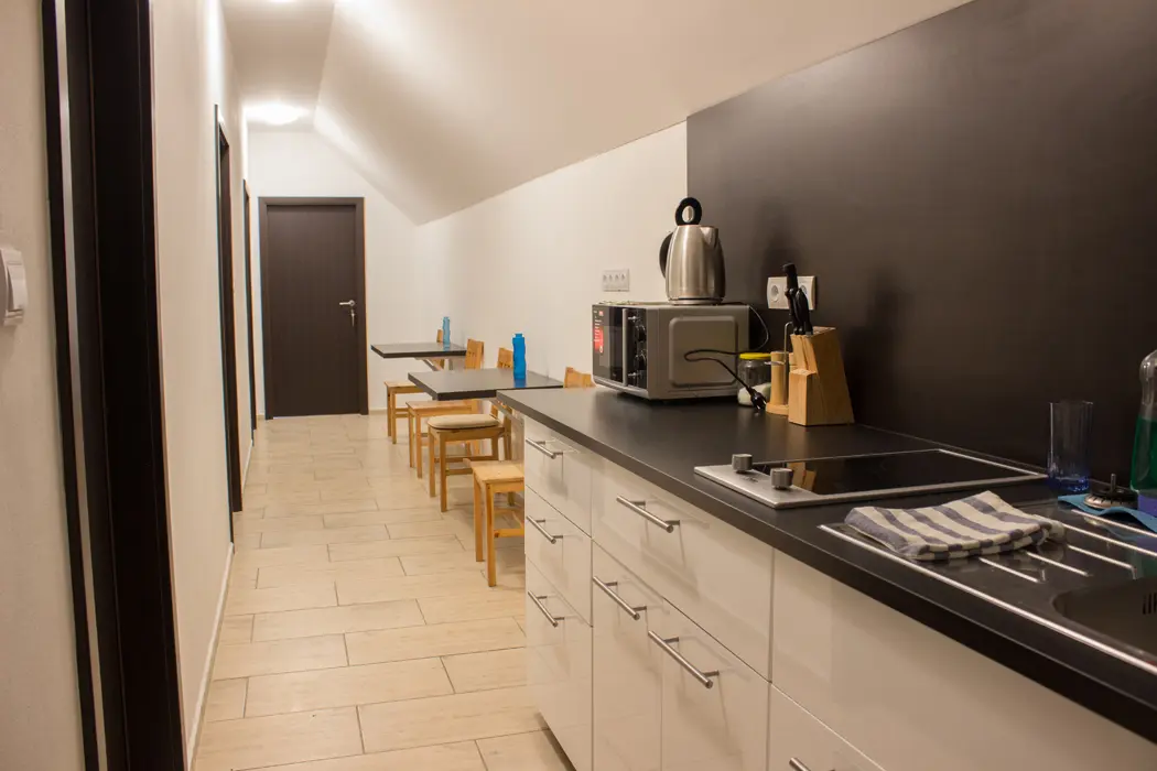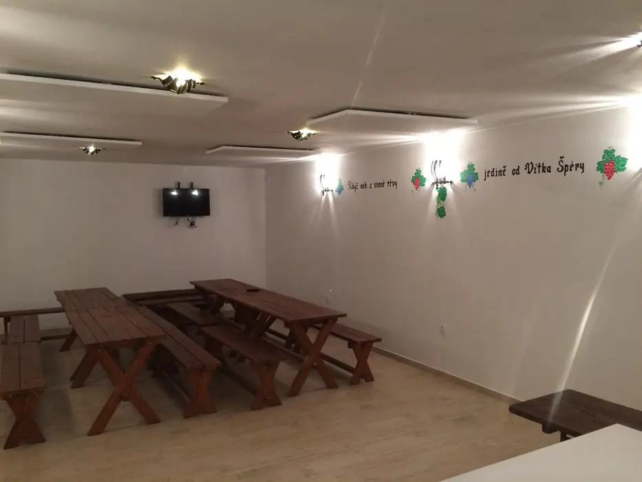 Objekt je řešen se dvěma vstupy - hl. vchod vede do přízemí - zde je vinný sklípek - kapacita až 40 os - po domluvě možné degustace, rauty atd. Druhý vchod - ze zadní části objektu - vede do 4 ložnic - 3x2 lůžka, 1x3 + přistýlka - každý pokoj má svoje soc. zařízení a klimatizaci. Topení - el. přímotopy