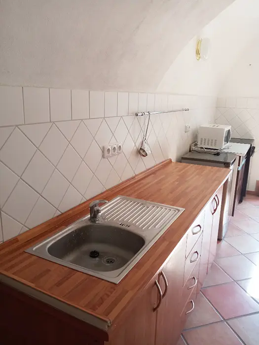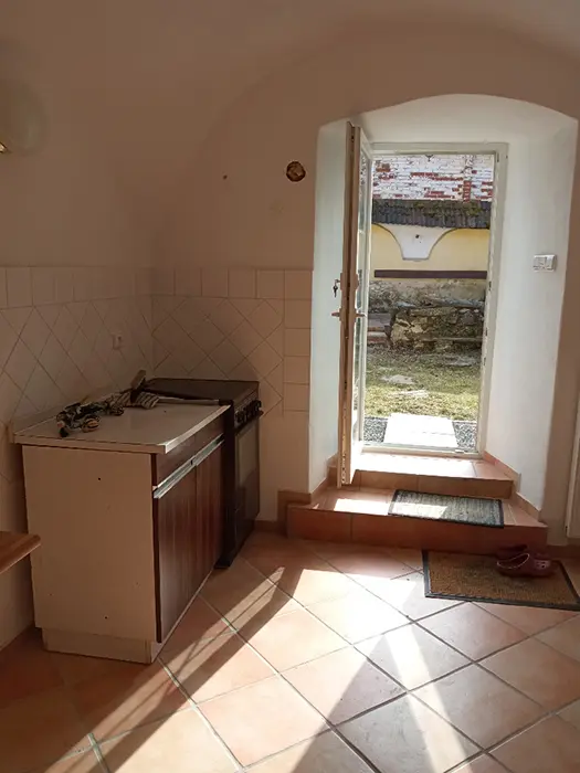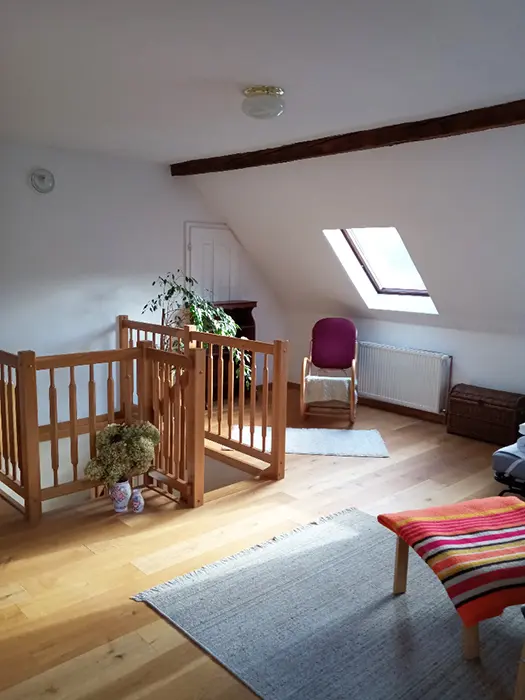 Obývací pokoj s posezením, TV, možnost 1 přistýlky. Kuchyně - el.sporák, mikrovlnná trouba, lednice, stůl a židle. V patře v otevřeném prostoru 1x4 lůžka. Sociální zařízení - sprchový kout, samostatné WC, teplá voda. Topení - plyn + centrální topení