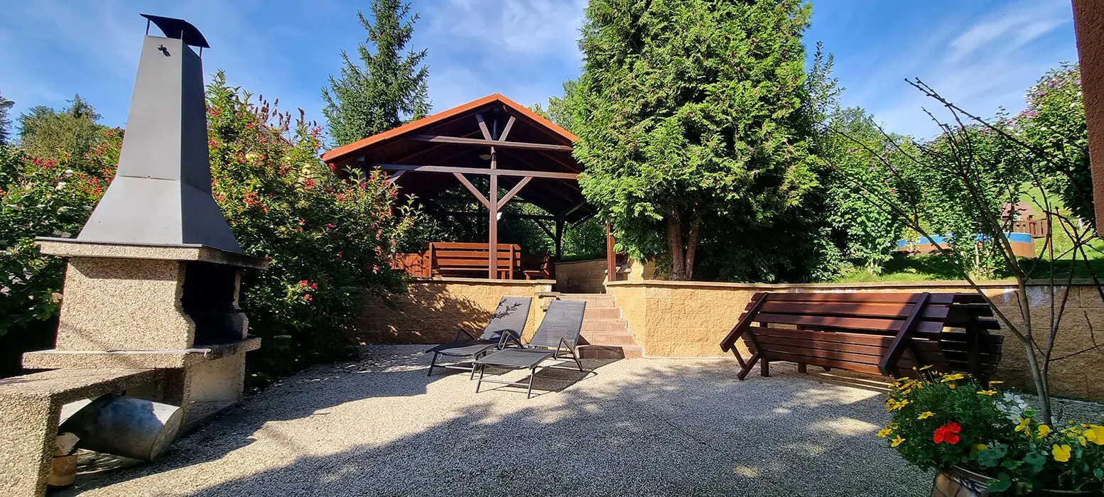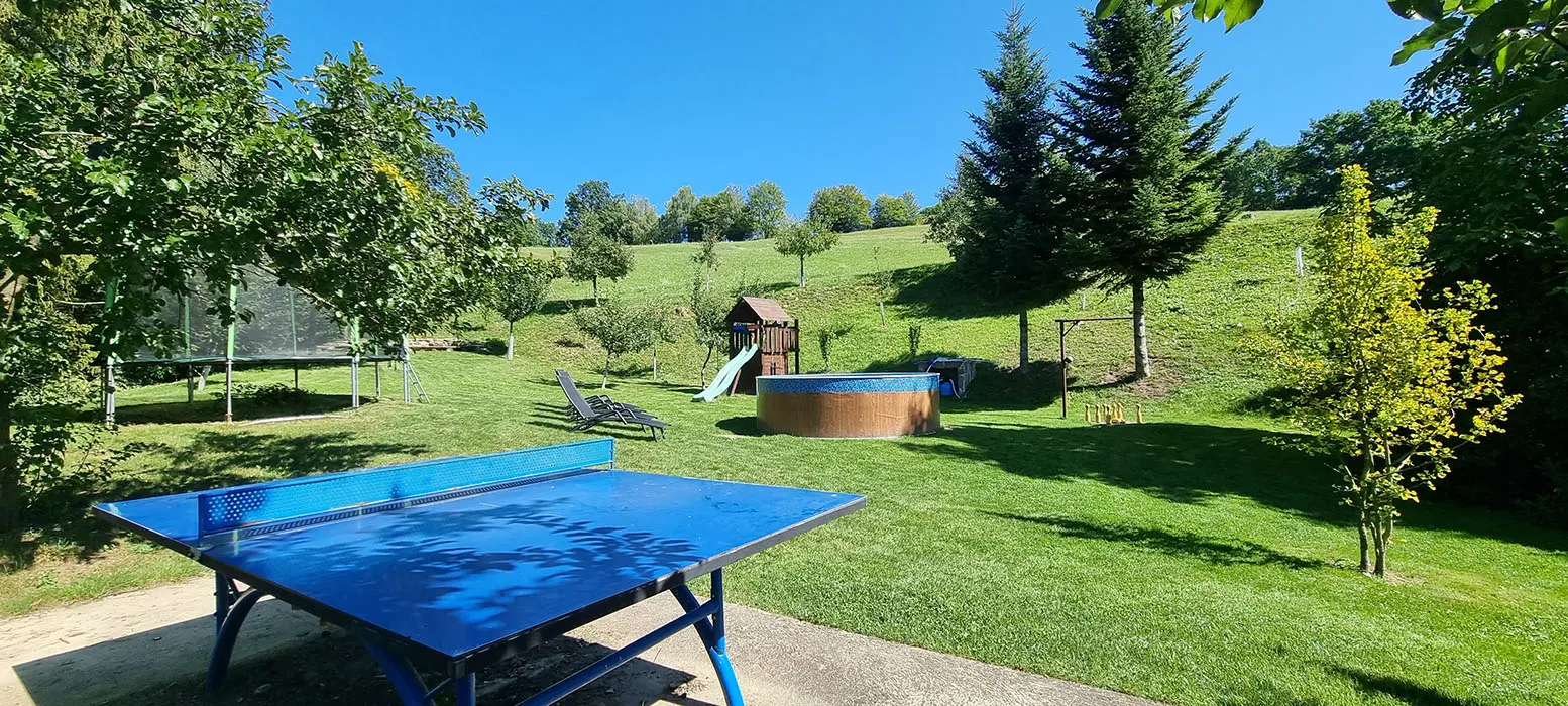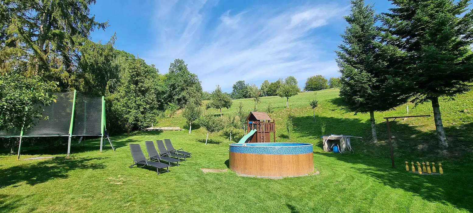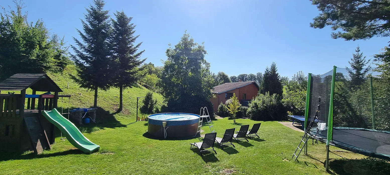 Bazén o průměru 4 m, dětský koutek, houpačka, pískoviště, ohniště, udírna, gril, velká zastřešená pergola s posezením pro 20 osob, velká udržovaná zahrada, trampolína 4 m, dětské hřiště, venkovní stůl na stolní tenis