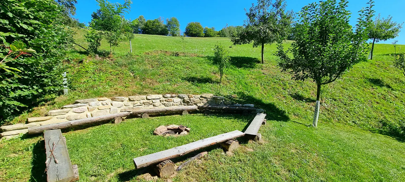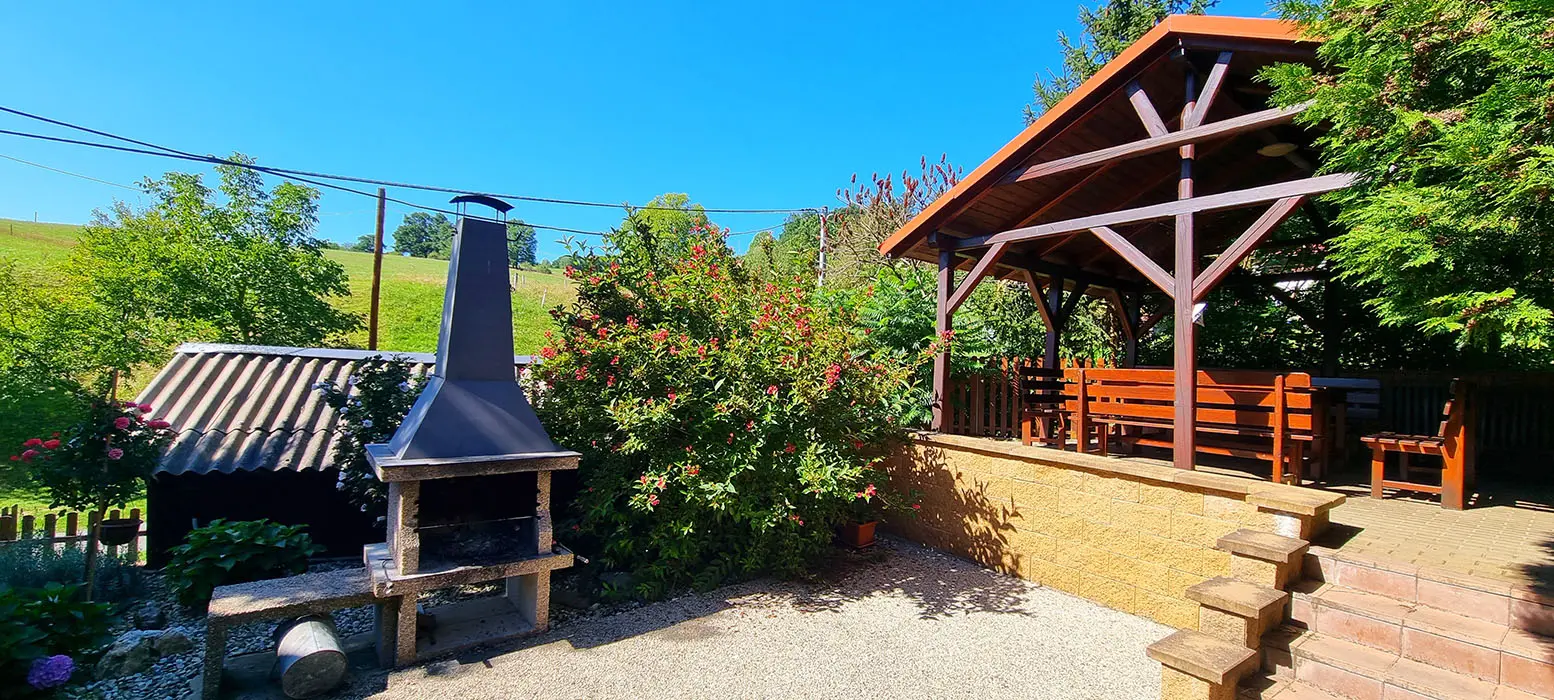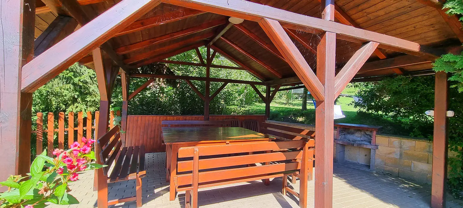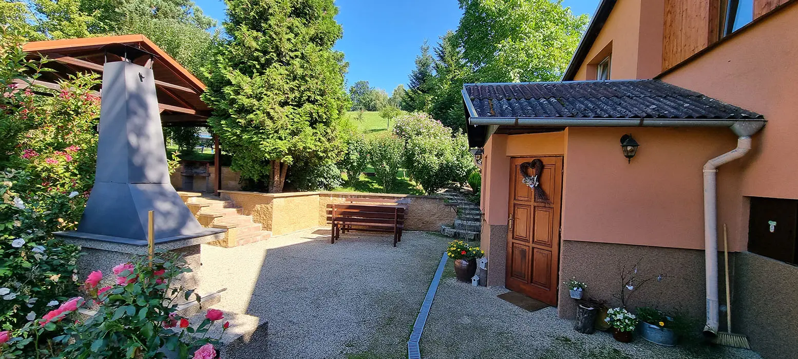 Bazén o průměru 4 m, dětský koutek, houpačka, pískoviště, ohniště, udírna, gril, velká zastřešená pergola s posezením pro 20 osob, velká udržovaná zahrada, trampolína 4 m, dětské hřiště, venkovní stůl na stolní tenis