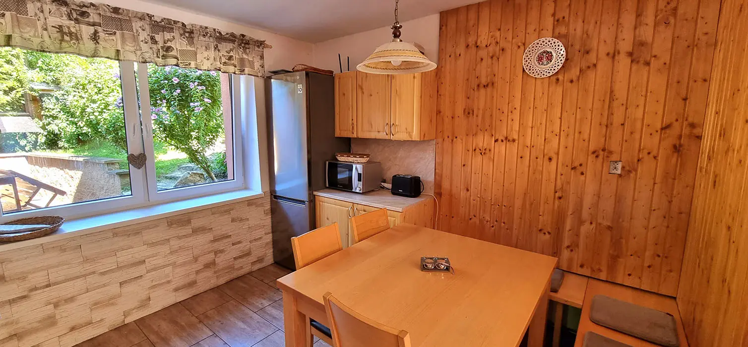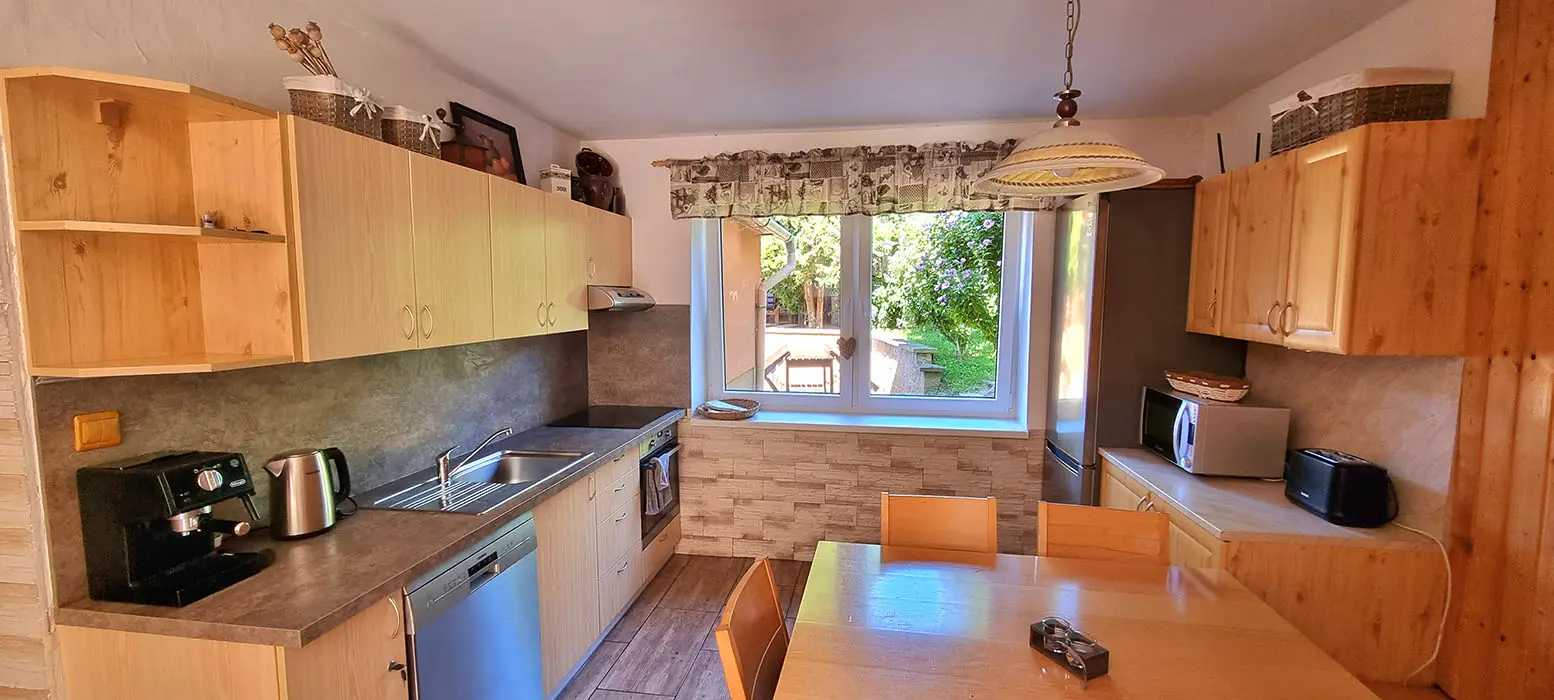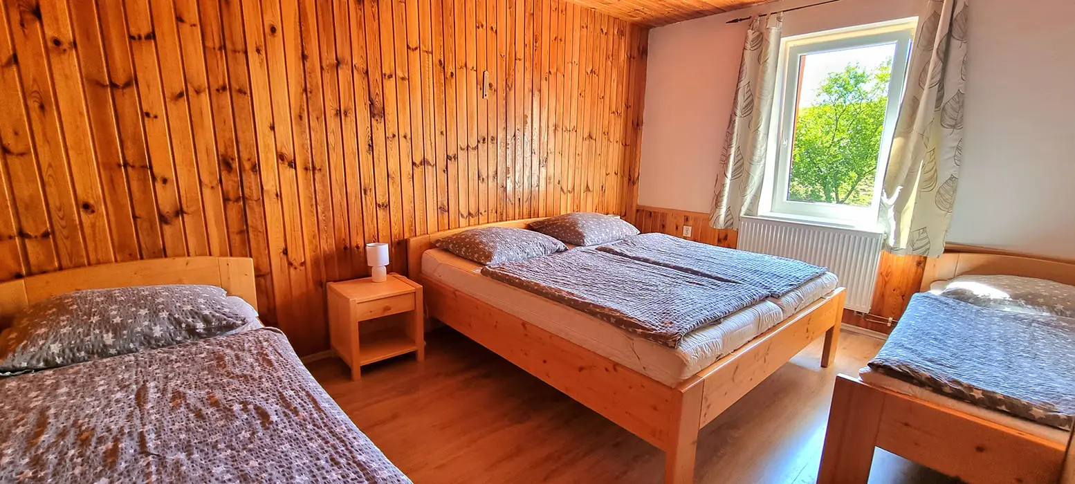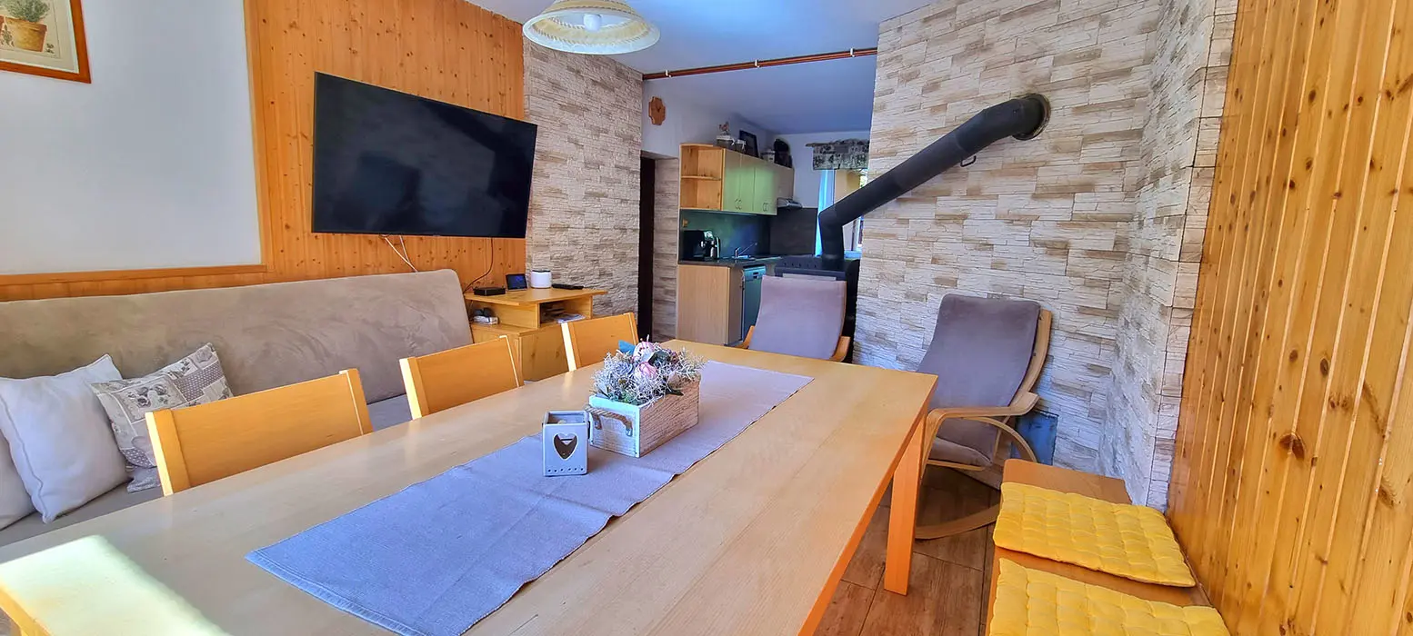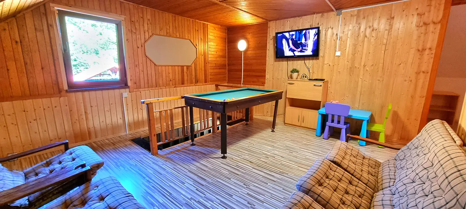 Obývací pokoj spojený s kuchyní - sedací souprava, stůl, židle, lavice, LCDTV, krbová kamna, vybavení kuchyně - sporák se sklokeramickou deskou, elektrická trouba, mikrovlnná trouba, rychlovarná konvice, 2x lednice s mrazákem, myčka nádobí. V patře - společenská místnost, kulečník, LCDTV. 6 ložnic 2x2, 1x3, 2x4, 1x5 lůžek. Sociální zařízení - 2 x koupelna s WC a sprchovým koutem. Topení - krbová kamna + přímotopy