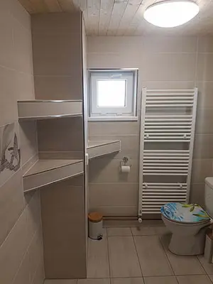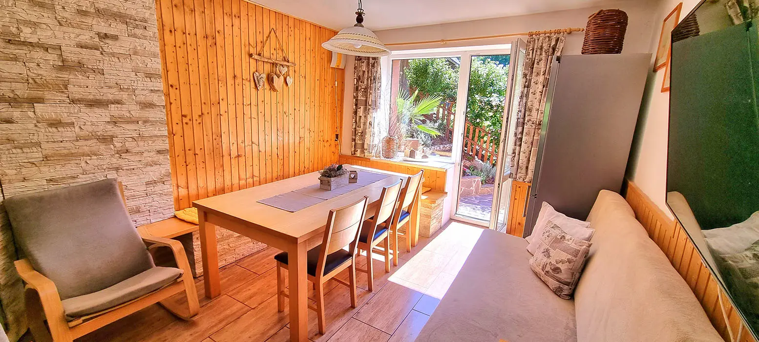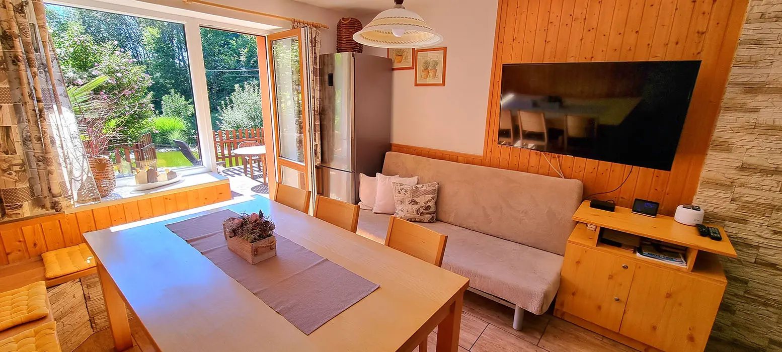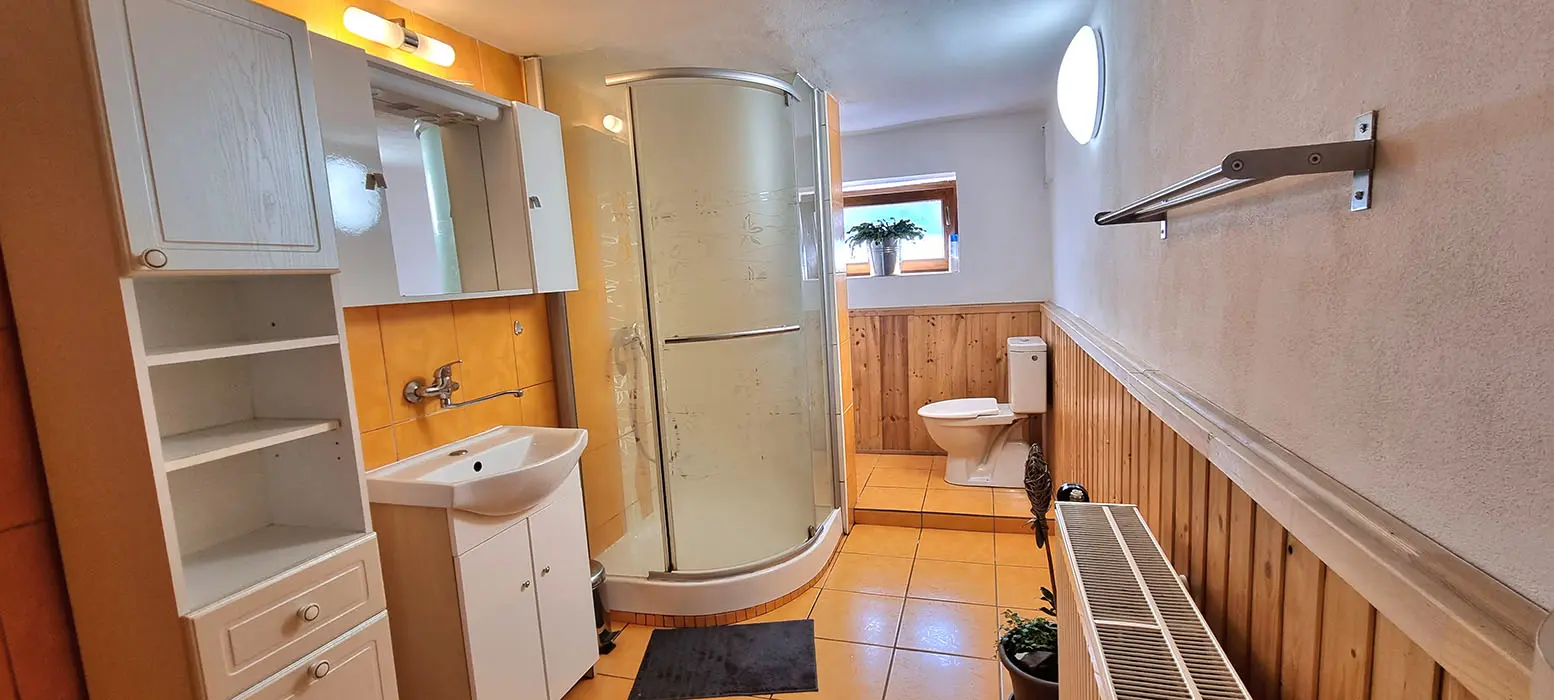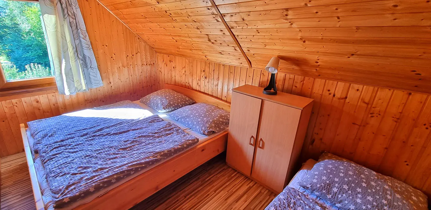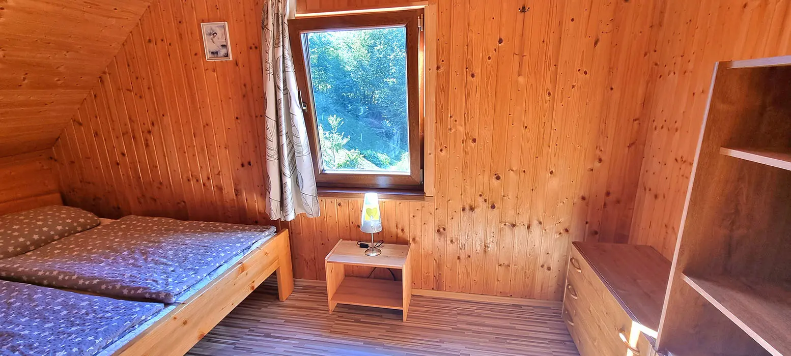 Obývací pokoj spojený s kuchyní - sedací souprava, stůl, židle, lavice, LCDTV, krbová kamna, vybavení kuchyně - sporák se sklokeramickou deskou, elektrická trouba, mikrovlnná trouba, rychlovarná konvice, 2x lednice s mrazákem, myčka nádobí. V patře - společenská místnost, kulečník, LCDTV. 6 ložnic 2x2, 1x3, 2x4, 1x5 lůžek. Sociální zařízení - 2 x koupelna s WC a sprchovým koutem. Topení - krbová kamna + přímotopy