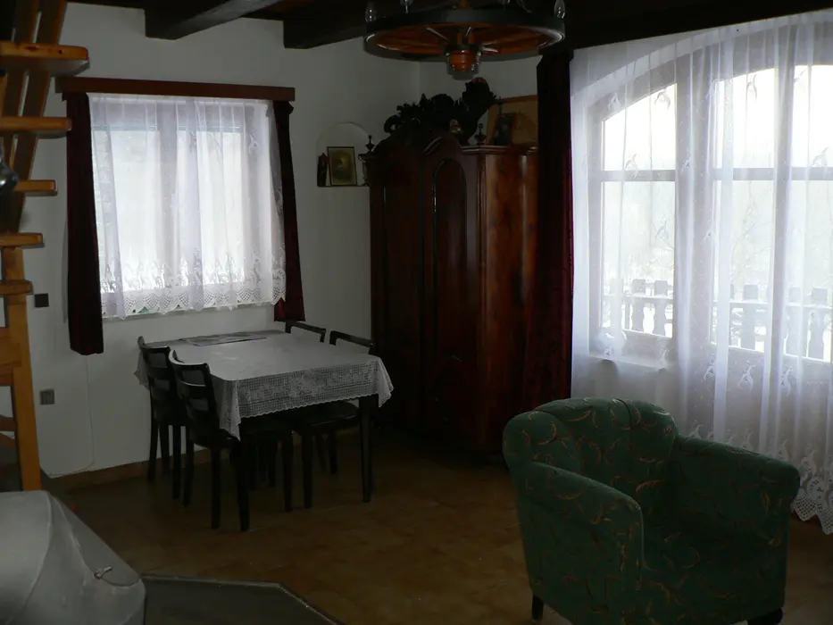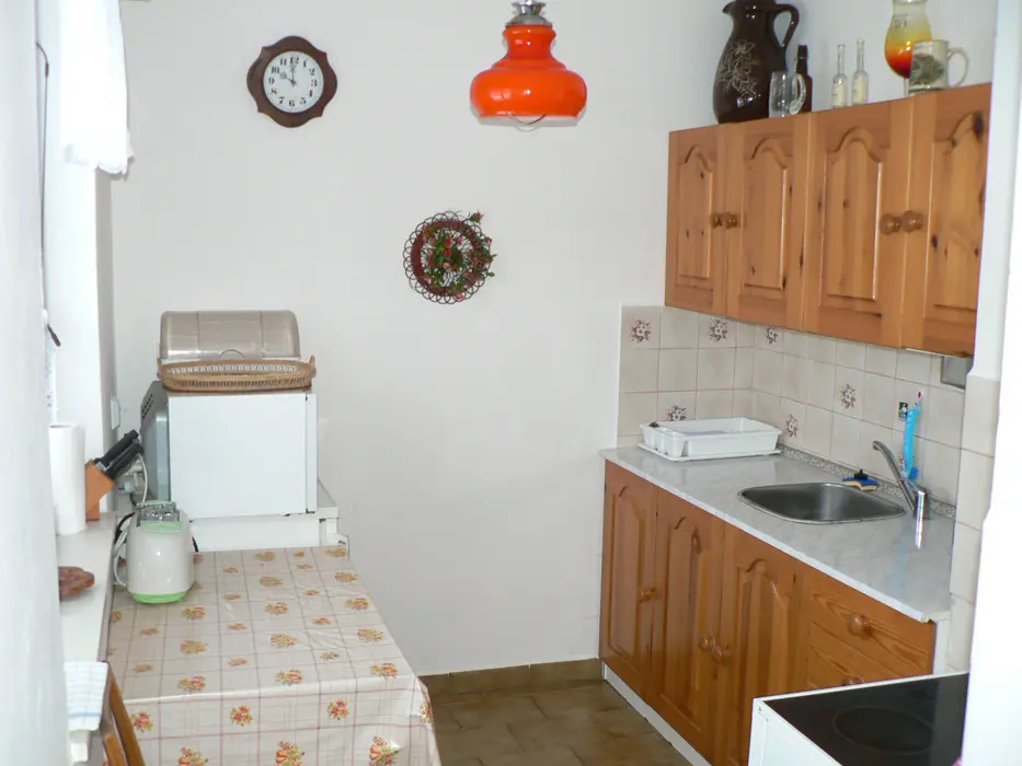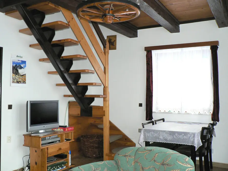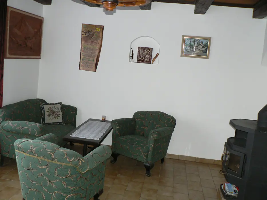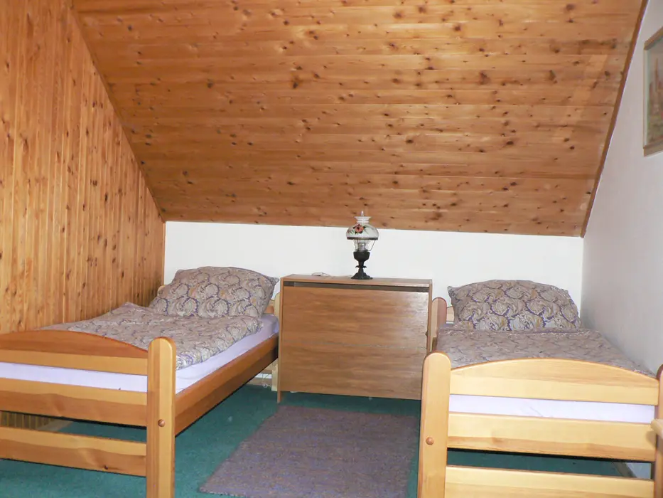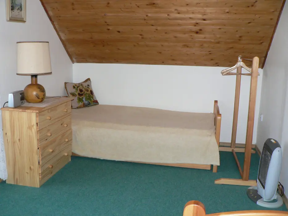Obývací pokoj s posezením, BTV, stůl a židle. Kuchyně - el.sporák se sklokeramickou deskou, mikrovlnná trouba, lednice, kávovar, varná konvice, topinkovač, nádobí, pitná voda. V patře 2 ložnice - 1x2, 1x3 lůžka. Sociální zařízení - koupelna, sprchový kout, umyvadlo, pračka, samostatné WC. Topení - krbová kamna, přímotop.