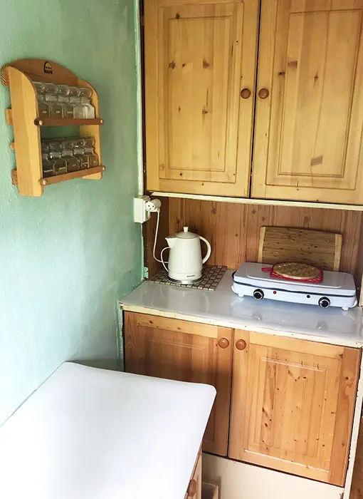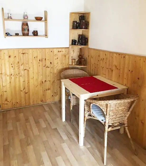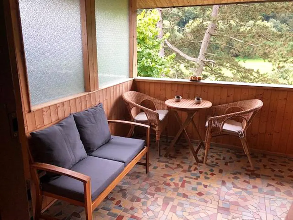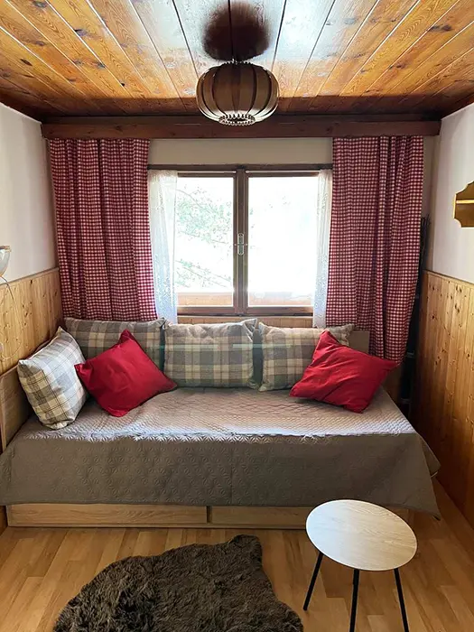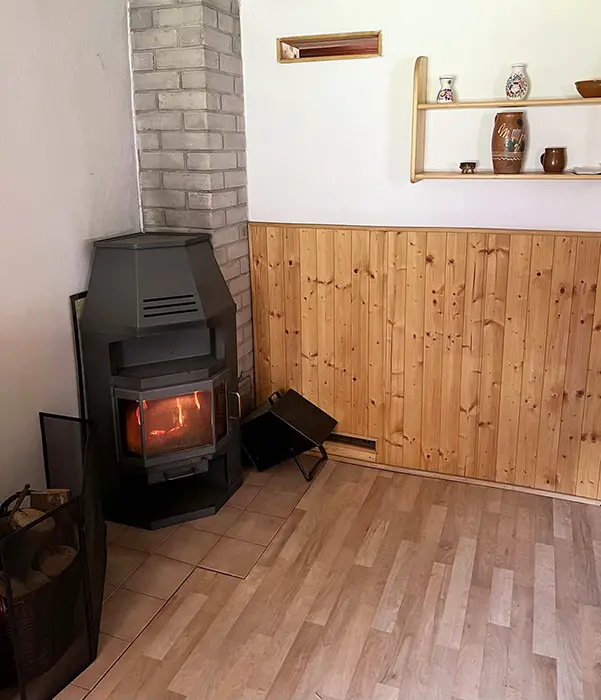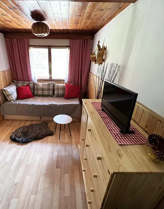 Obývací pokoj s posezením, TV+SAT, rádio, krbová kamna, rozkládací sedačka - 2 přistýlky. Kuchyně - el. dvoukolový vařič, remoska, varná konvice, lednice, toustovač, nádobí. 1 ložnice - 1x2 lůžka. Soc. zařízení - sprchový kout + WC. Topení - na tuhá paliva