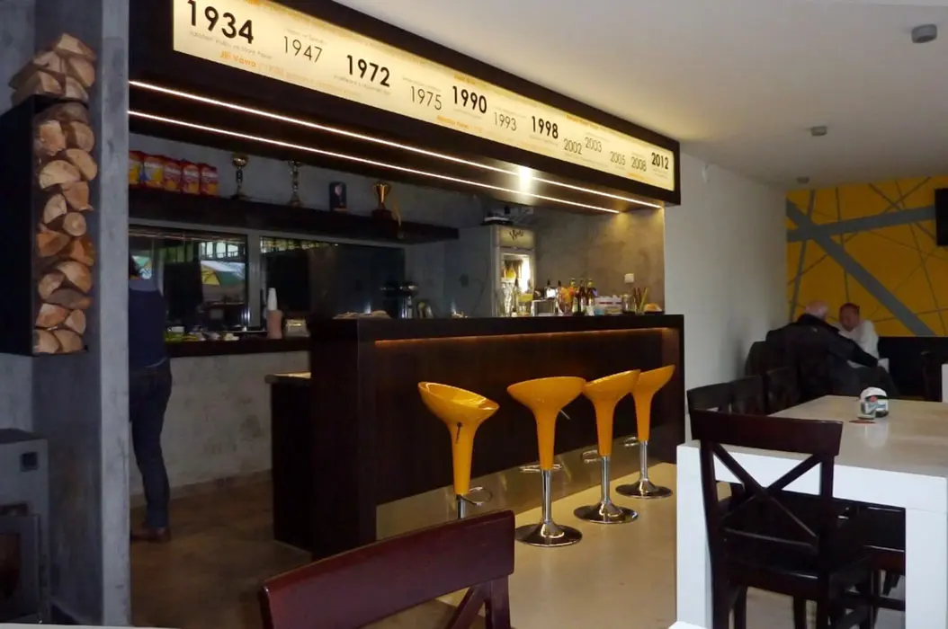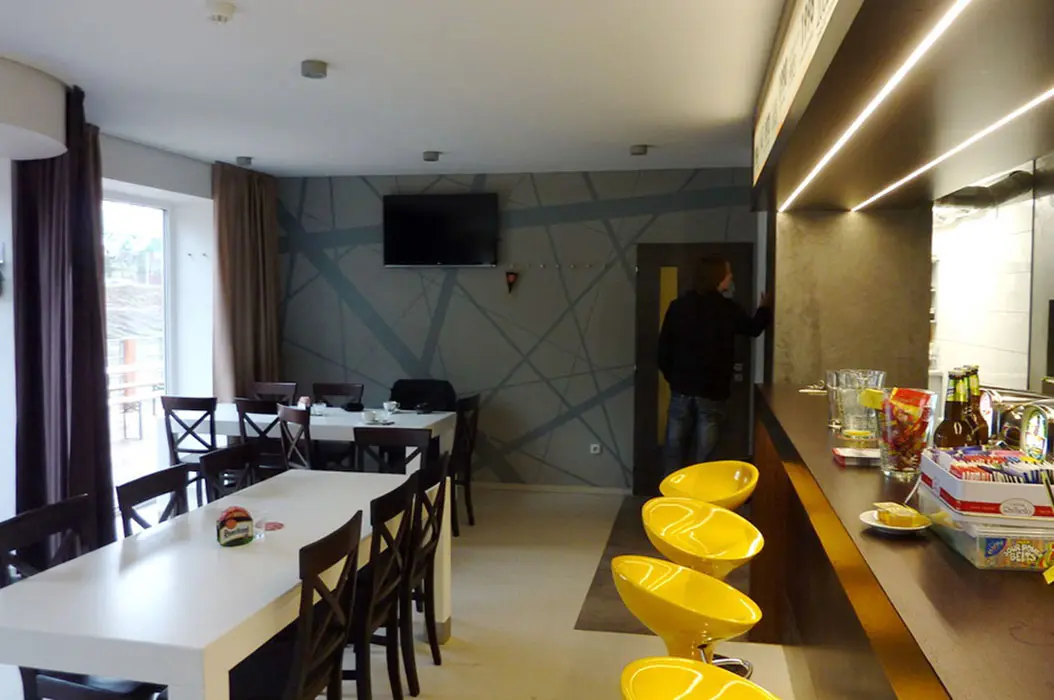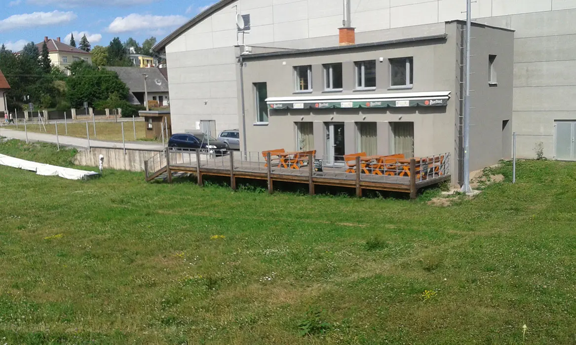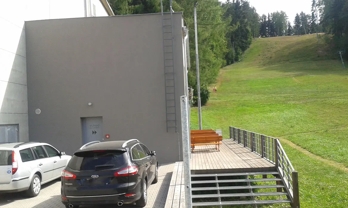 V přízemí objektu restaurace s výhledem na ledovou plochu a sjezdovku, venkovní posezení