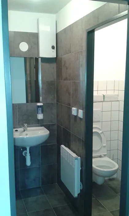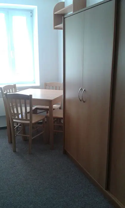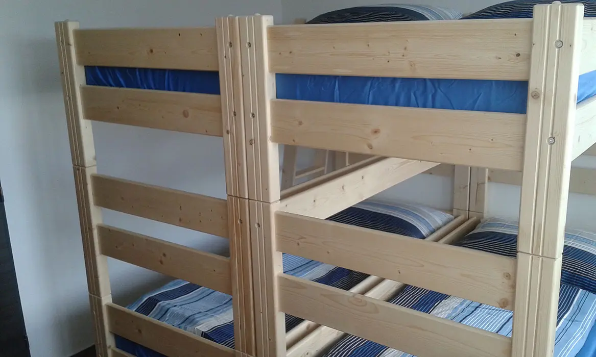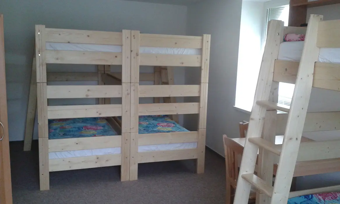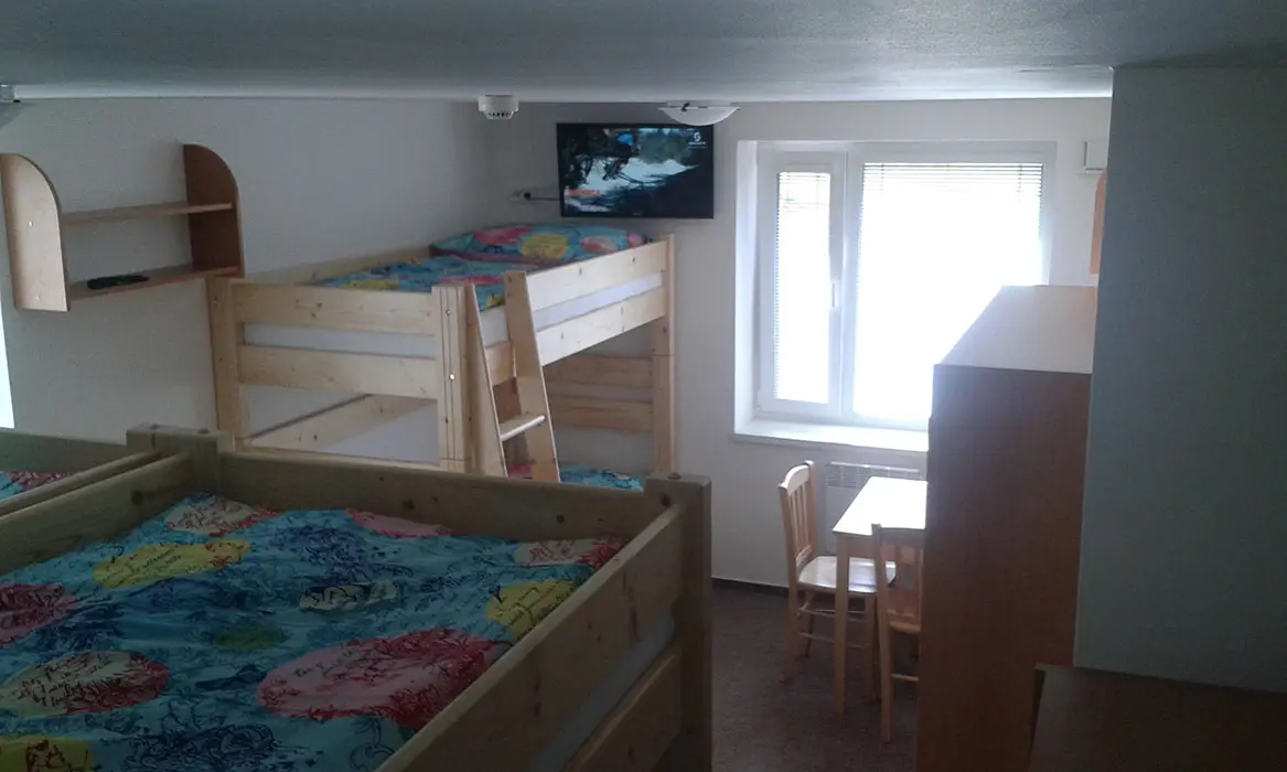 Malá snídaňová kuchyňka - základní nádobí, lednice, vařič, varná konvice. 3 ložnice - 1x2 + 1 přistýlka, 1x6 patrové postele + TV, 1x4 patrové postele + TV. Sociální zařízení - 2x sprchový kout, 4x umyvadla, 4x WC. Topení -elektrické centrální.