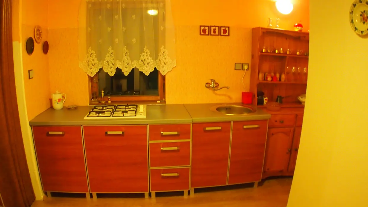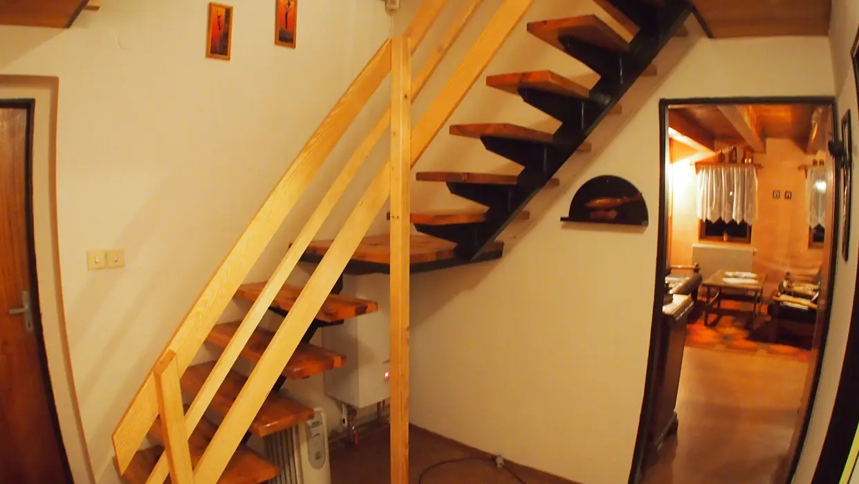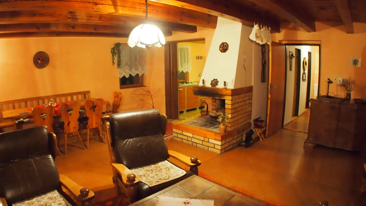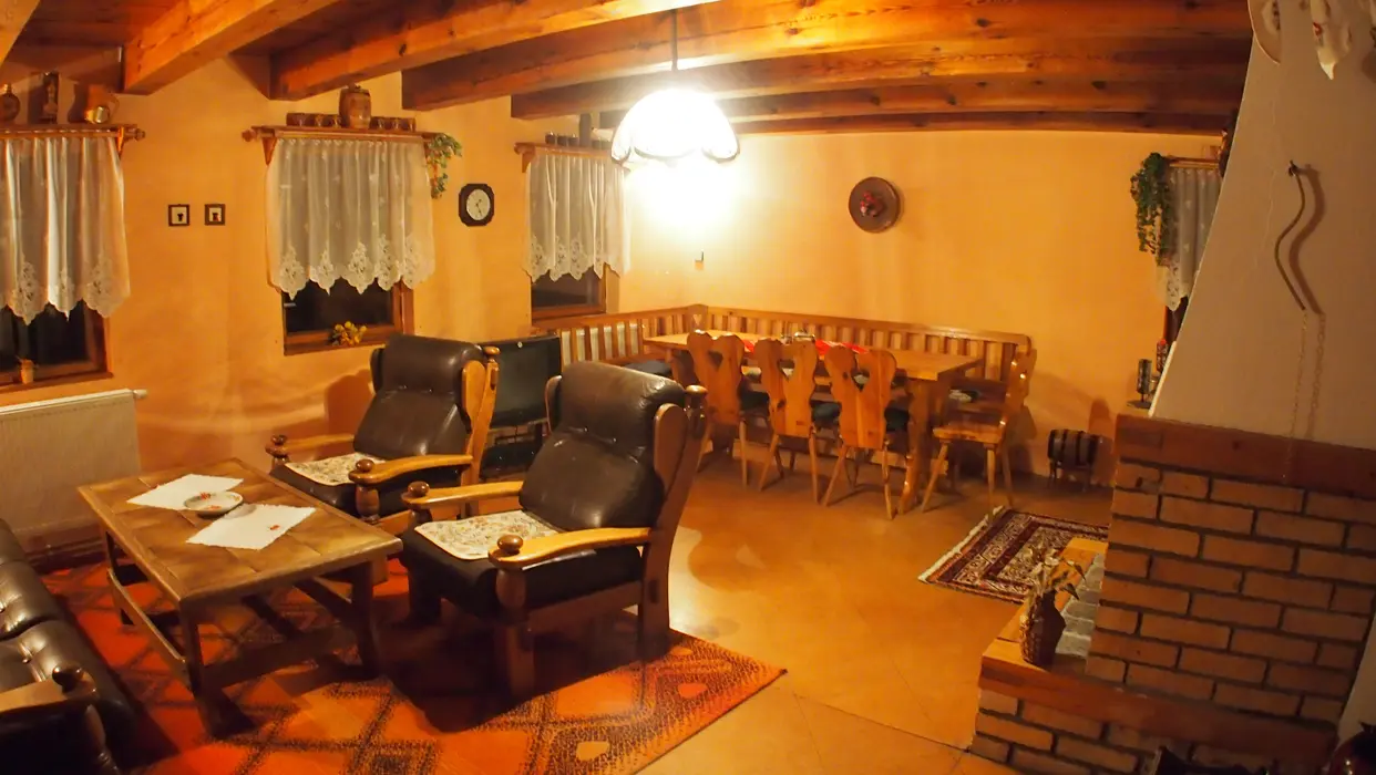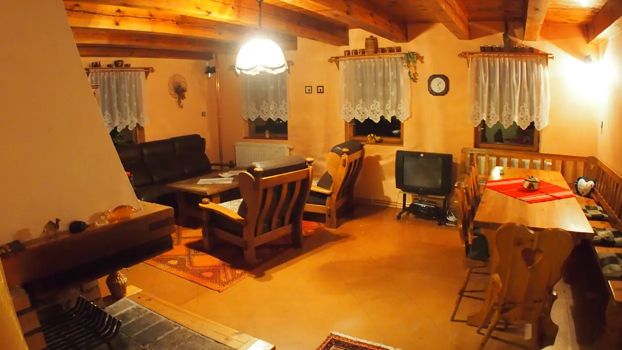 Prostorný obývací pokoj s posezením, oddělená kuchyně - plynová varná deska, lednice, mikrovlnná trouba, varná konvice, remoska, veškeré nádobí. 2 ložnice - 2x4 lůžka. Sociální zařízení - koupelna se sprchovým koutem, WC. Topení - centrální elektrický kotel