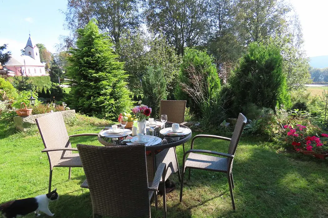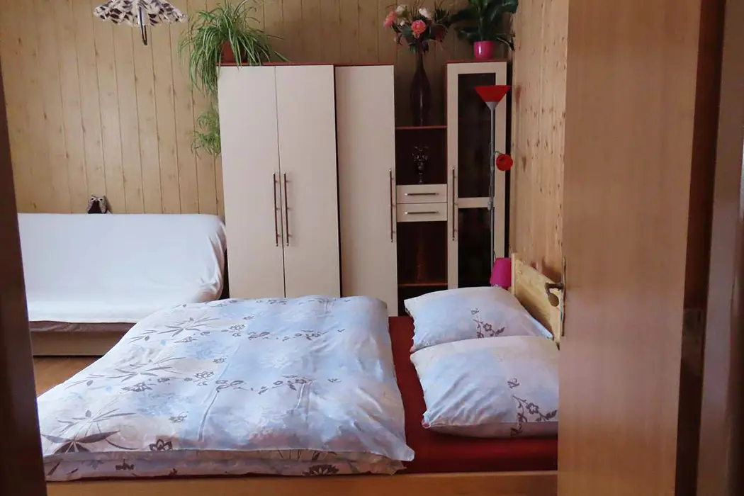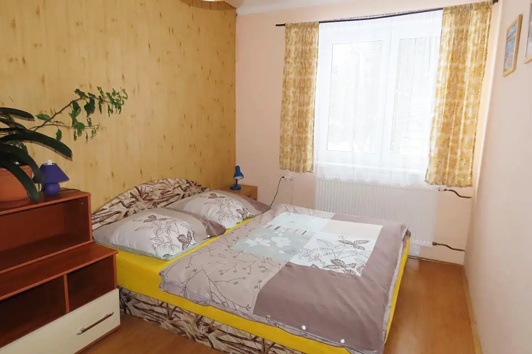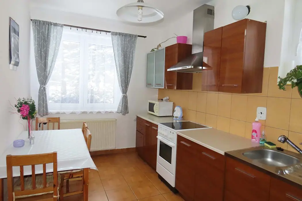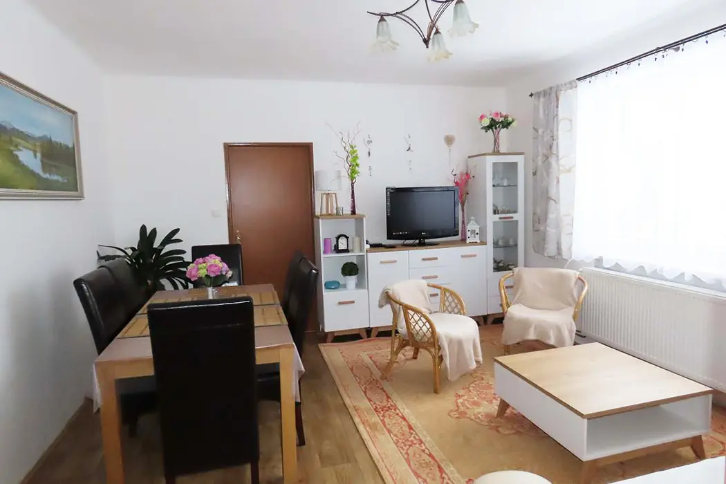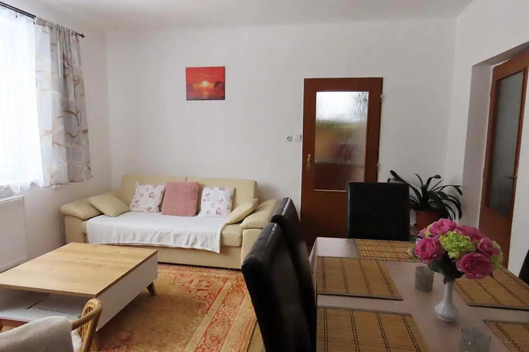 Apartmán má samostatný vchod, klienti mají zaručené soukromí, velký obývací pokoj s koženou sedací soupravou, BTV, stůl a židle, kuchyně - el. sporák, varná konvice, mikrovlnka, lednice, základní nádobí. 2 ložnice 1x3, 1x4 lůžka, k dispozici dětská postýlka. Koupelna s vanou, samostatné WC. Vytápění obsluhuje majitel.