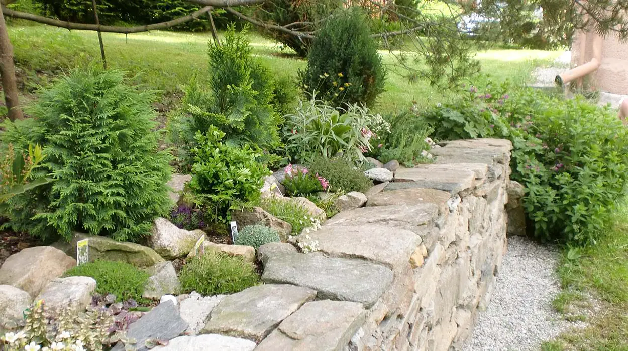Na oplocené udržované zahradě posezení, dřevěný nábytek, krb, gril