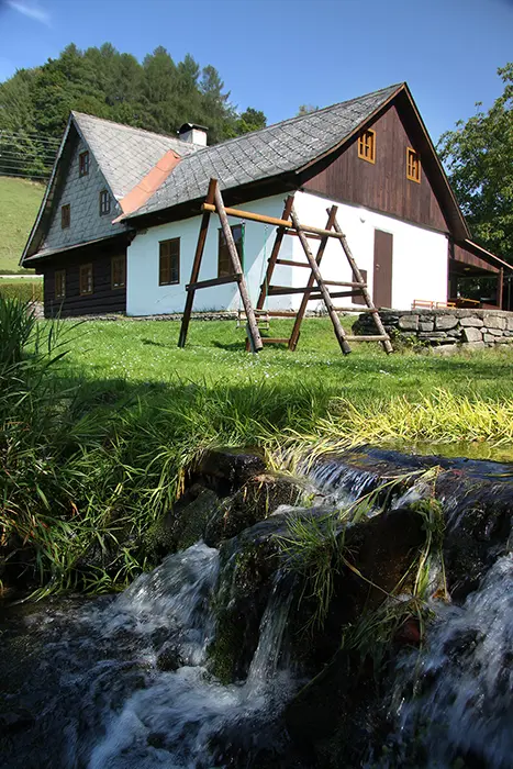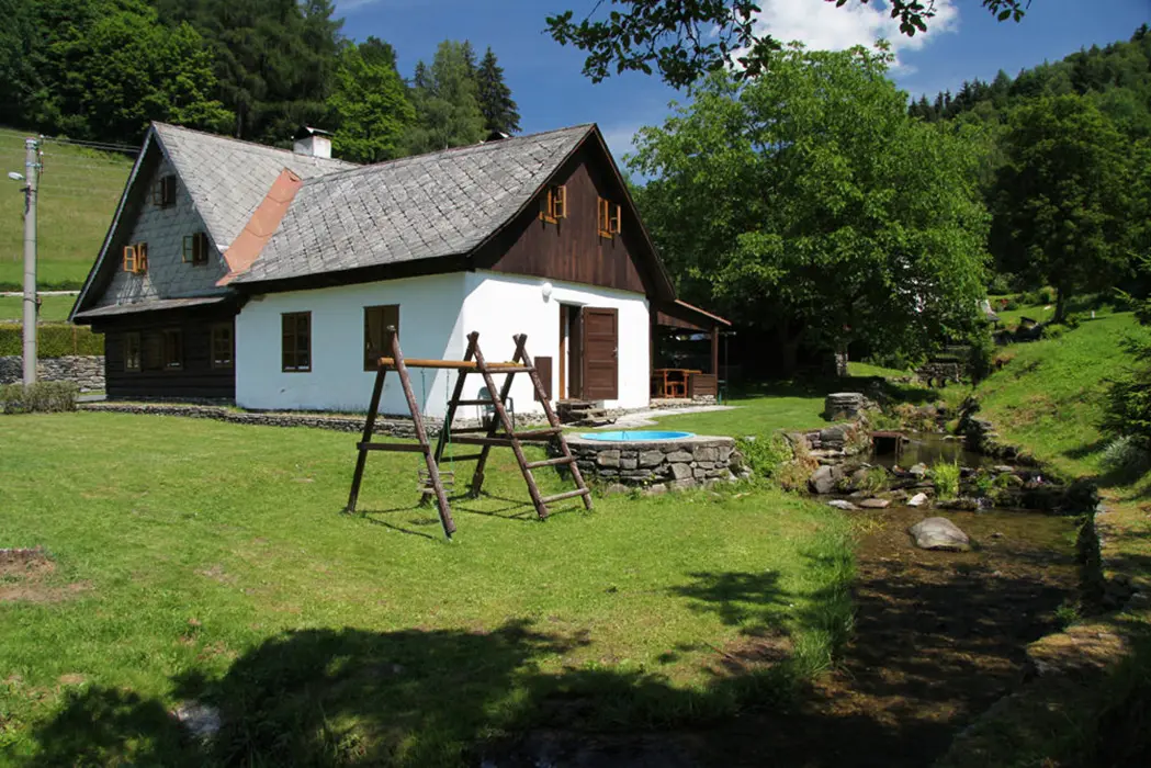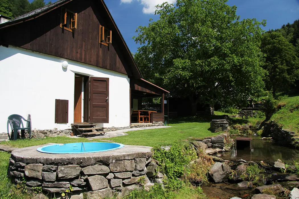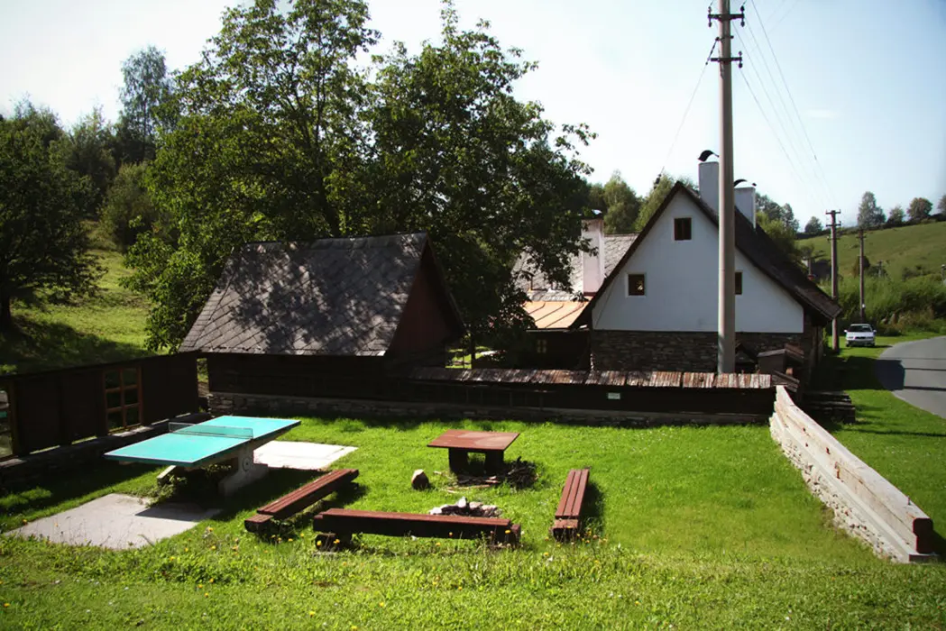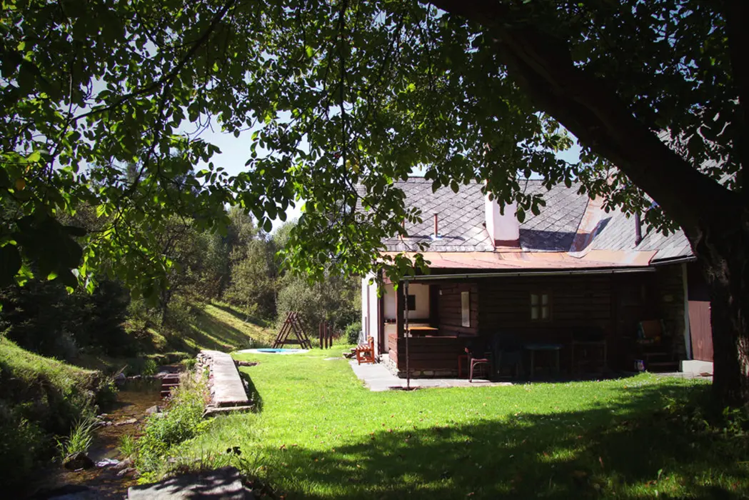 Venkovní zastřešené posezení, travnatý prostor, dvě ohniště, udírna, malý gril, ping pongový stůl, úschovna kol, houpačka a prolézačka pro děti, za chalupou protéká horský potok - v místě za chalupou je upravený pro chlazení ze saunování