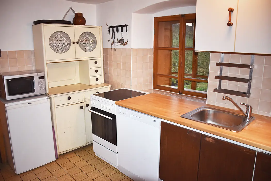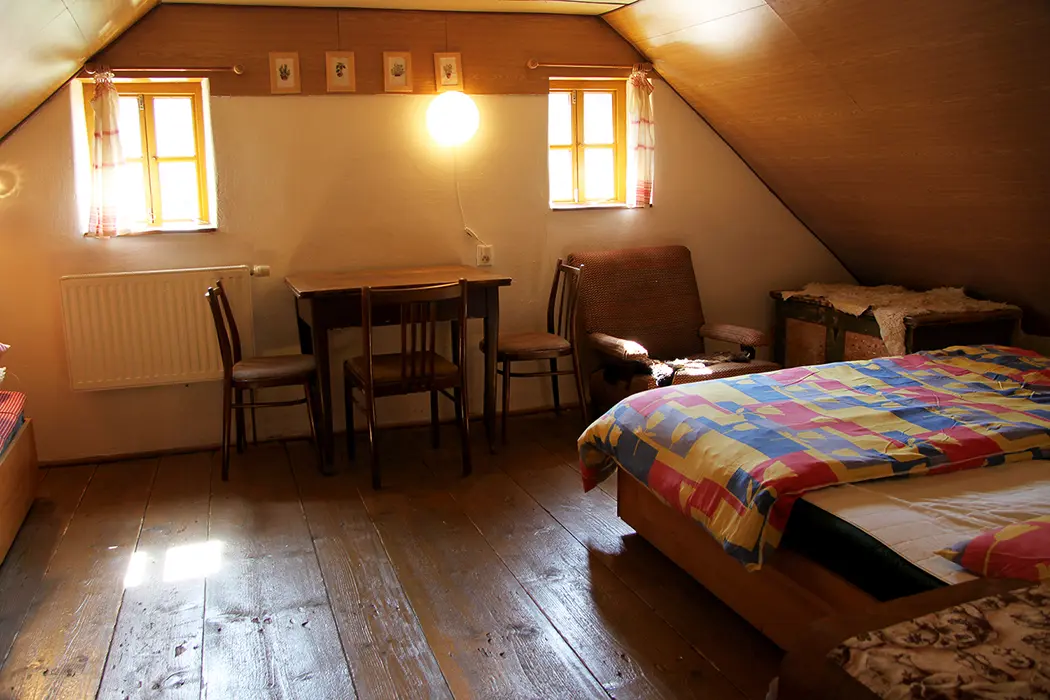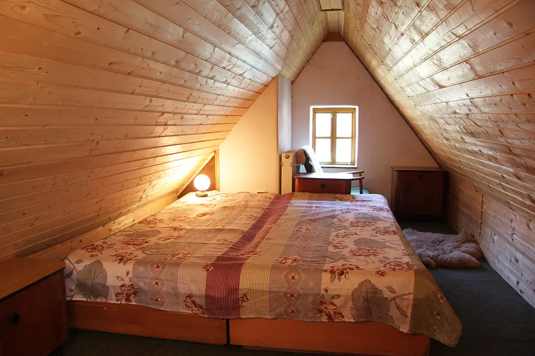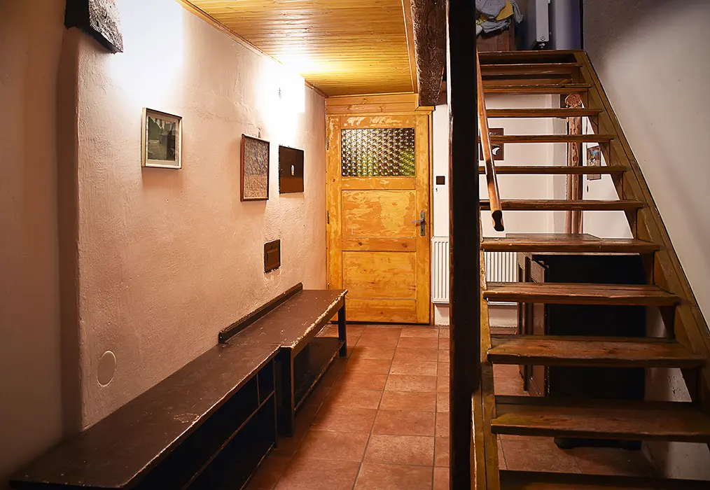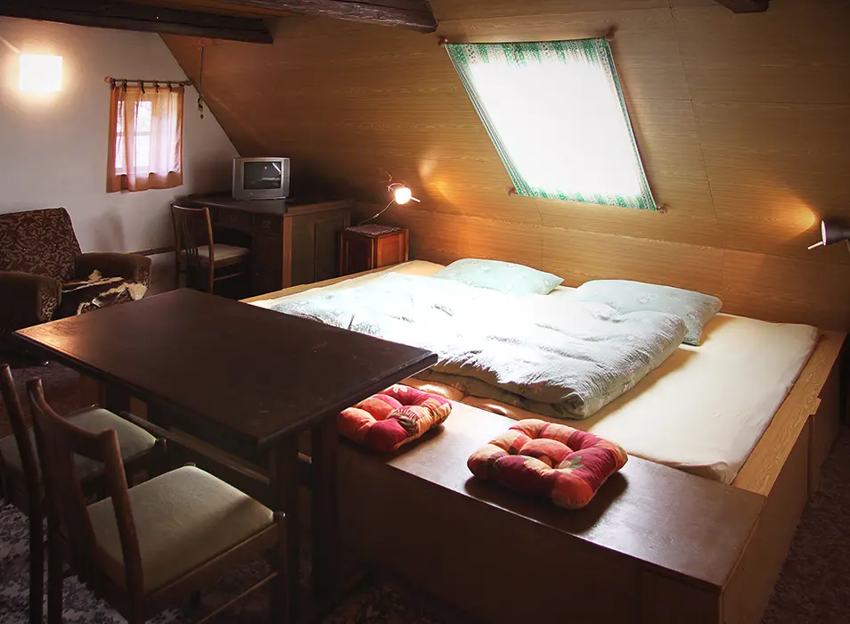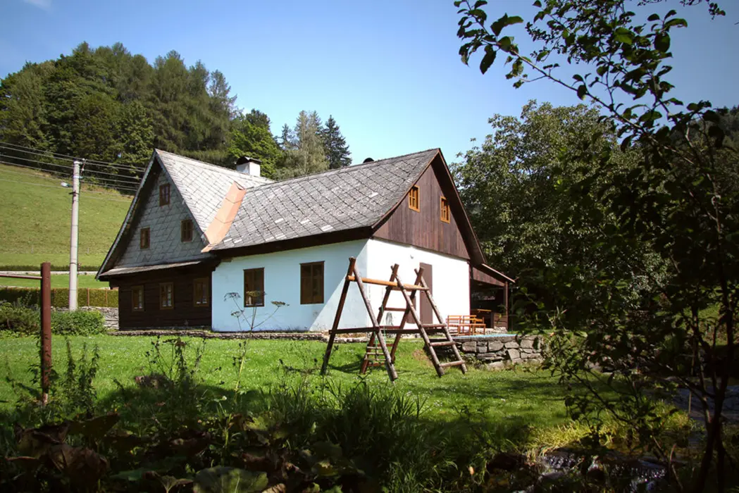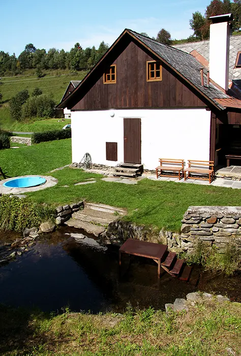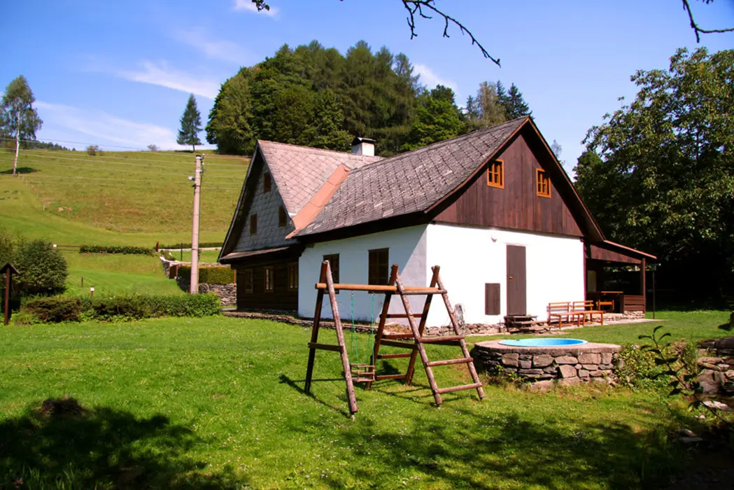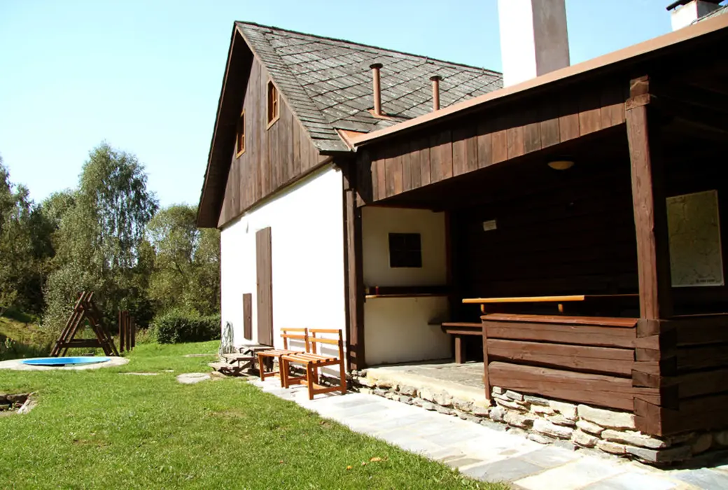 Nově zrekonstruovaná 200 let stará chalupa. V přízemí vstupní chodba, velká stylová jídelna s kachlovými kamny - stoly, židle, skleník se stolním nádobím spojená s krbovou místností. Kuchyně - el. sporák s troubou, myčka na nádobí, lednice, mikrovlnka, varná konvice, základní nádobí. Z chodby je přístup do dřevníku a do sklepa. 6 ložnic - v přízemí 1x2, v patře - 1x3, 2x5, v podkroví - 2x2 lůžka. K dispozici dětská postýlka. Sociální zařízení - 2x koupelna, 2x WC ( jedno v koupelně + samostatné WC ). Vytápění - ústřední s plynovým kotlem + tuhá paliva