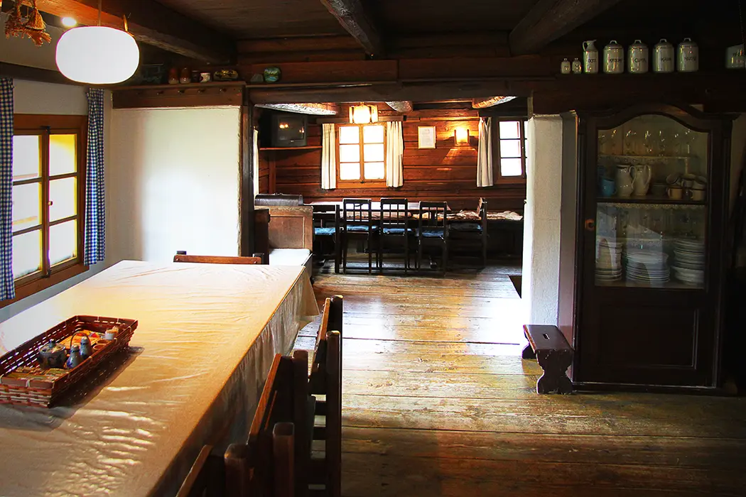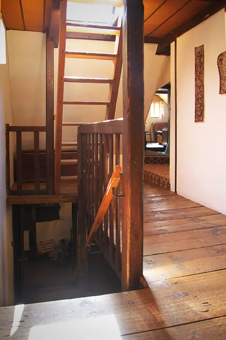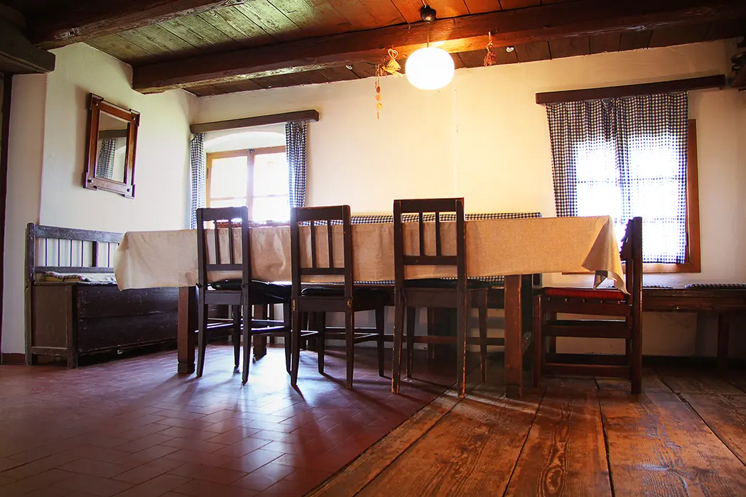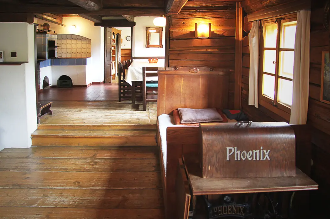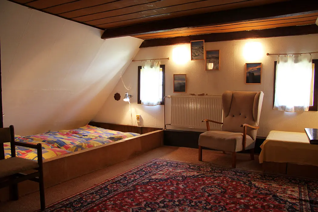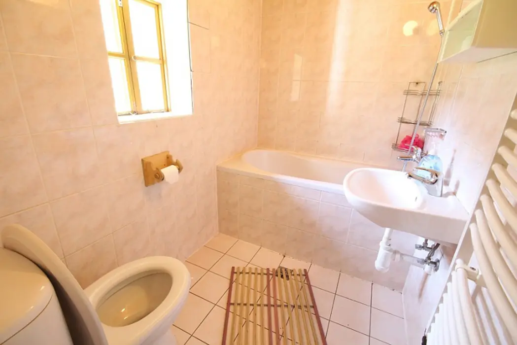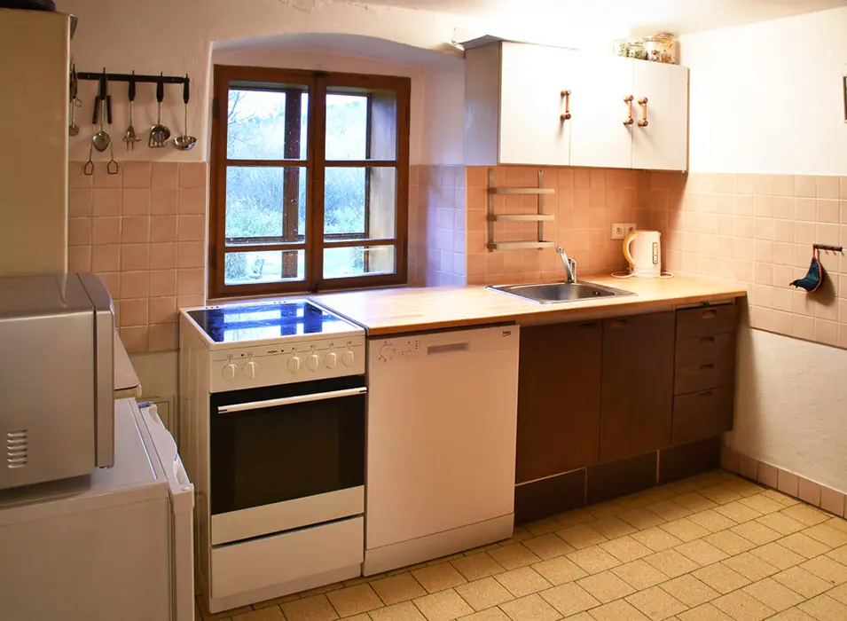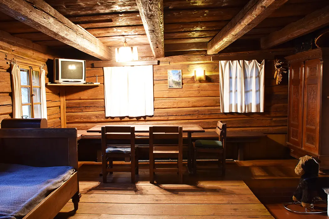 Nově zrekonstruovaná 200 let stará chalupa. V přízemí vstupní chodba, velká stylová jídelna s kachlovými kamny - stoly, židle, skleník se stolním nádobím spojená s krbovou místností. Kuchyně - el. sporák s troubou, myčka na nádobí, lednice, mikrovlnka, varná konvice, základní nádobí. Z chodby je přístup do dřevníku a do sklepa. 6 ložnic - v přízemí 1x2, v patře - 1x3, 2x5, v podkroví - 2x2 lůžka. K dispozici dětská postýlka. Sociální zařízení - 2x koupelna, 2x WC ( jedno v koupelně + samostatné WC ). Vytápění - ústřední s plynovým kotlem + tuhá paliva