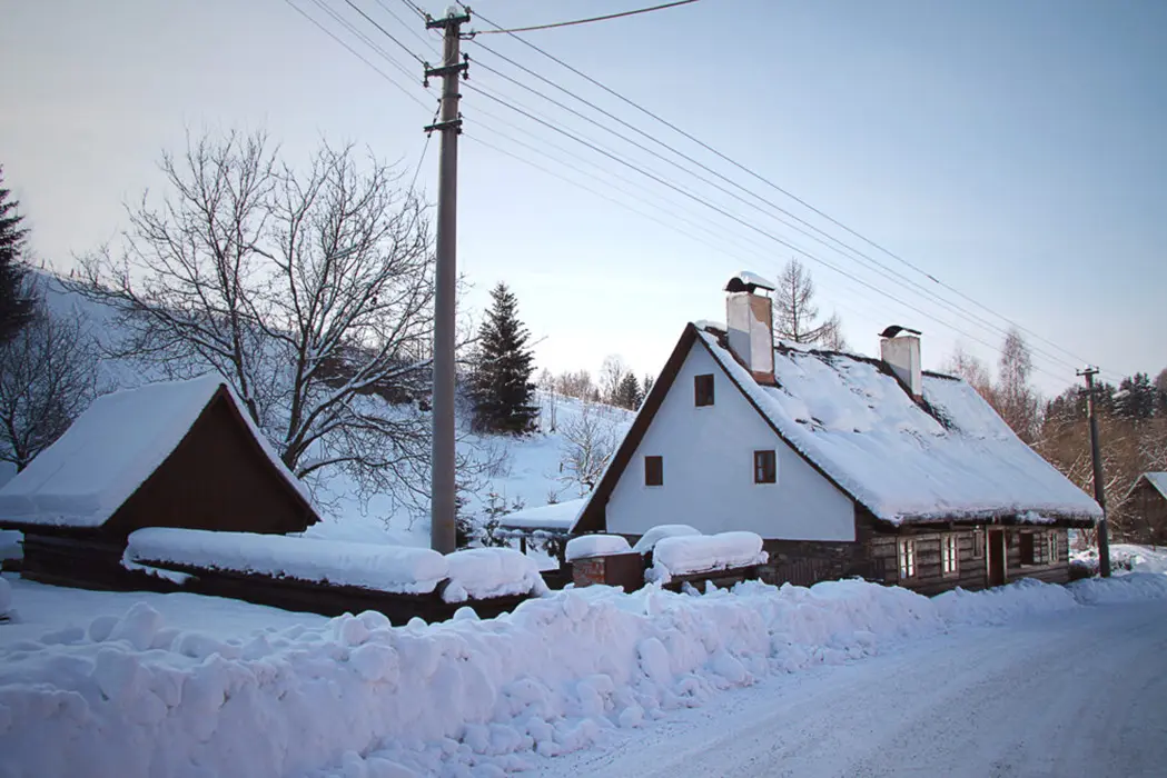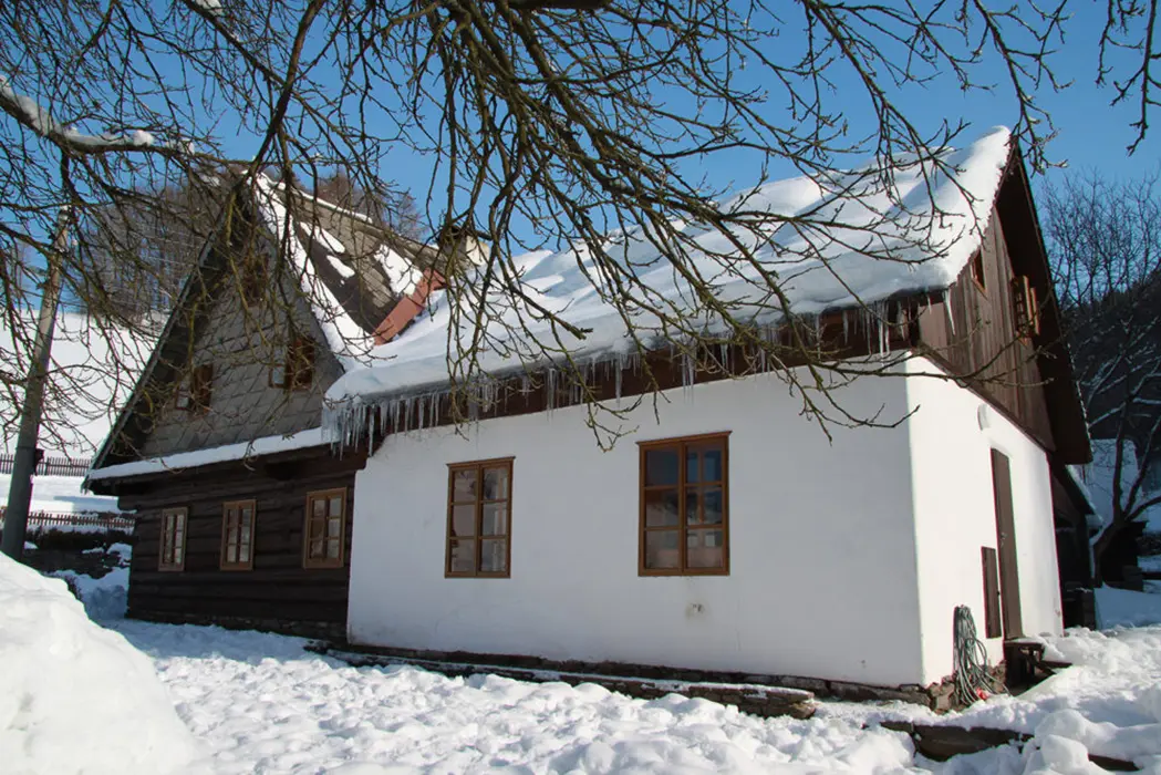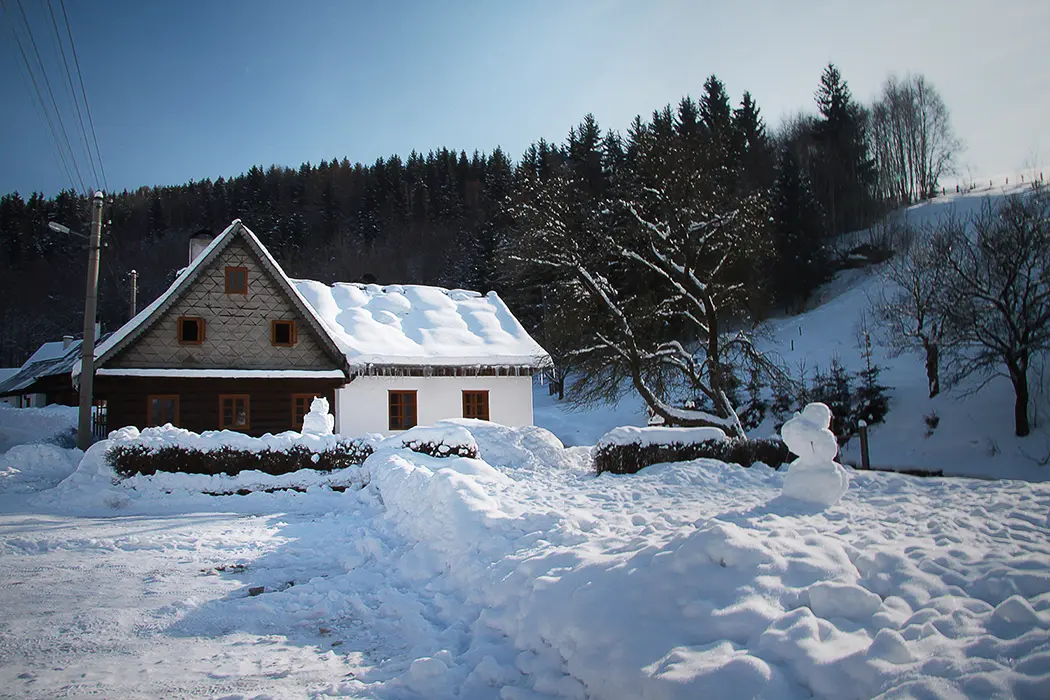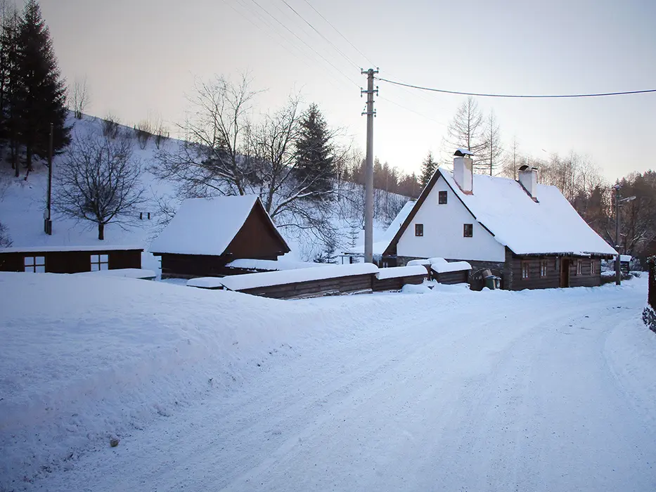 Přímo u chalupy na vlastním pozemku, v zimě doporučujeme sněhové řetězy