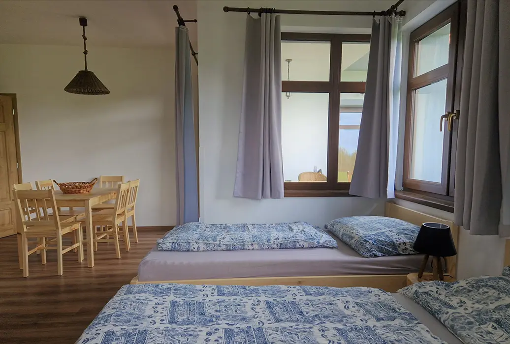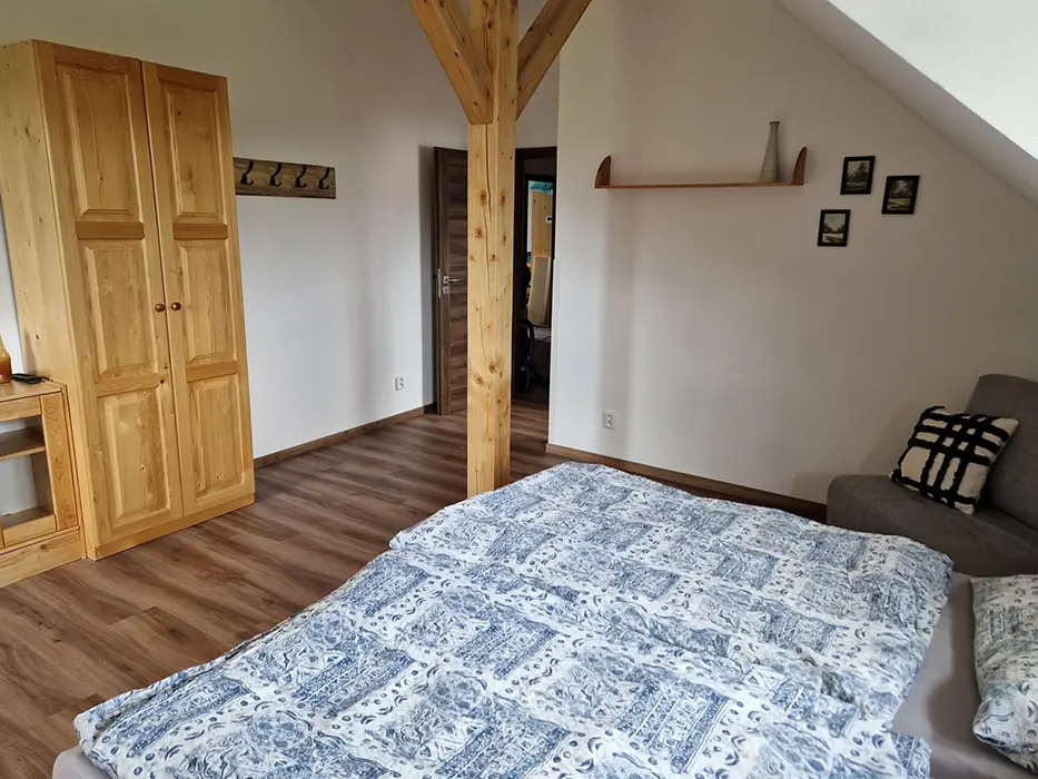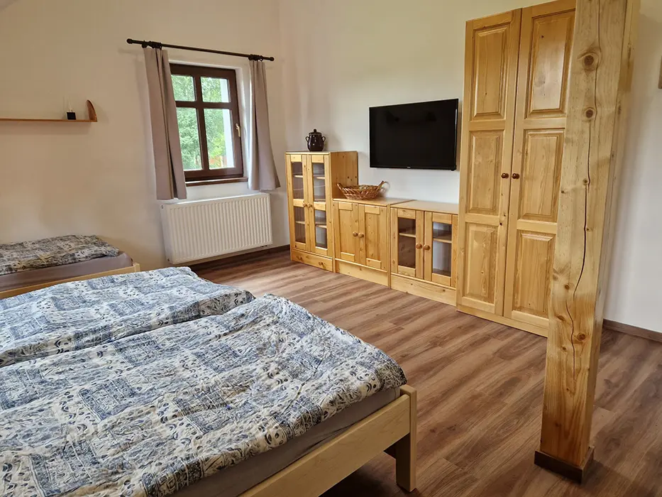 19 km Jindřichův Hradec, 9 km Kamenice nad Lipou, v obci Nový Bozděchov, v domě trvale bydlí majitel, pronajímá se část s vlastním vchodem, soukromí hostů je zaručeno