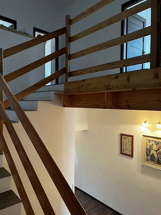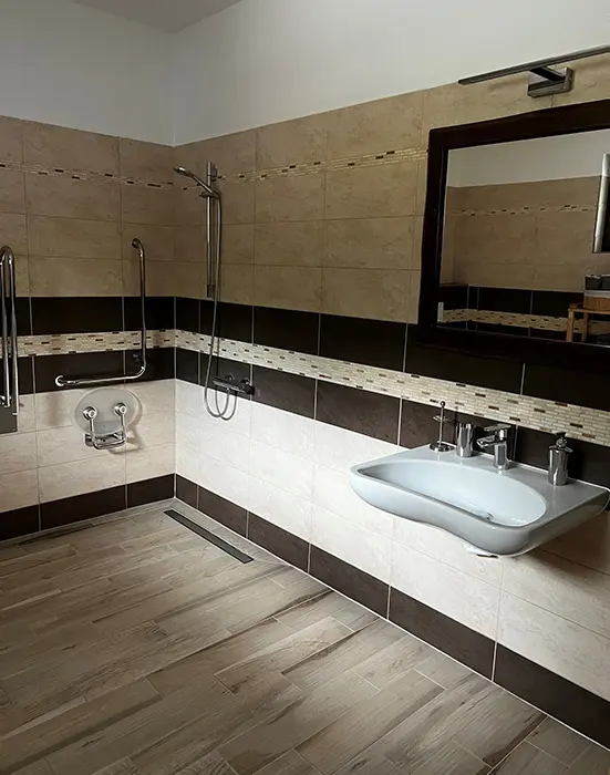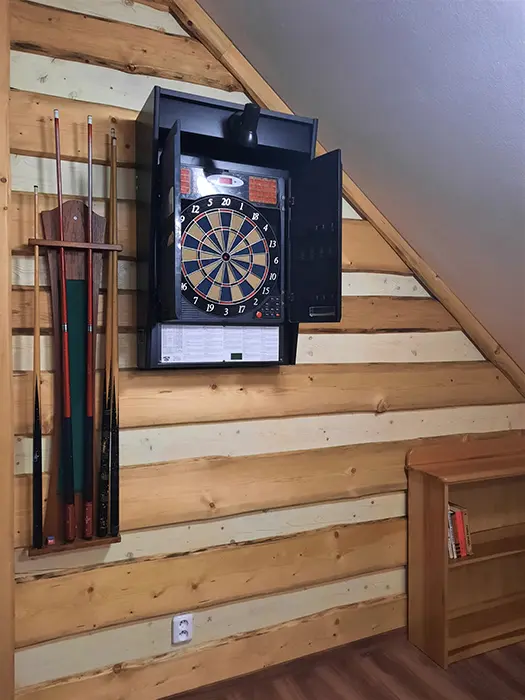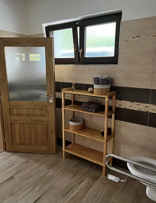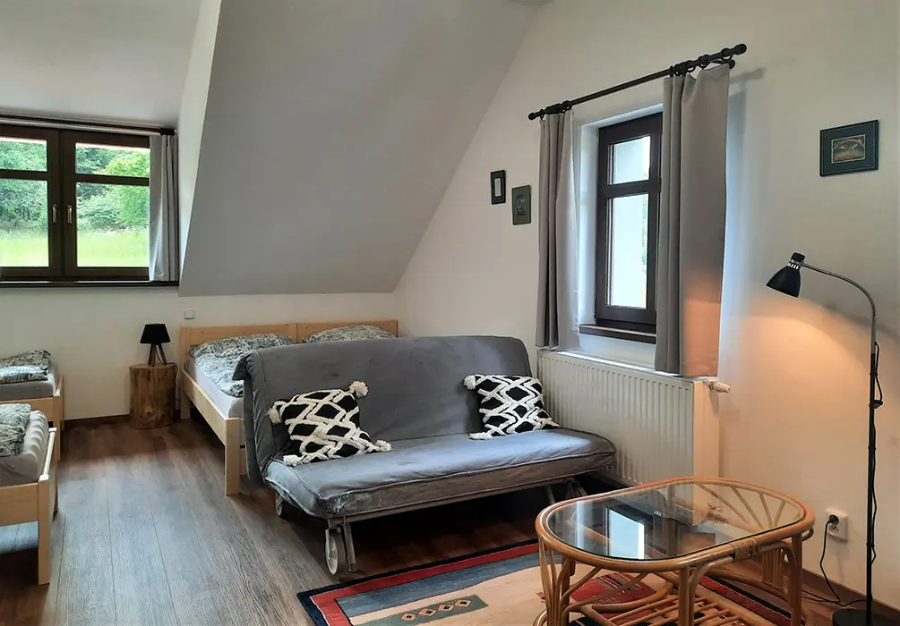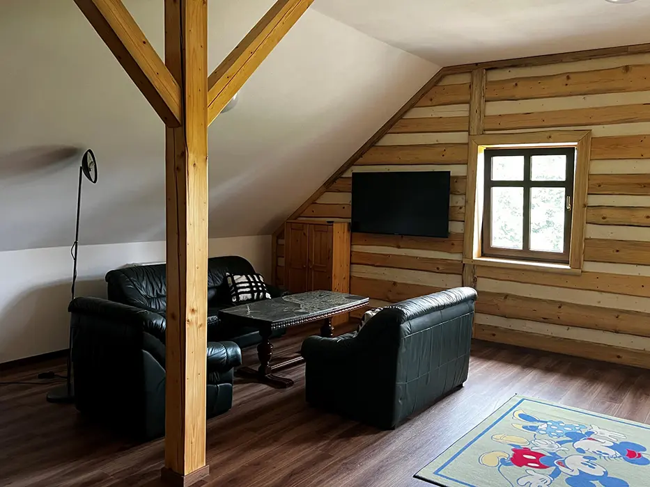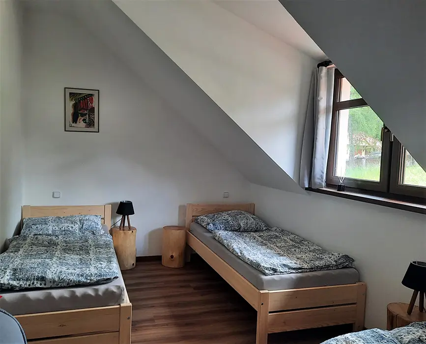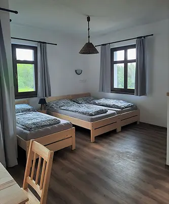 V přízemí: bezbariérový přístup - obytná část s posezením, TV, rozkládací gauč - 2 přistýlky spojená s kuchyní - jídelní stůl, el. trouba, varná deska, myčka, lednice, varná konvice, nádobí, 3 lůžka. Soc. zařízení - koupelna se sprchou, WC. V patře: společenská místnost se sedací soupravou, TV, šipky, stolní fotbal, kulečník, kuchyně - jídelní stoly, el. trouba, varná deska, lednice, varná konvice, nádobí. 3 ložnice - 1x3+ přistýlka, 1x3+ přistýlka, 1x4 lůžka, v každé TV + soc. zařízení - sprcha + WC. Topení - centrální