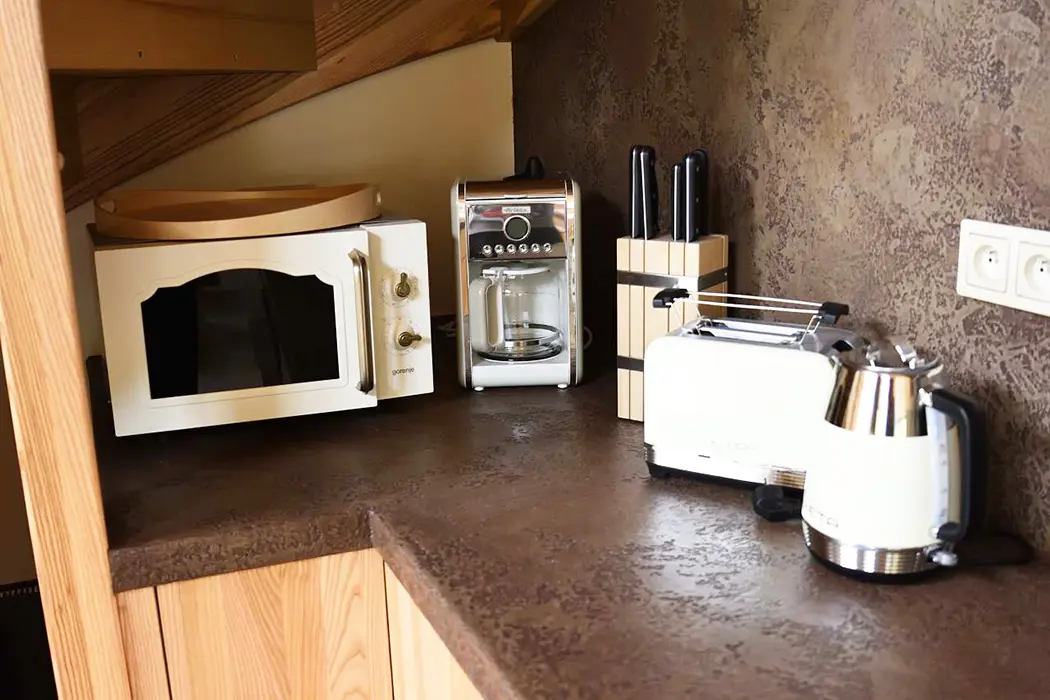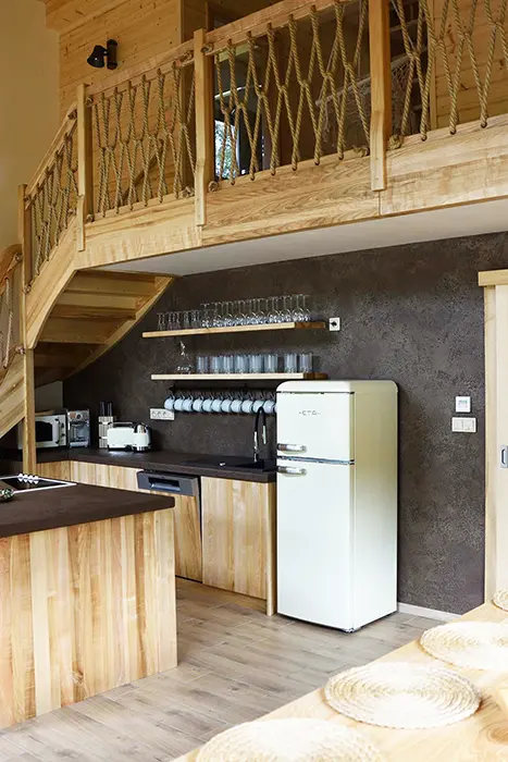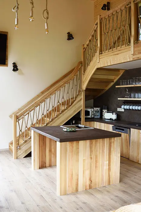 V přízemí - prostorná obytná část s posezením, krbová kamna, veliký jídelní stůl a židle - spojená s kuchyní - el. trouba, keramická varná deska, mikrovlnka, varná konvice, lednice, myčka, nádobí. V patře 5 ložnic - 5x2 lůžka. Soc. zařízení - 3x koupelny se sprchou, umyvadlem, 3x WC. Topení - krbová kamna, el. podlahové