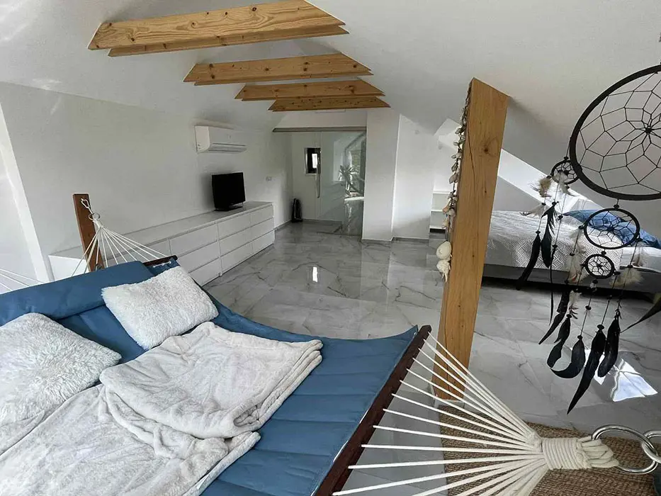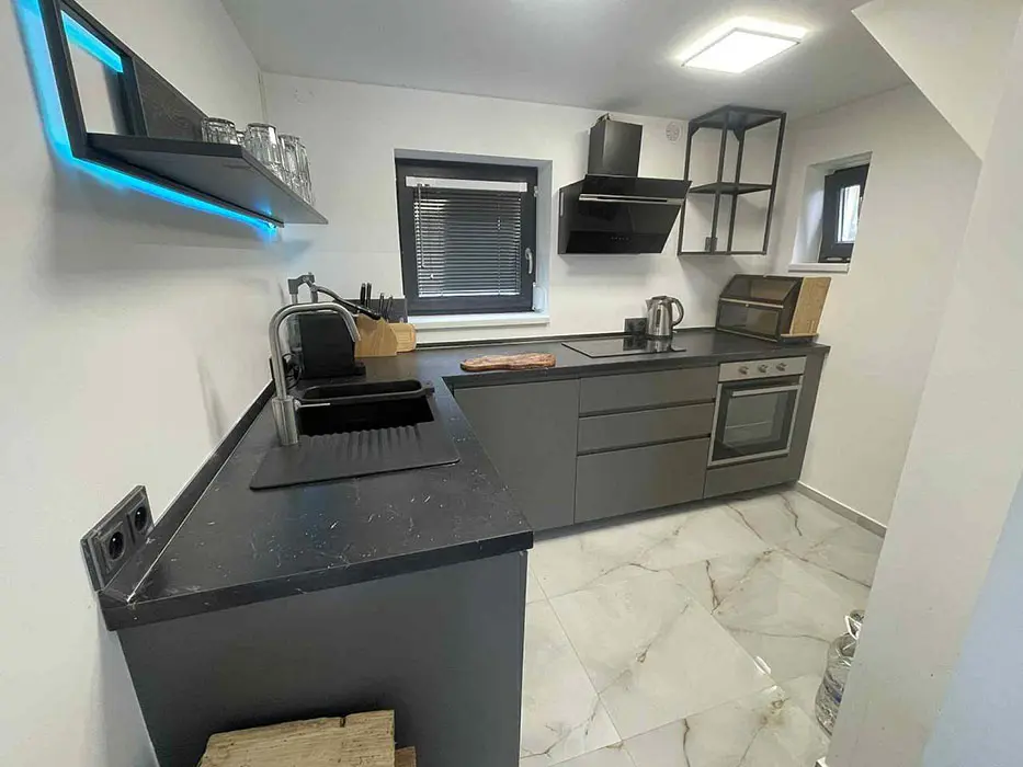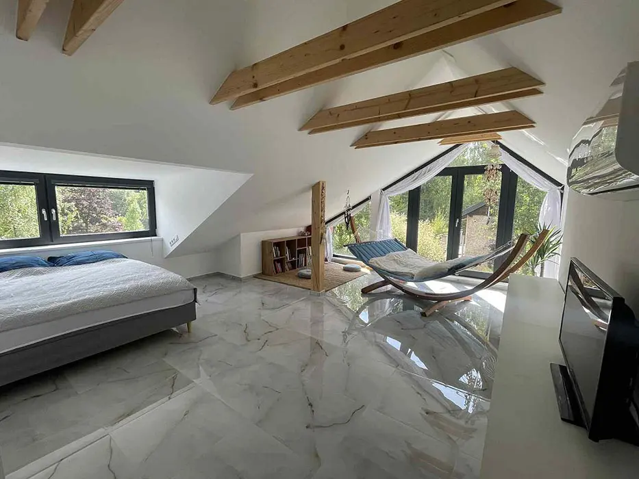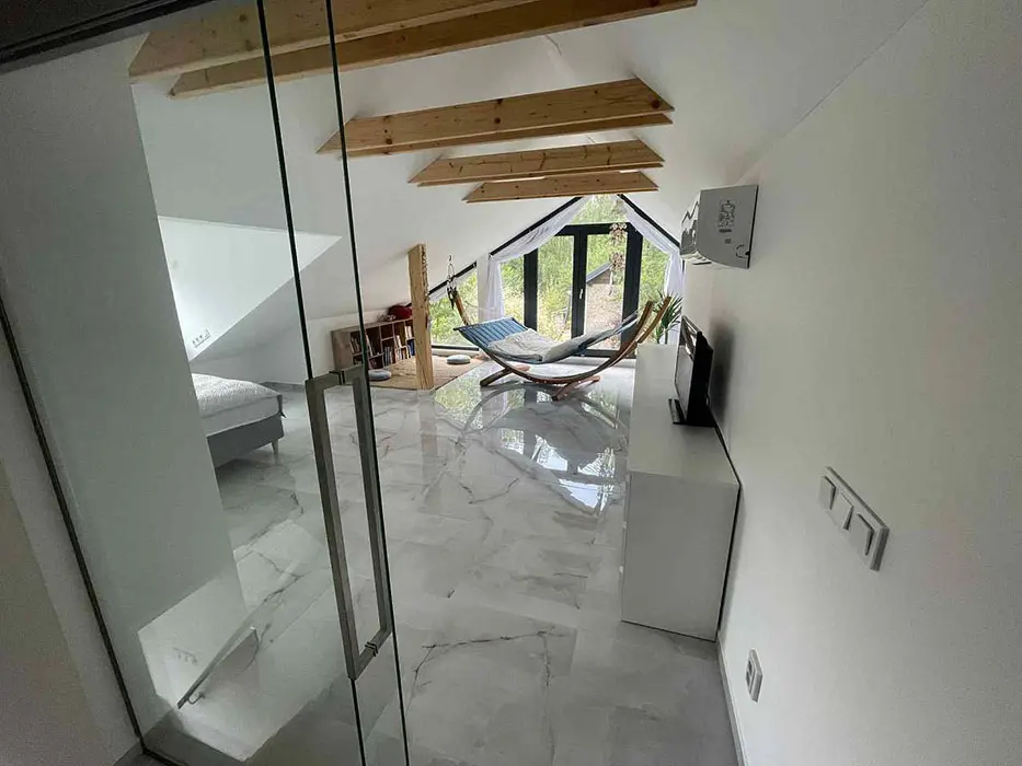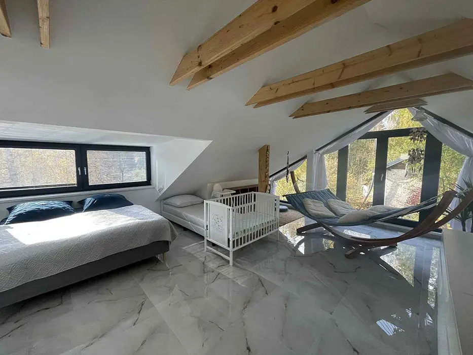 V přízemí - obývací pokoj s posezením - po rozložení - možnost 2 lůžek, LCDTV, krbová kamna, velká americká lednice, kuchyňský kout - el. varná deska + trouba, mikrovlnka, varná konvice, kávovar, nádobí. V patře 1 ložnice - 1x2 lůžka + na matraci - 1 přistýlka, dětská postýlka. Soc. zařízení - v přízemí koupelna se sprchovým koutem, umyvadlo, WC v koupelně. Topení - elektrokotel - podlahové topení, krbová kamna, tepelné čerpadlo - klimatizace