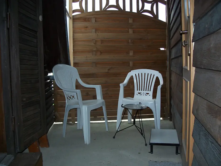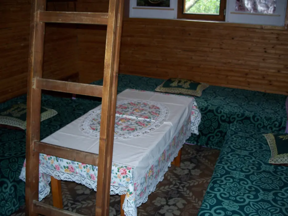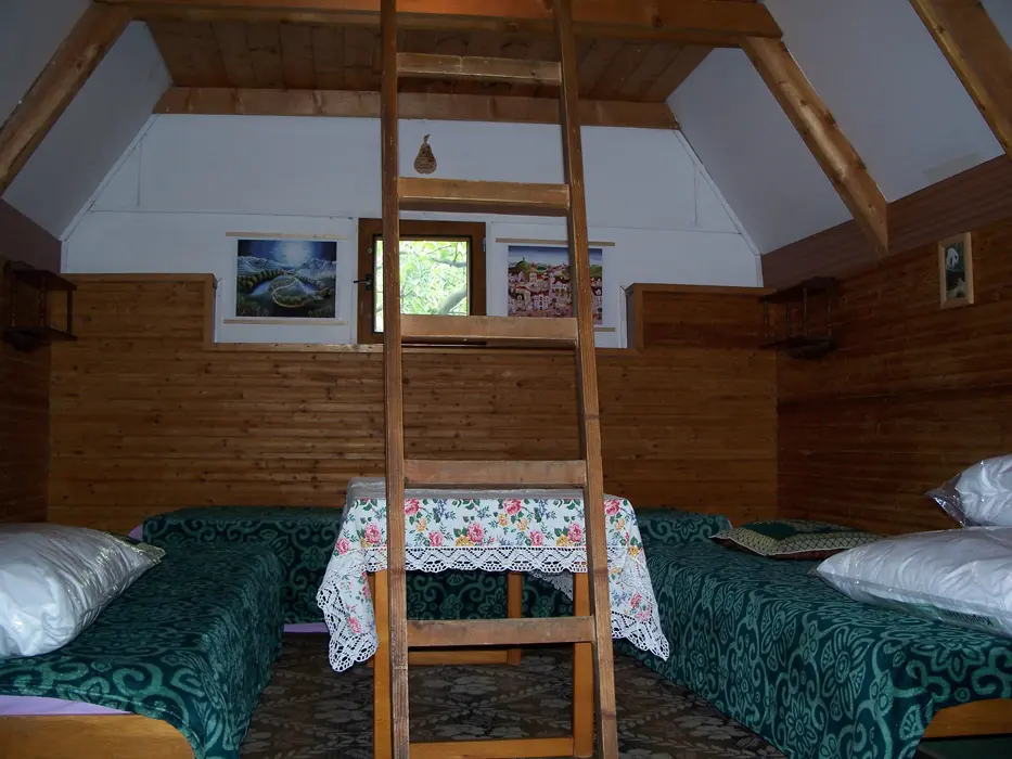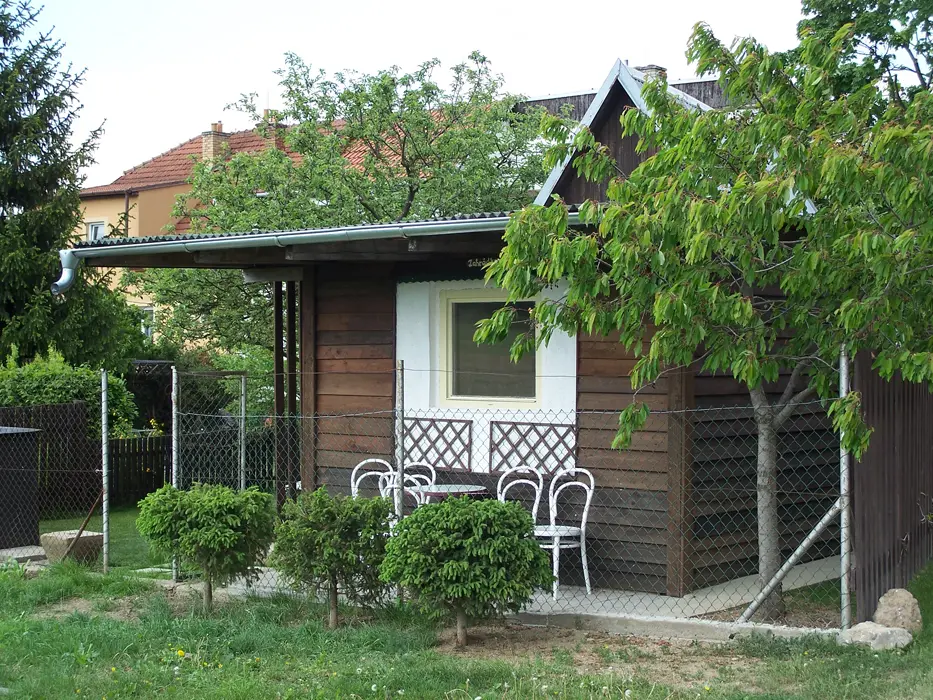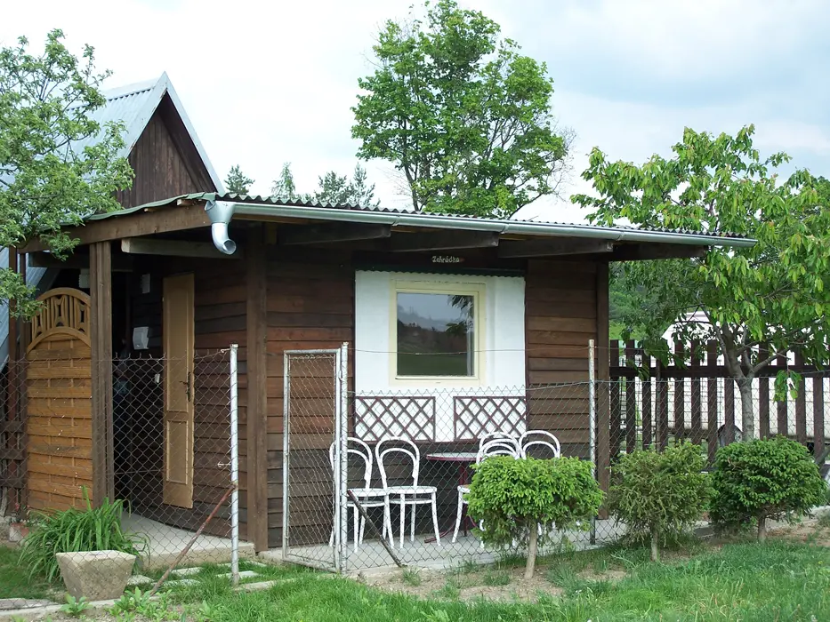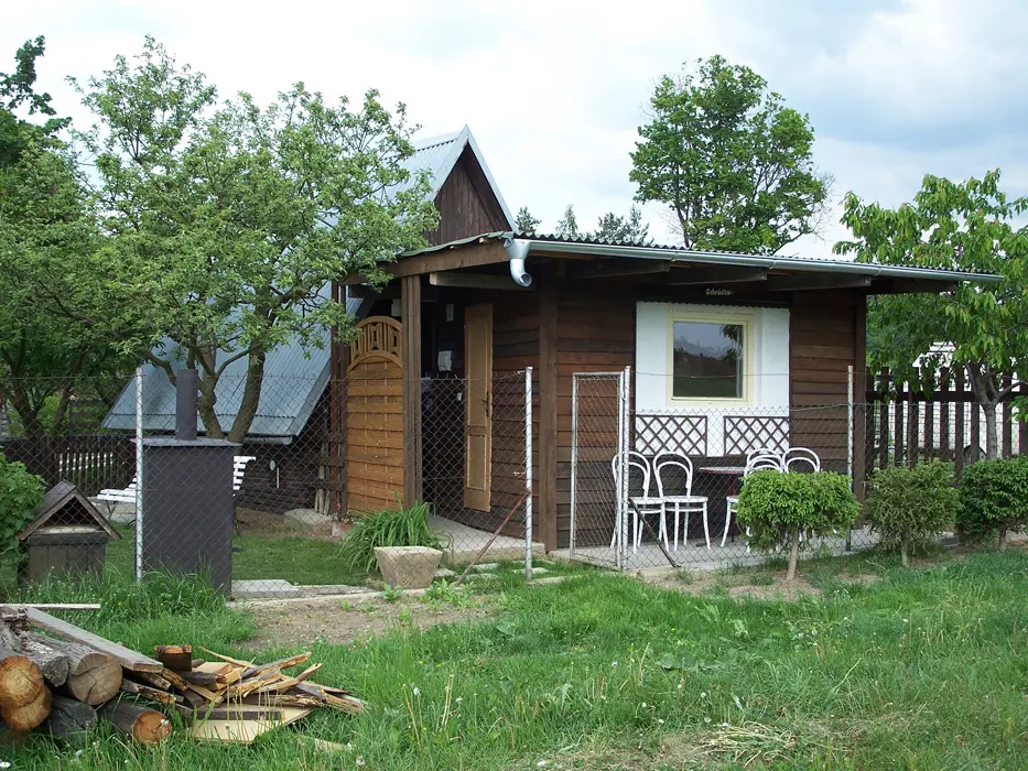 Malá chatka na zahradě majitele - samostatná kuchyňka - el. vařič, varná konvice, teplá a studená voda, nádobí, lednice, na požádání u majitele mikrovlnka, rohová lavice a jídelní stůl. 1 ložnice - stolek, TV, 3 samostatná lůžka v přízemí, po žebříku do špice chaty 2 lůžka vedle sebe. Koupelna se sprchou, umyvadlem a WC. Malá chodbička s posezením. Topení - el. přímotopy.