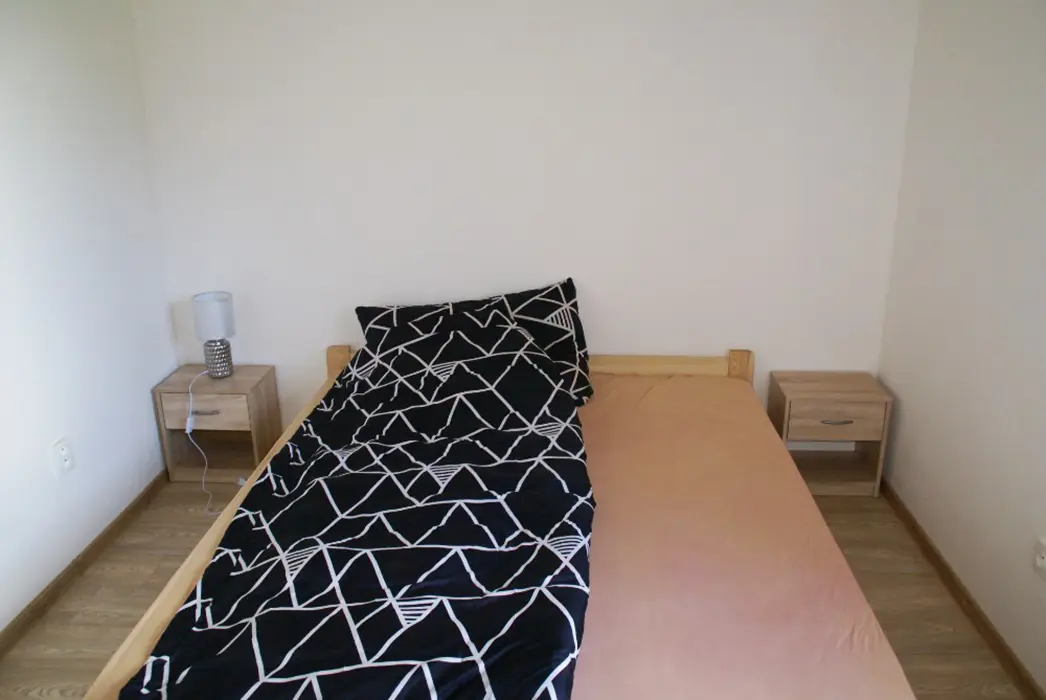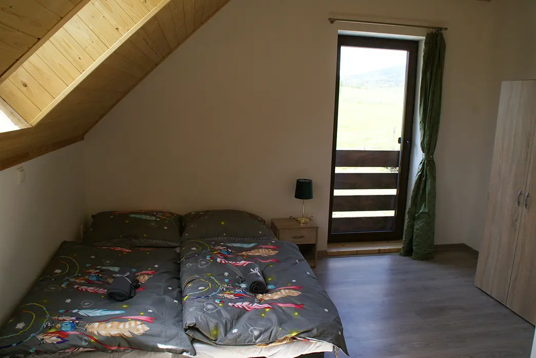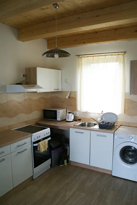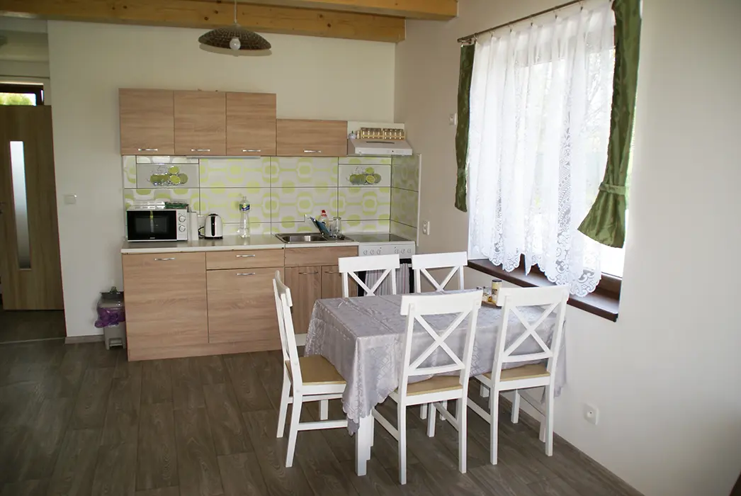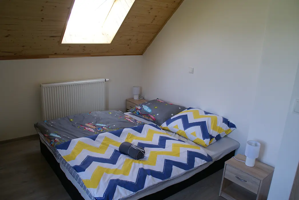 MEZONET v patře: obývací pokoj s posezením, rozkládací gauč - možnost 1 přistýlky krbová kamna, TV, vybavená kuchyně. 2 ložnice 1x2, 1x4 lůžka. Soc. zařízení - koupelna se sprchou, umyvadlo, WC, autom. pračka. Topení - podlahové + el. přímotopy