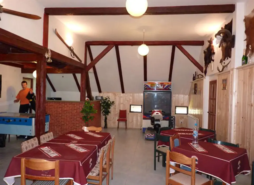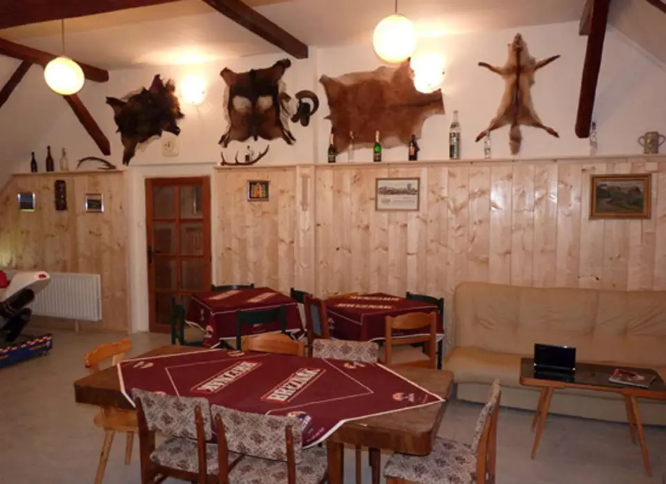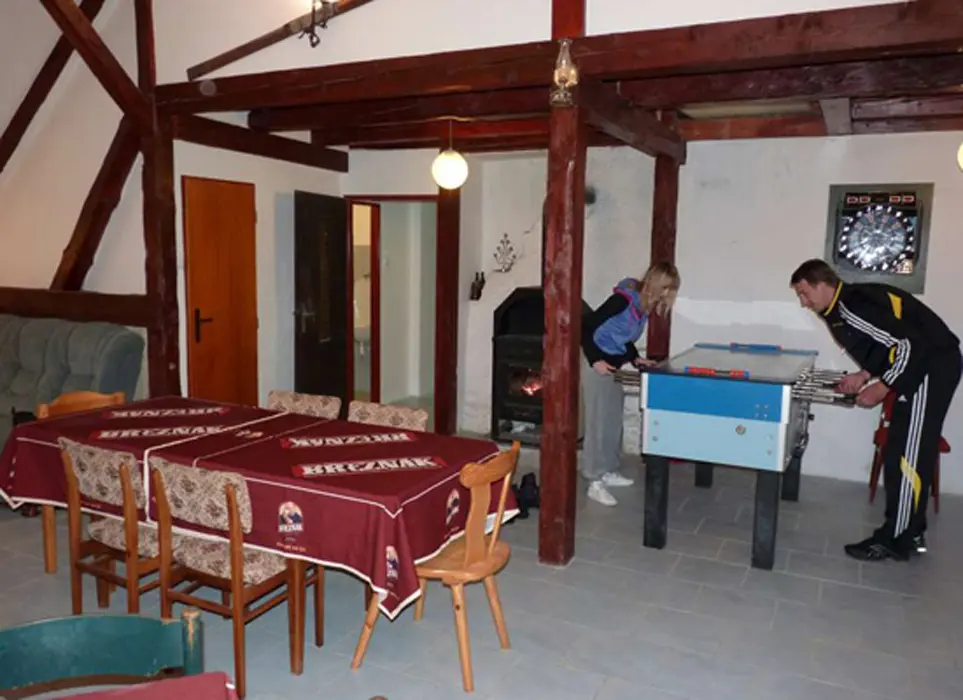 V 1. patře - společenská místnost - bar, elektronické šipky, stolní fotbal, možnost zapůjčení pípy, internetová přípojka, satelitní příjem na TV a DVD přehrávač, BTV. Kuchyňka - varná konvice, mikrovlnka, sporák s troubou, základní nádobí. 2 ložnice 2x4 lůžka. Soc. zařízení.