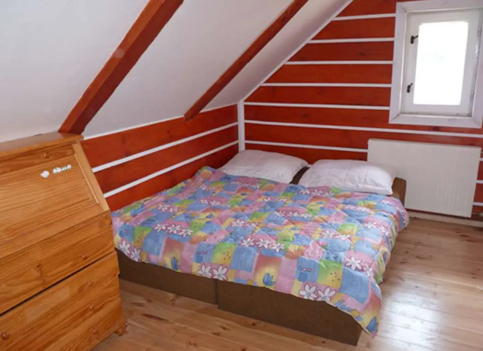 V 1. patře apartmán pro 8 osob - 4 ložnice 4x2 lůžka. Obývací místnost s kuchyňským koutem vybaveným sporákem, mikrovlnkou, lednicí, rychlovarnou konvicí a základním nádobím, 2x WC a 2x sprchový kout