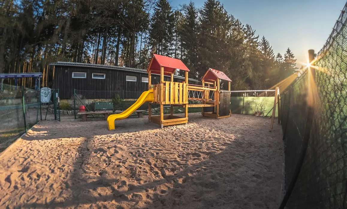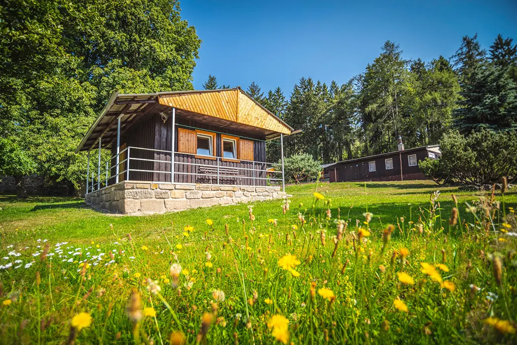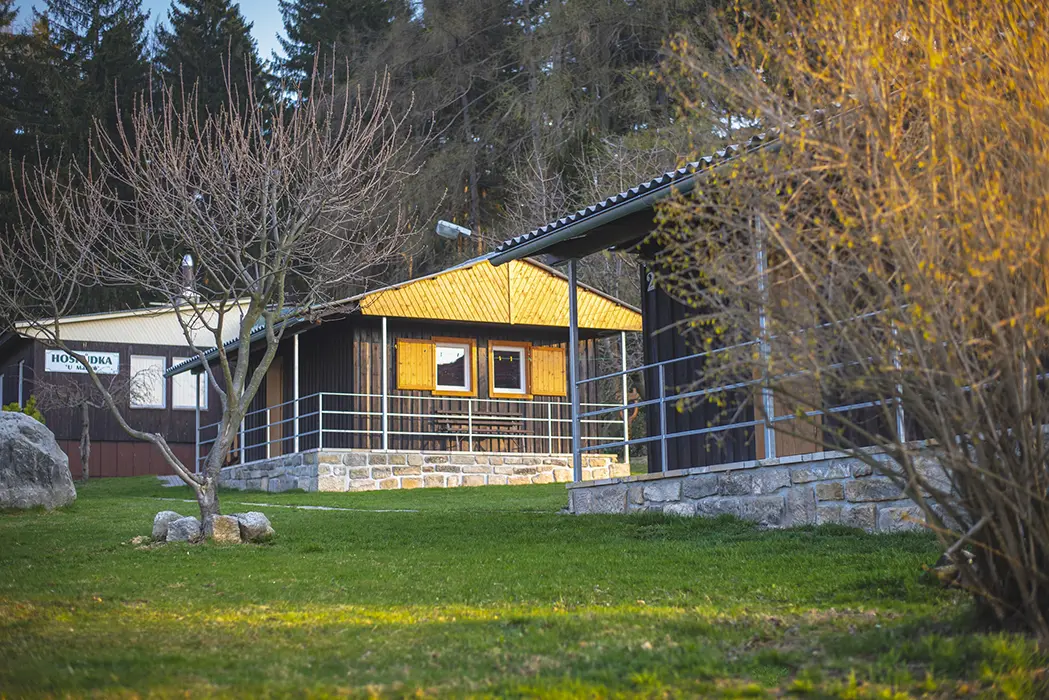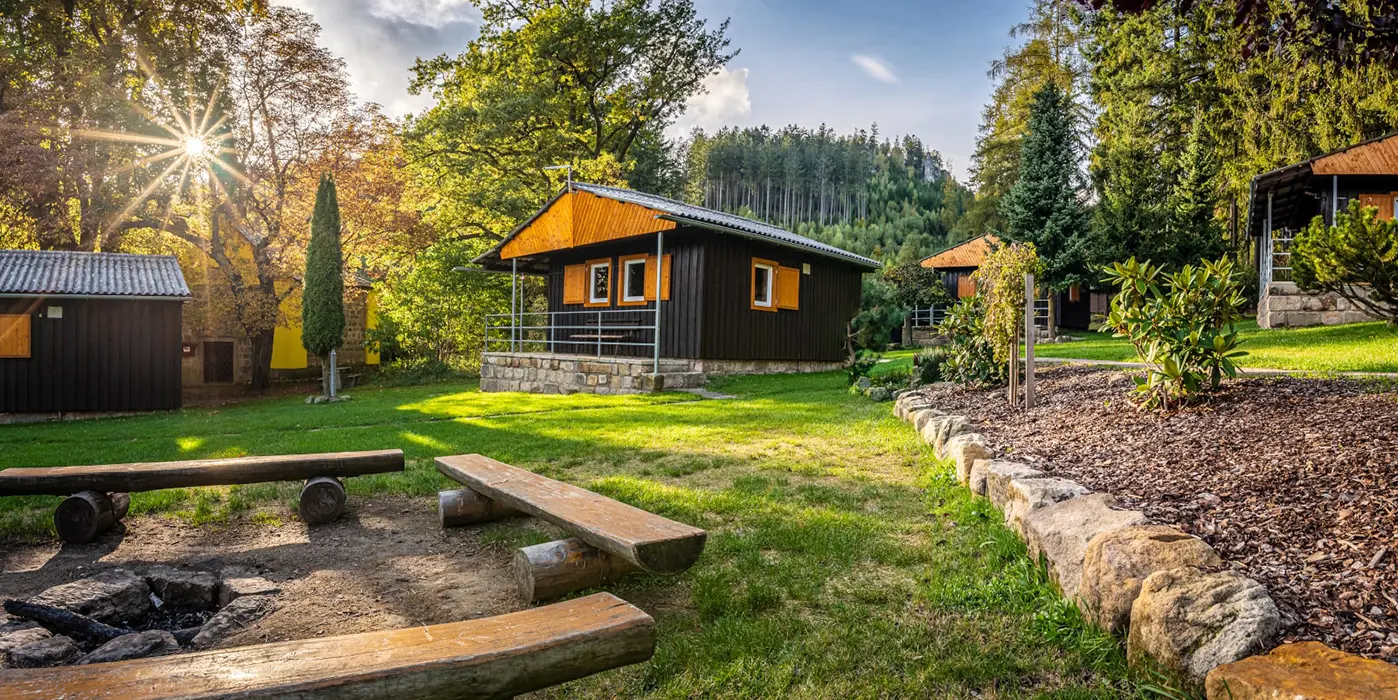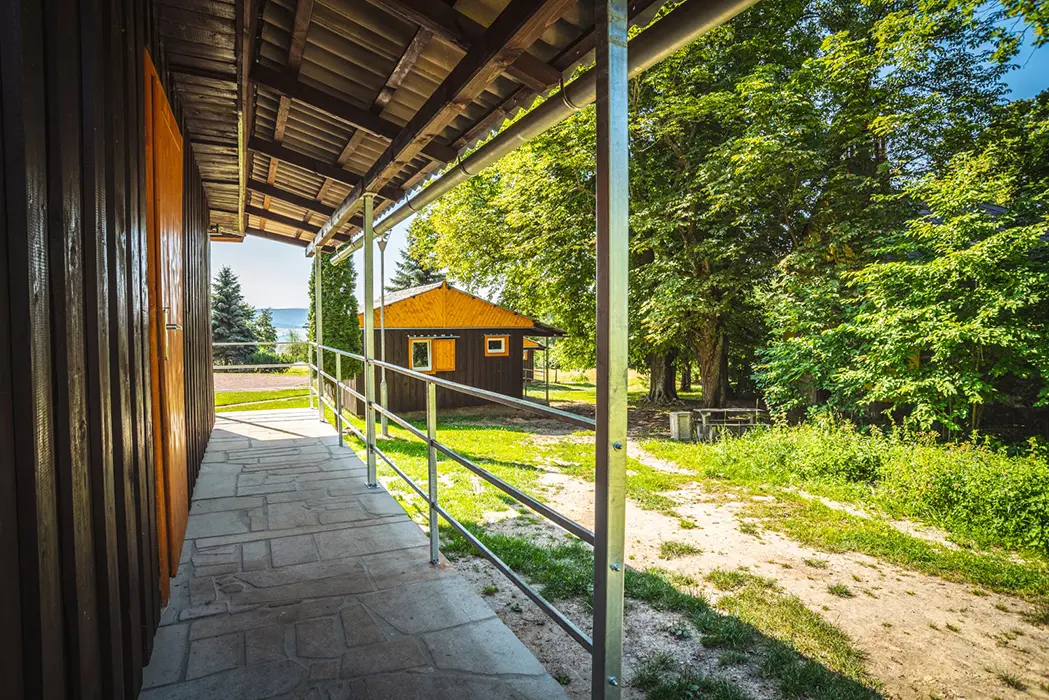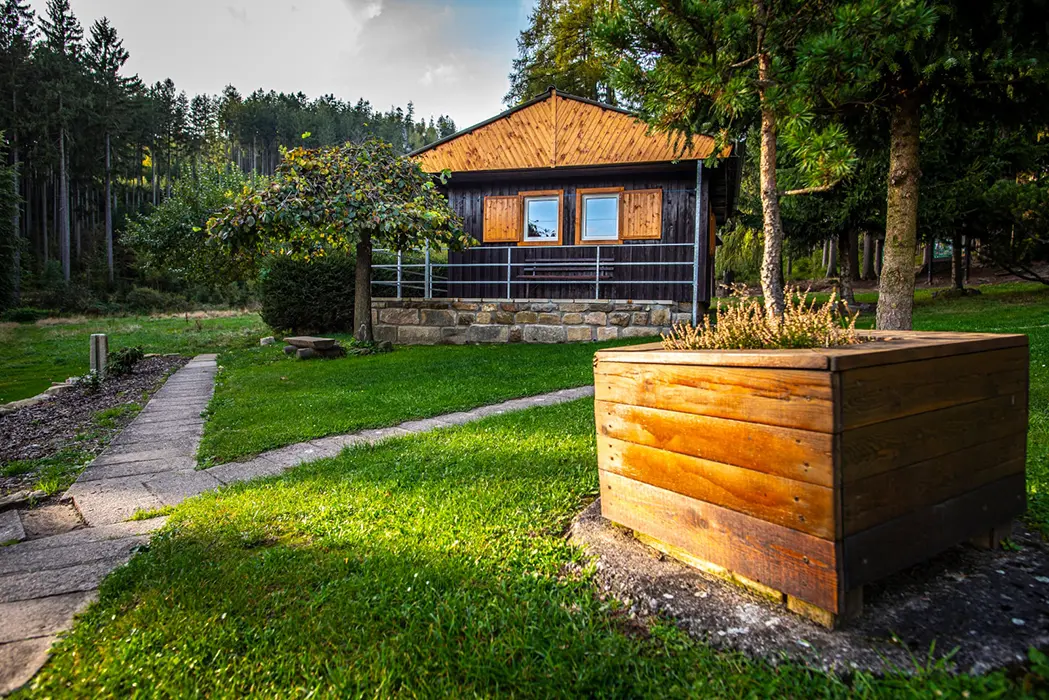 Každá chatka má zastřešenou terasu s lavičkou, v areálu je 9 chatek - každá pro 6 osob, hřiště pro míčové hry (volejbal, nohejbal), dětský park - prolézačky, nekuřácká restaurace a kiosek s letní terasou s nabídkou české kuchyně a točeným pivem