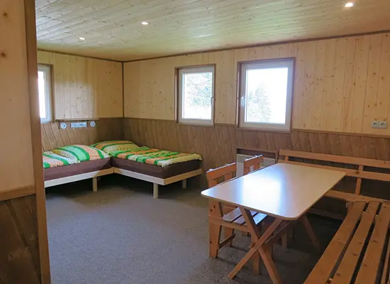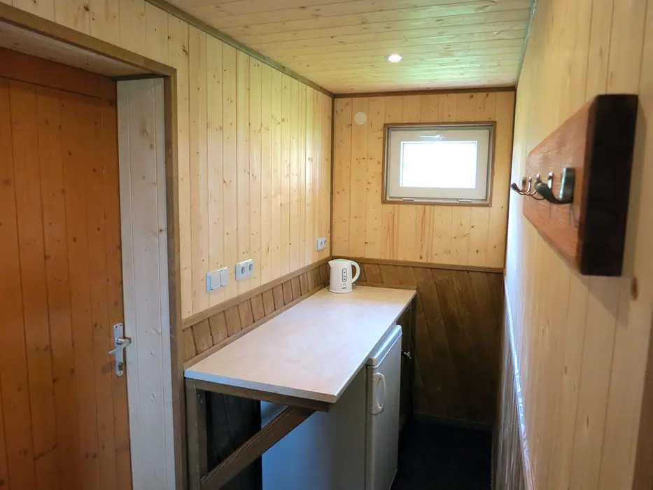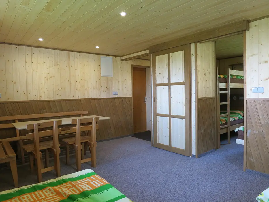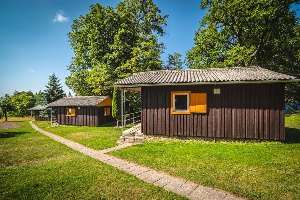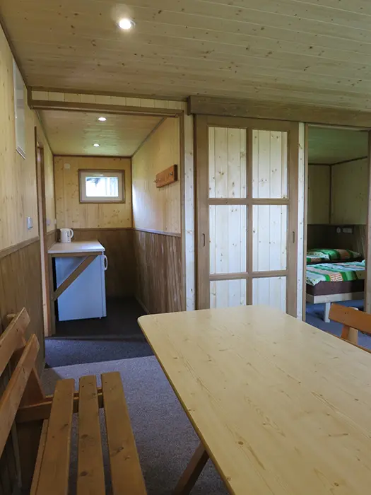 9 stejně vybavených chatek - každá pro 6 osob. Vstupní chodbička - malá lednička, varná konvice, základní nádobí ( v chatkách není možnost vaření ), v jedné místnosti - stůl a židle, 6 lůžek - 2 postele, za zasunovacími dveřmi - 2 lůžka + palanda. Soc. zařízení - společné - cca do 50 m od chatek. Topení - el. přímotopy ( za poplatek 250 Kč/den )
